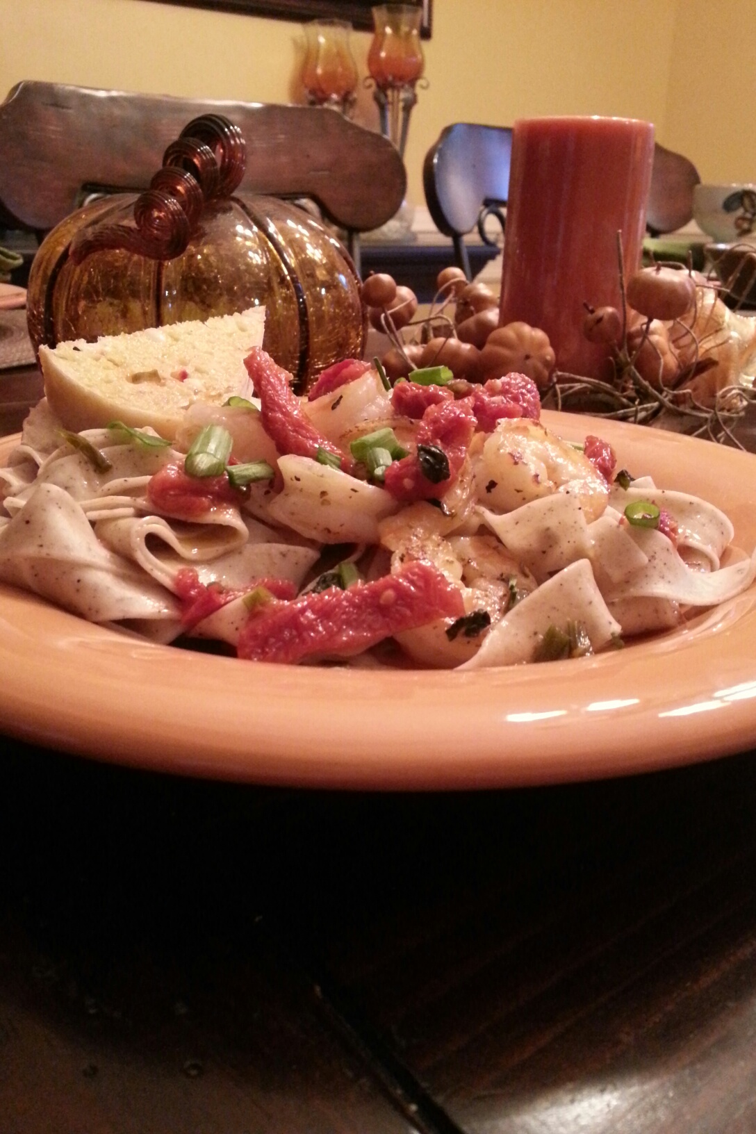 My initial though was noodle soup. Wide egg noodles flaked with pepper, with the remainder of last week’s herb roasted chicken? I think YES! But… then I heard the whisper. Shrimp. At first, it was a tiny, faint little voice. But as it spoke, it grew in self definition of what it truly wanted….no….needed, to be. Shrimp, with fresh mushrooms, sun dried tomatoes, and green onion in a white wine, lemon juice and butter sauce with fresh garlic. And so it became, and so it was done. And it was…spectacular.