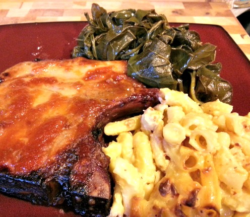 BONUS! How about Smoked Gouda Pimento Cheese with Bacon Baked Macaroni & Cheese! This was served with Fresh Collard Greens and BBQ Pork Chops for Sunday dinner as shown above. (Complete recipe for the mac n cheese below)