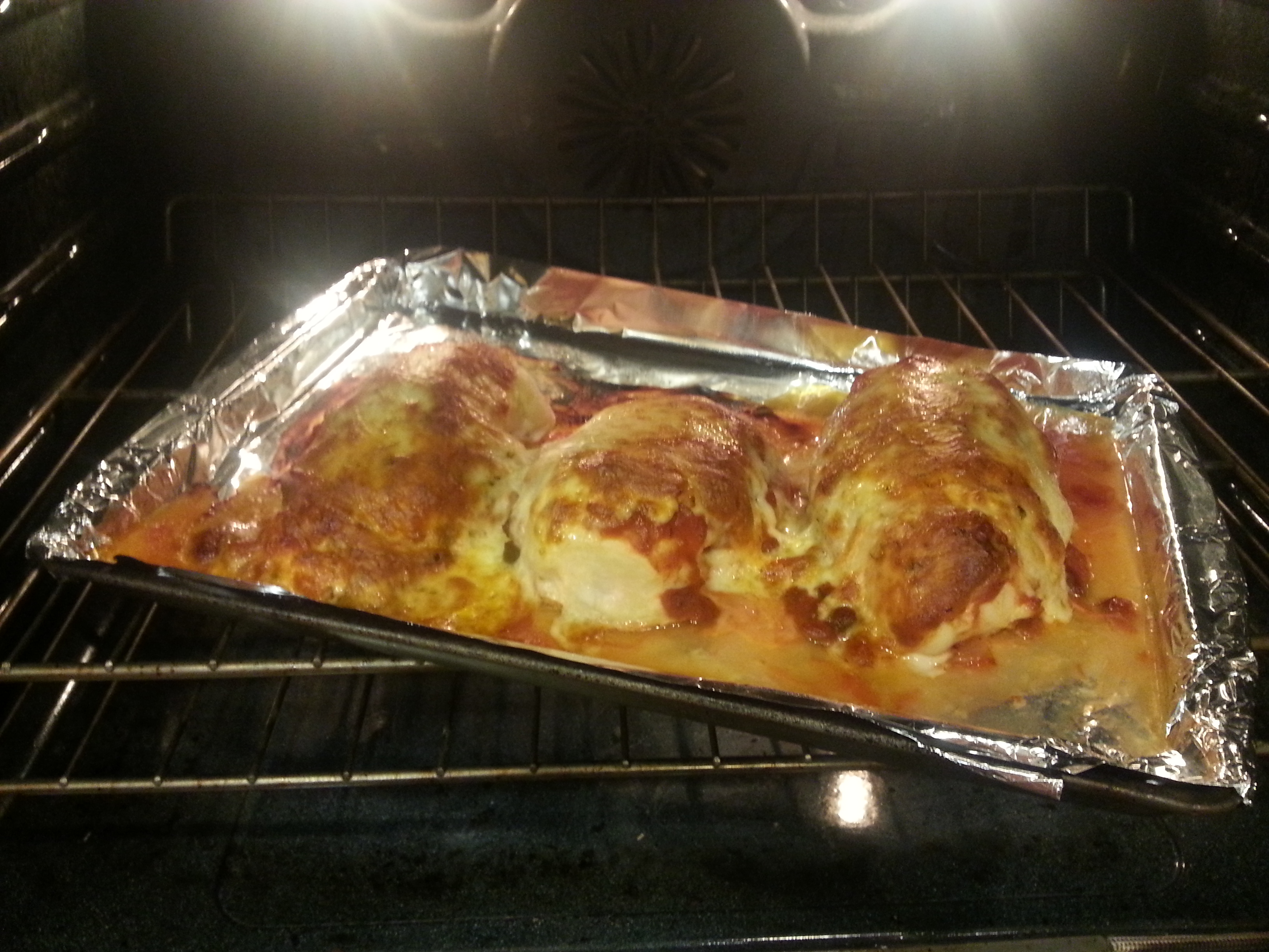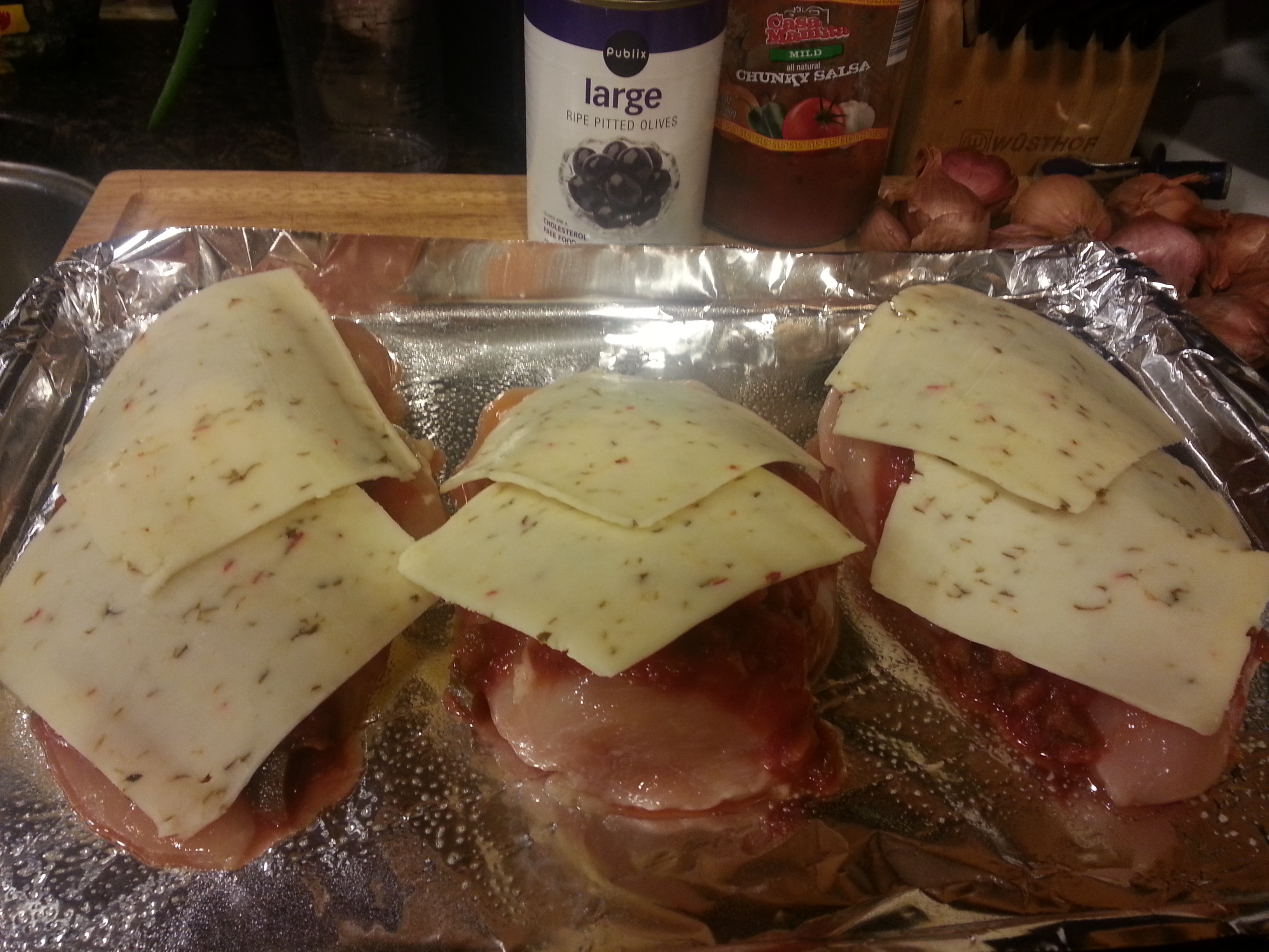 Place chicken breasts on a foil lined baking sheet. Cover each with salsa. Top each with three slices of cheese. Bake at 375 for about 30 minutes or until cheese is browned and chicken is cooked throughout. Top with sliced olives if desired.