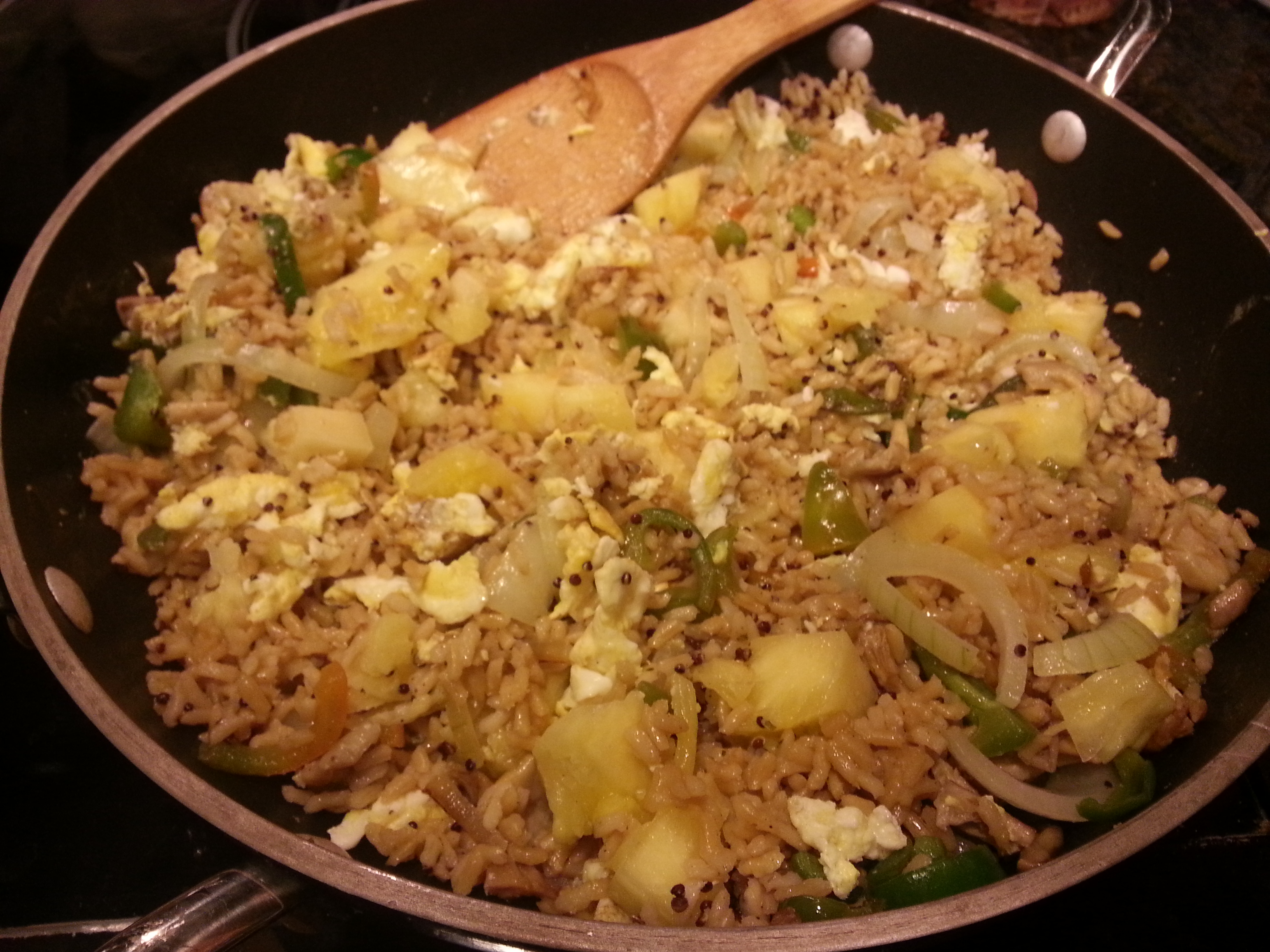 Place all veggies and pineapple in a large frying pan or wok. Stir fry with olive oil until veggies are crisp tender and move to the side of the pan. Add another drizzle of oil to the pan and crack eggs. Fry eggs until done and mix into veggies. Add prepared rice to the mixture and toss until blended. In a small bowl, whisk soy sauce, sugar, curry powder and chicken stock, and add to the veggie and rice mixture. Toss to coat. Stir fry until liquid is absorbed.