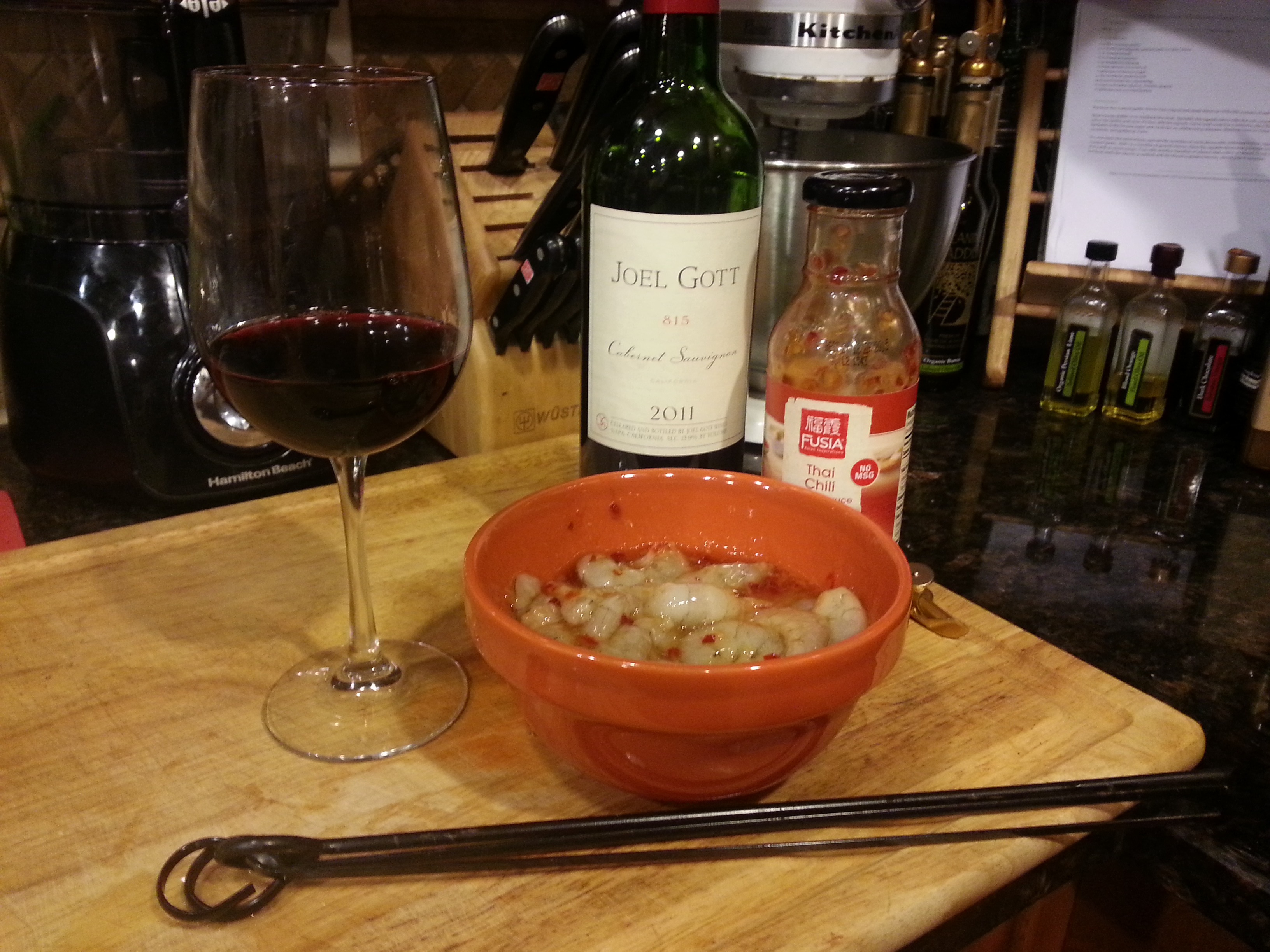 Put chili sauce in a bowl with shrimp and toss to coat. Place sauced shrimp on a skewer and bake at 375 until shrimp are pink in color. Do not overcook the shrimp. When they are pink, they are done. Yes, that quick. 🙂 Serve shrimp over rice and top with chopped cashews if desired.