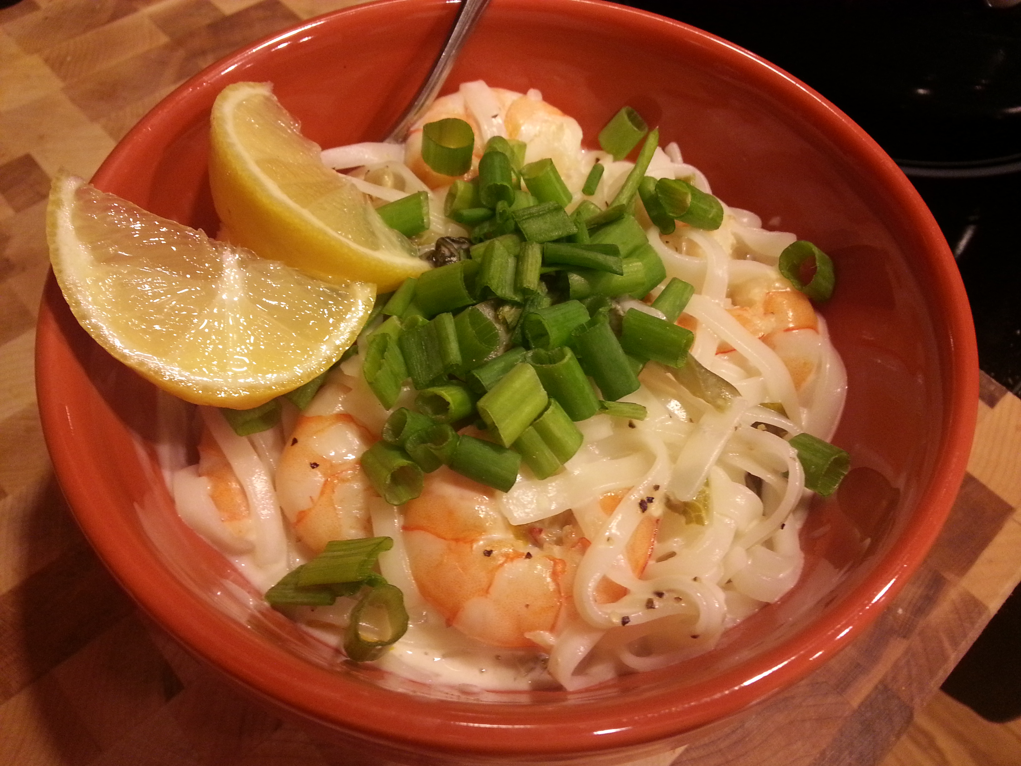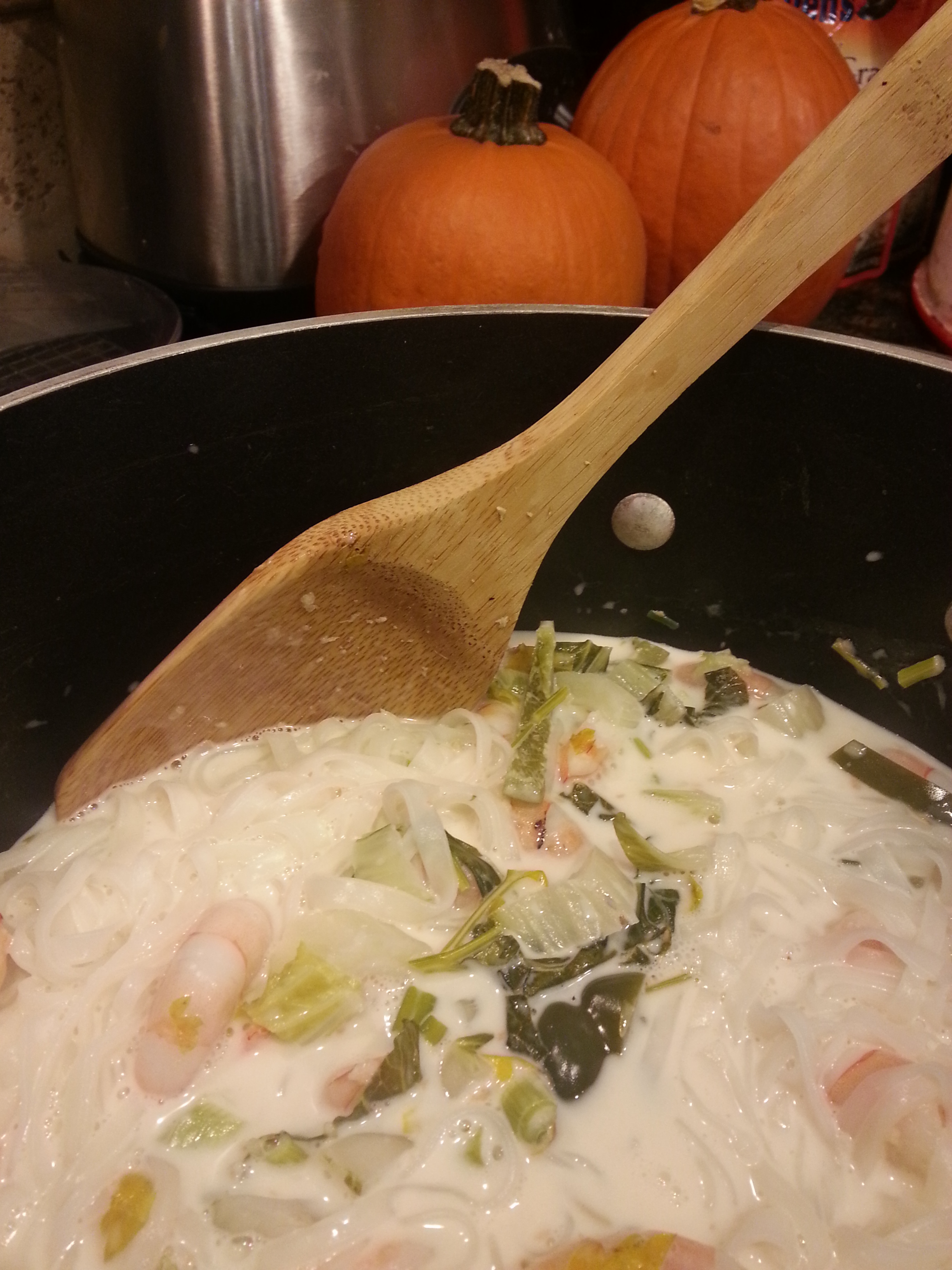 Add olive oil, ginger, garlic, celery, red pepper flakes and jalapeno to a skillet. Saute’ until celery and pepper are crisp tender. Add shrimp and saute’ until pink. Set aside.