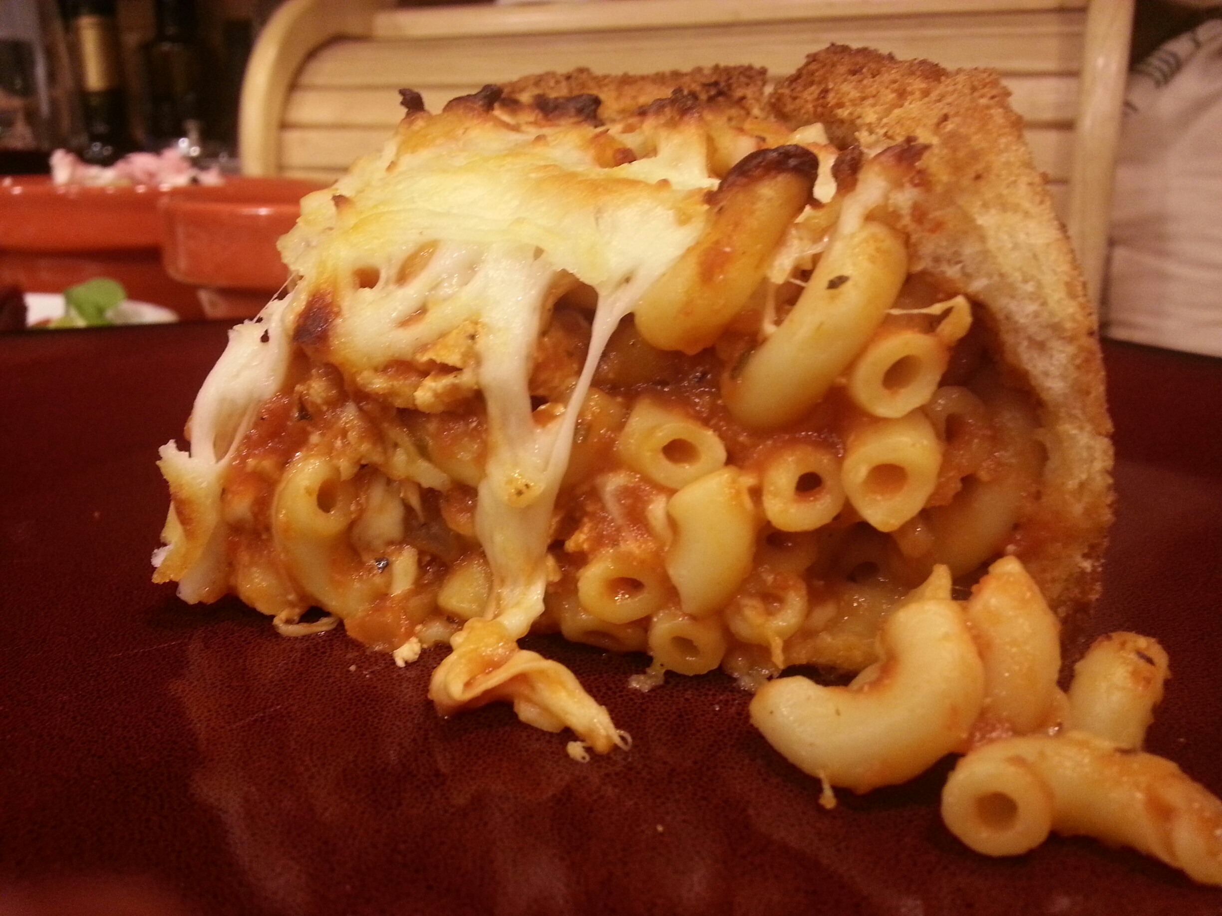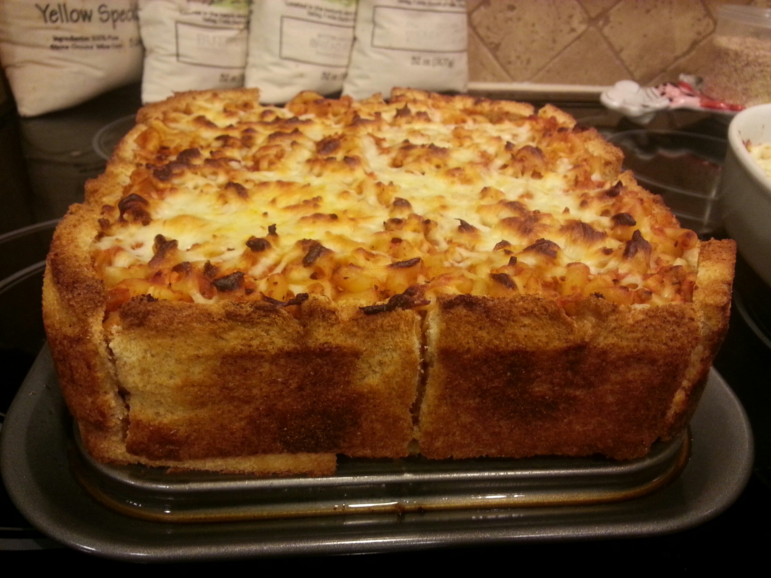 Grease the sides of a spring form pan. Brush slices of bread with melted butter and sprinkle with garlic powder. Place on the bottom and sides of the spring form cutting bread as needed to form a nice, well covered fit. Pour noodle mixture into bread bowl, top with reserved cheese and and bake at 400 until cheese has melted and the top is golden brown.