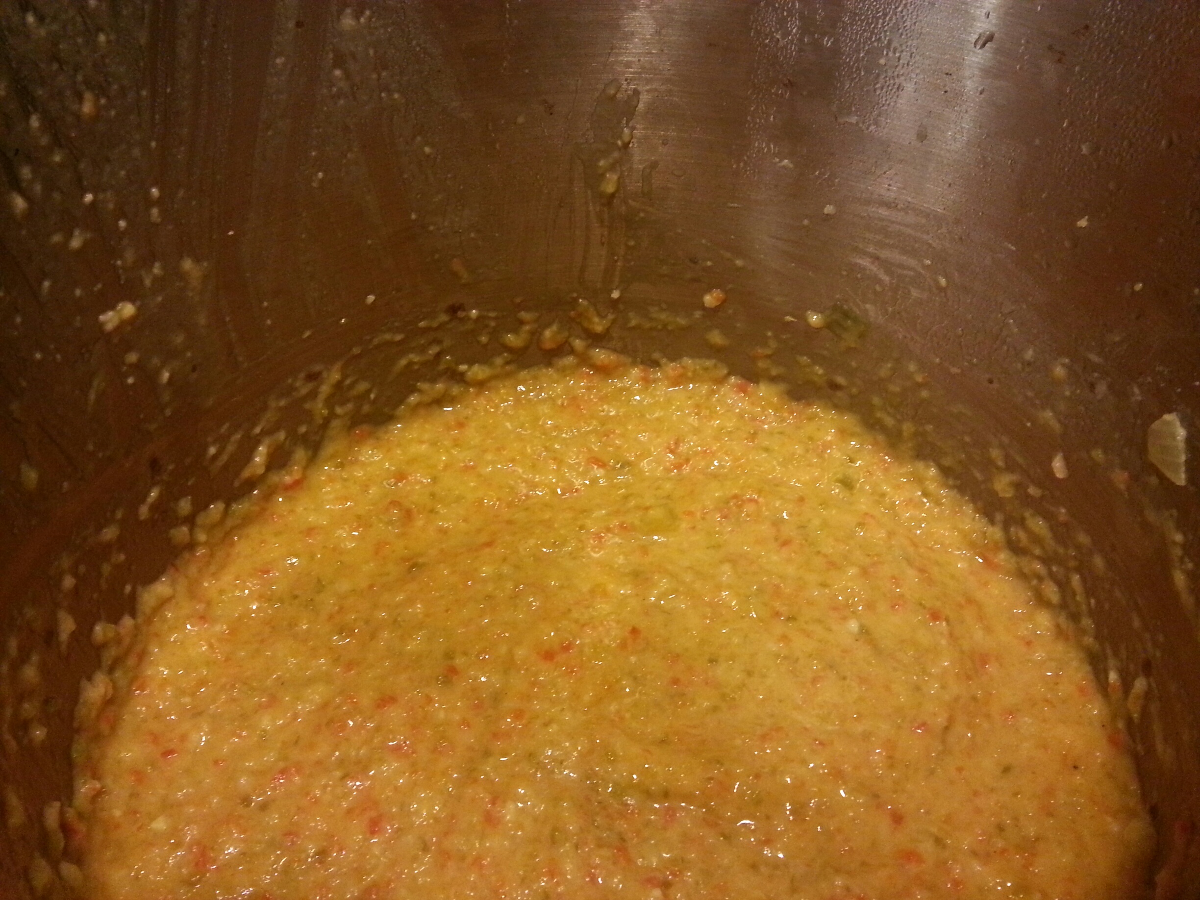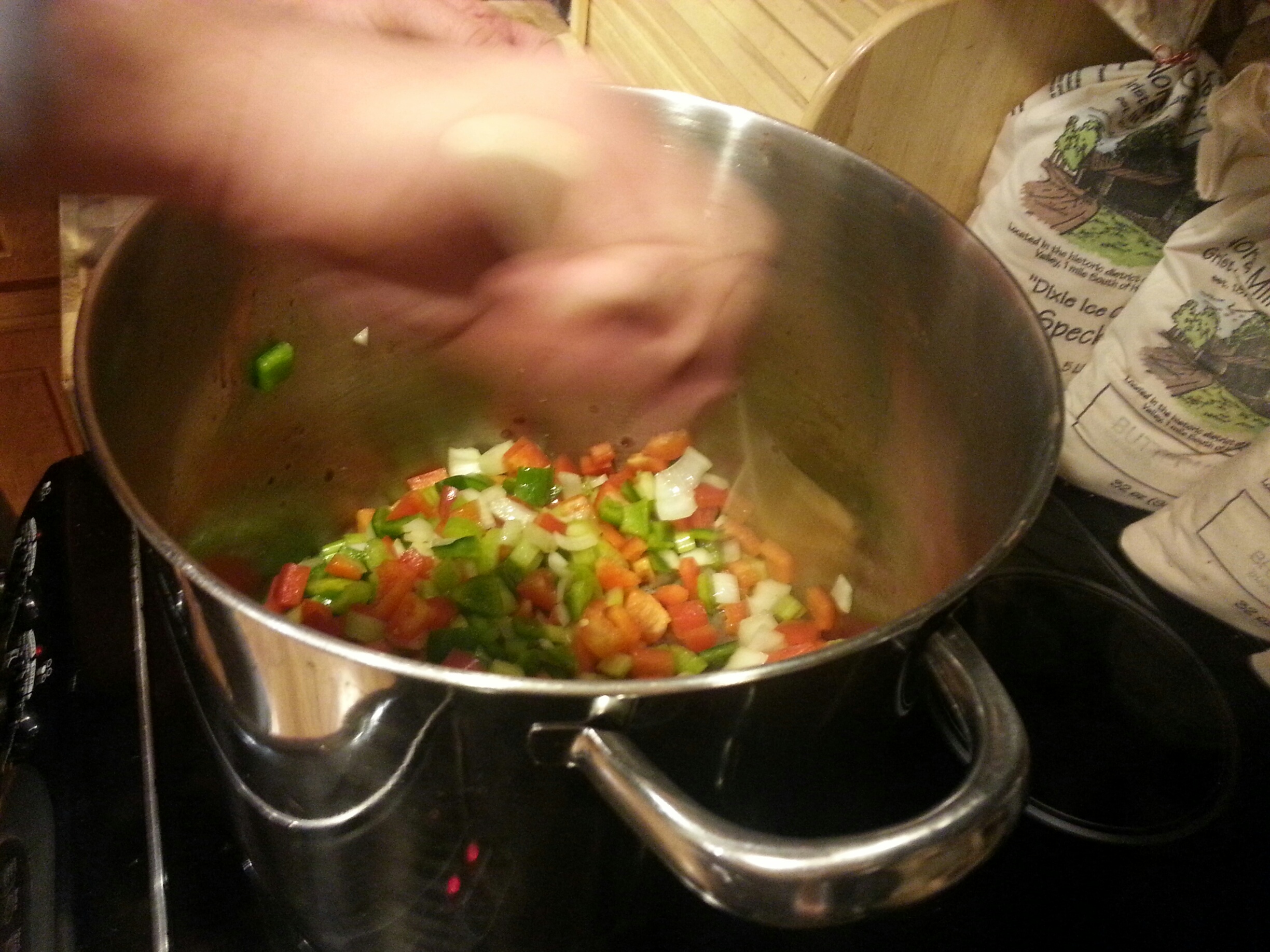 Once veggies are all mushy and released their liquid start, GRADUALLY, stirring in the flour. Add enough flour to absorb the liquid and continue to stir and cook on low heat until mixture browns slightly (3minutes)