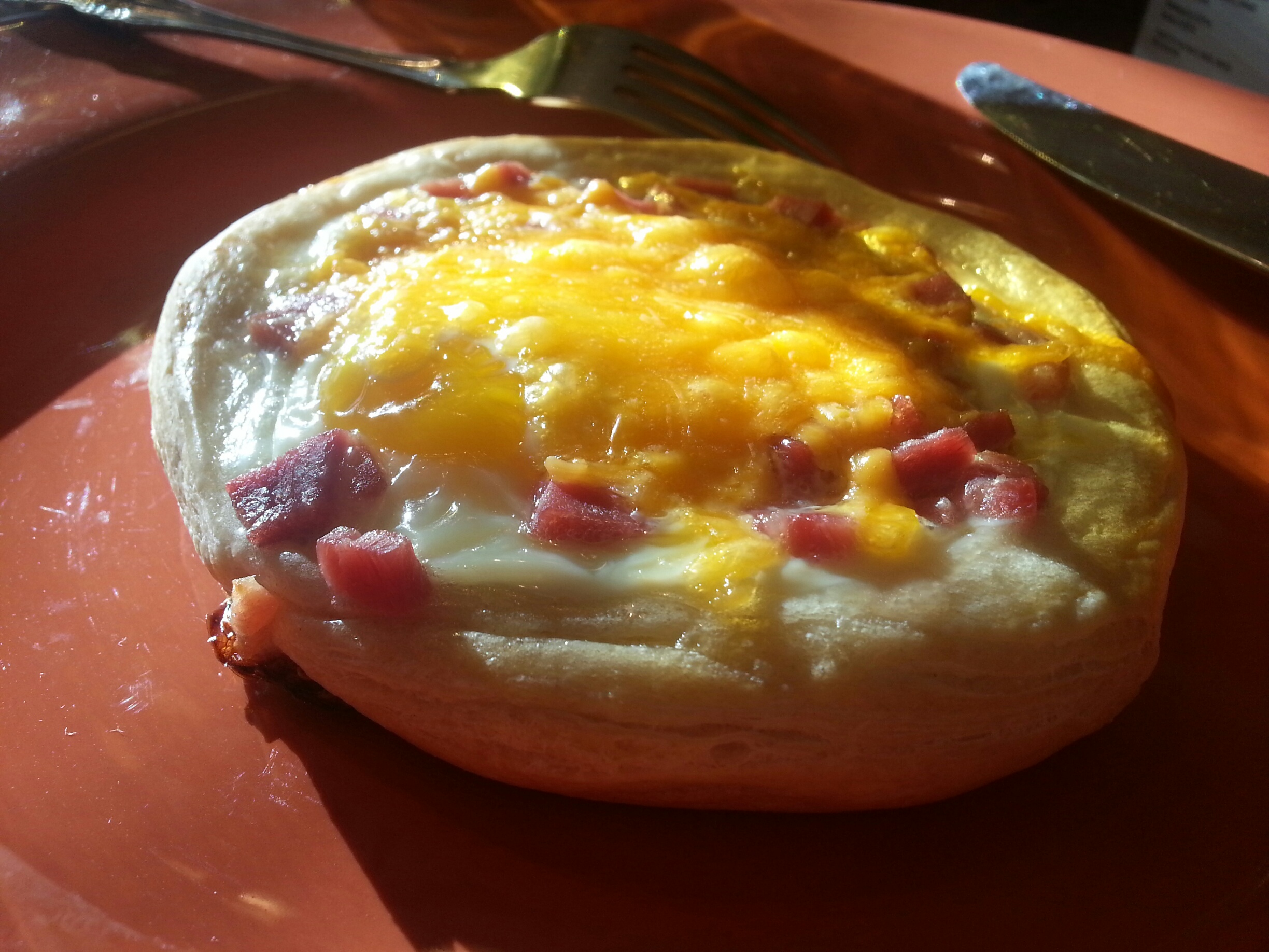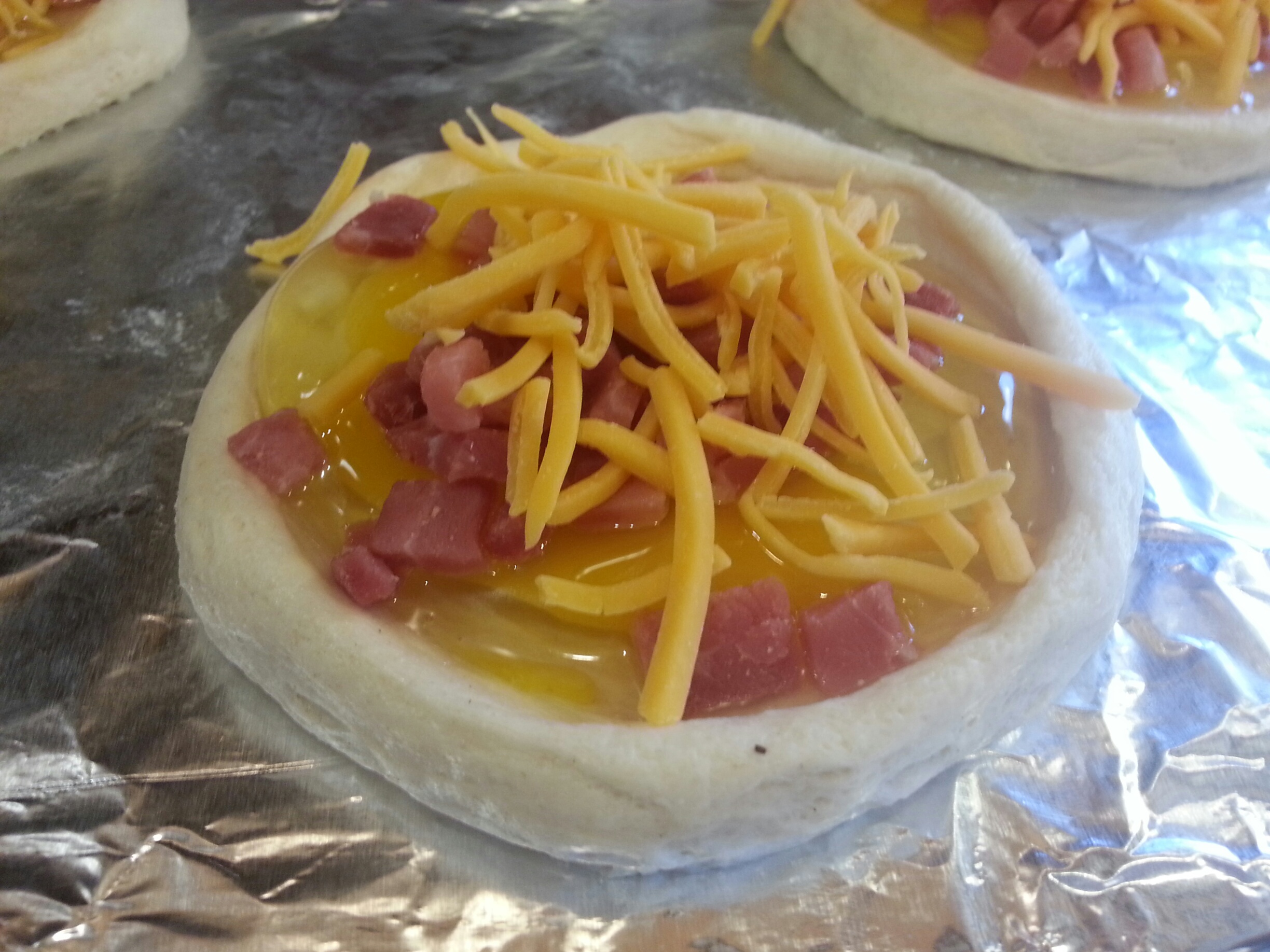 On a foil lined baking sheet, form bowls with each biscuit. Fill with either scrambled or yolk in-tact egg. Top with diced ham, then cheese. Bake according to package directions until bread and eggs are done. Enjoy!