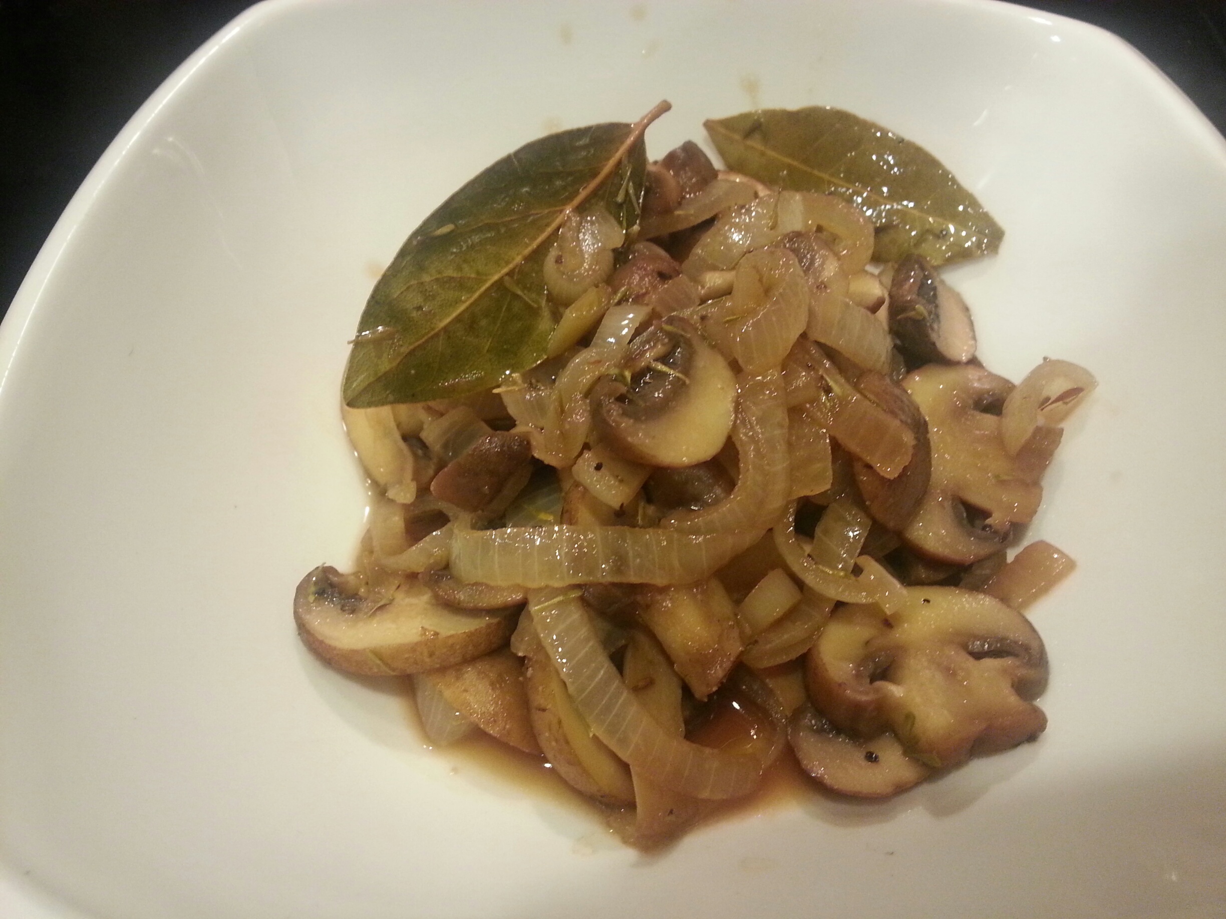 Now let’s move on to the au jus. In a skillet, melt butter, add olive oil, and saute onion and mushrooms until crisp tender, about ten minutes. Add sugar and all herbs and spices. Cook another 15 minutes. Add remaining ingredients and stir over medium heat about 30 minutes. Let cool. Strain au jus from vegetables, making sure to remove Bay leaves, and reserving vegetables for the sandwich.