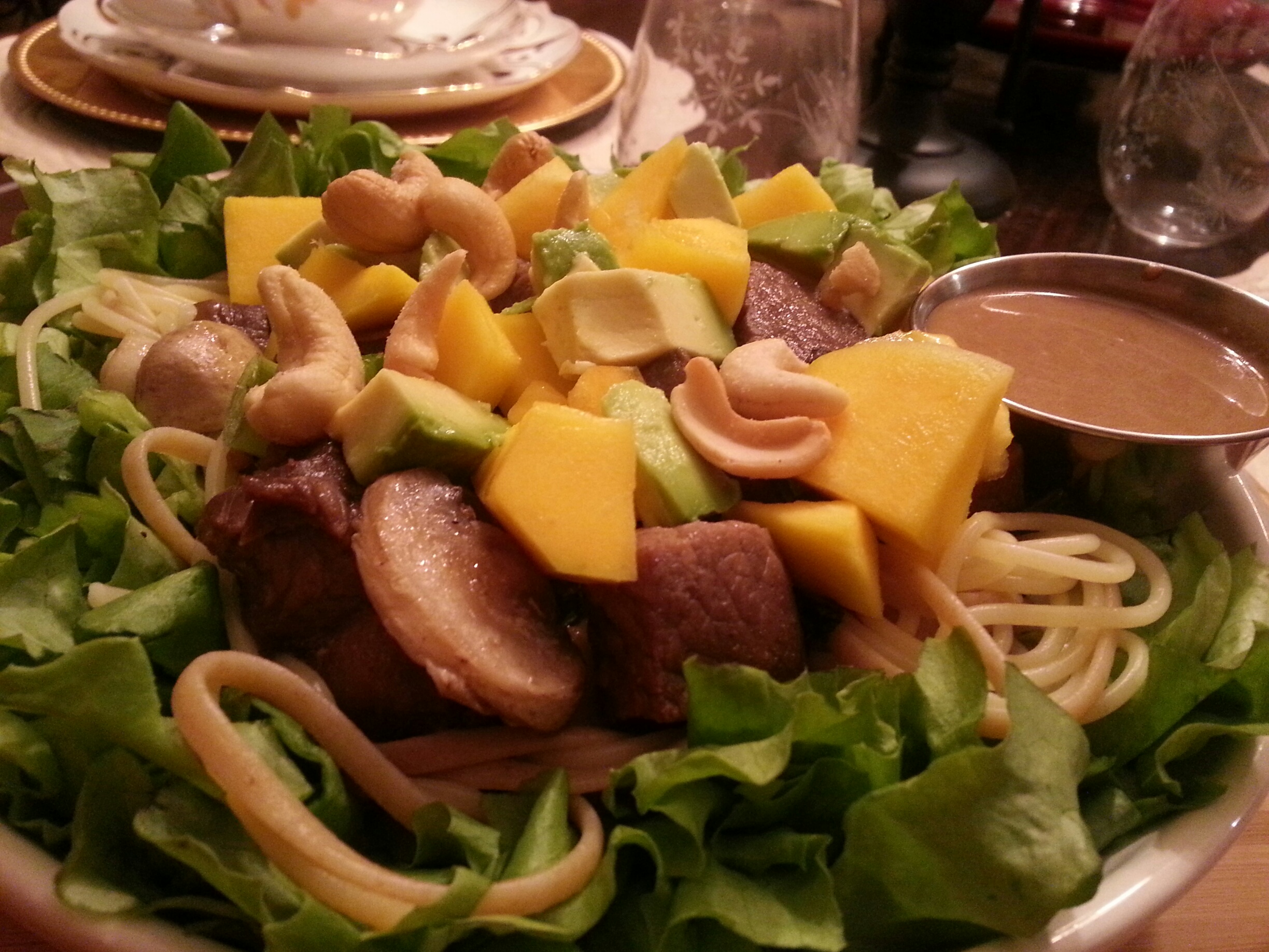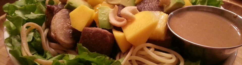 In a pan, saute your beef, mushrooms and greens (if using) until meat is to your desired likeness. I prefer medium rare. In a large salad bowl, place chopped lettuce, chilled noodles, beef with mushrooms and greens, and top with mango, avocado, tomato and chopped nuts if desired. Serve with light peanut sauce.