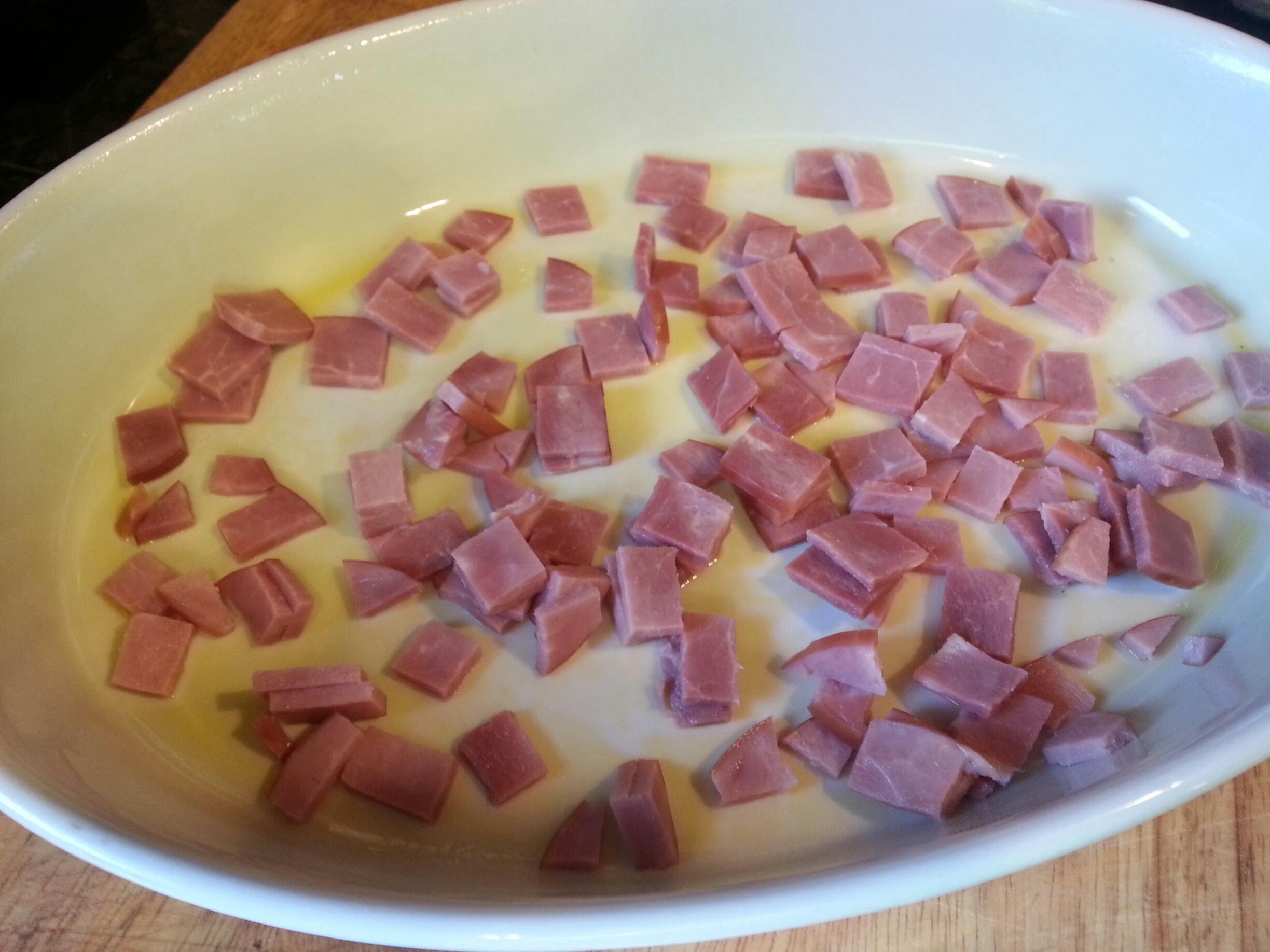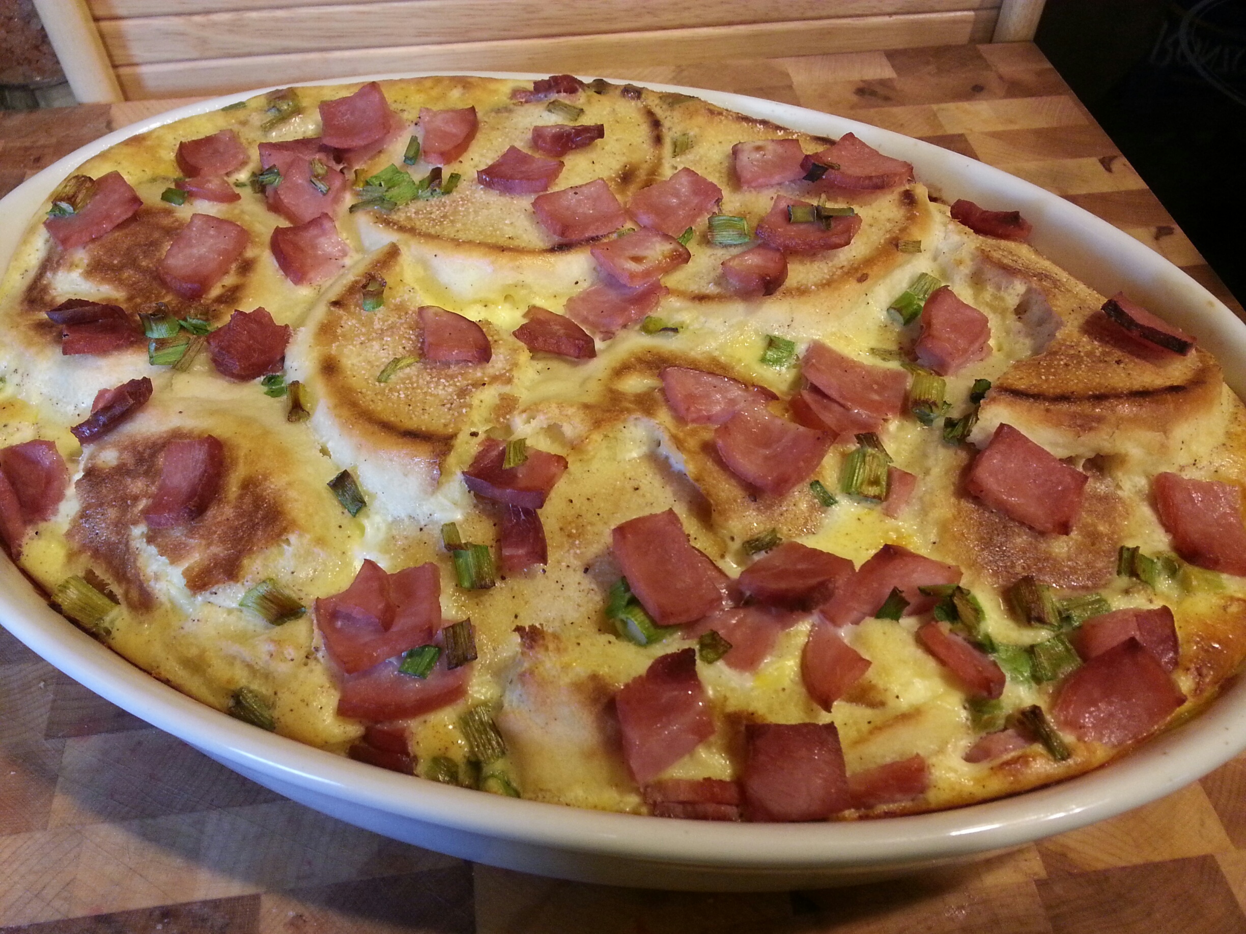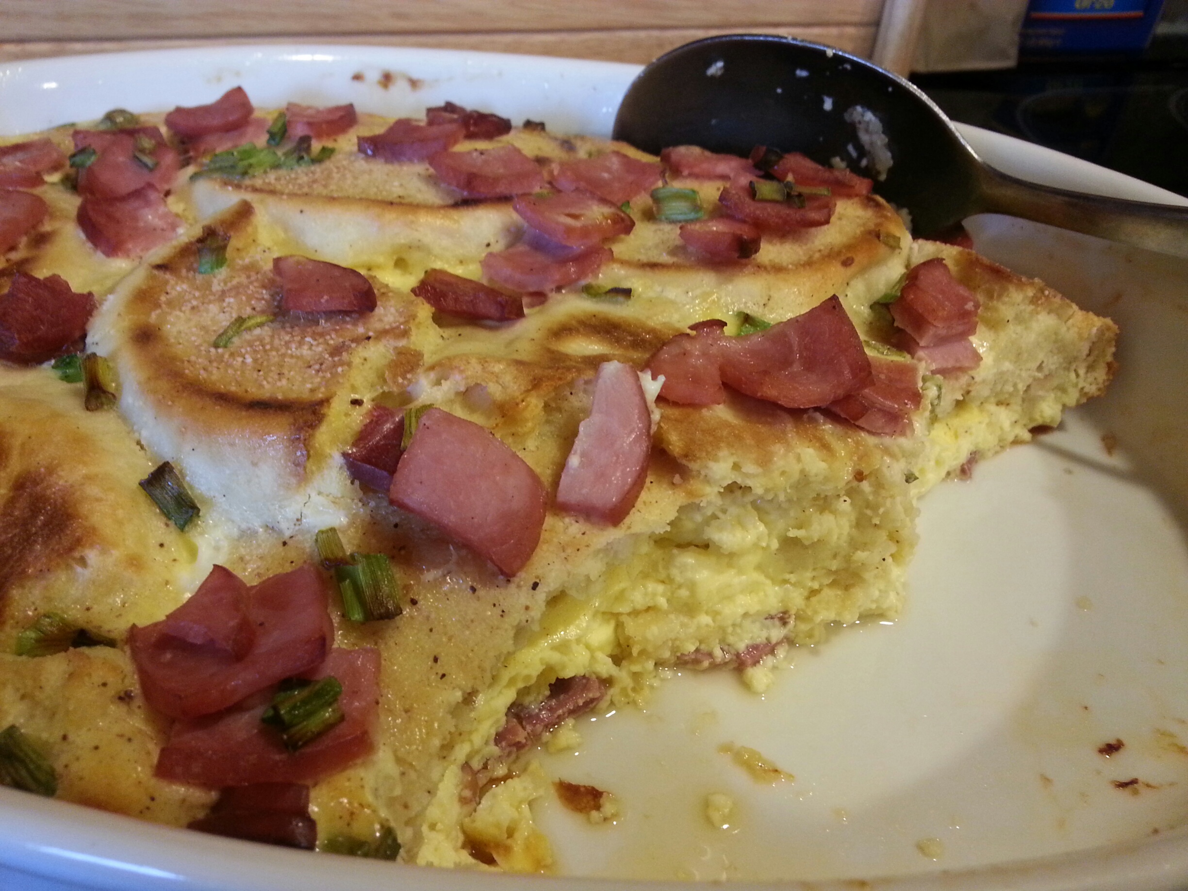 In a greased 13×9 pan, layer ham or bacon, English muffins and scallions. In a bowl, whip remaining ingredients. Pour over casserole. Let sit about 30 minutes, or refrigerate overnight. Bake covered at 375 for 20 minutes, remove cover and bake an additional 10-15 minutes or until center is cooked through.