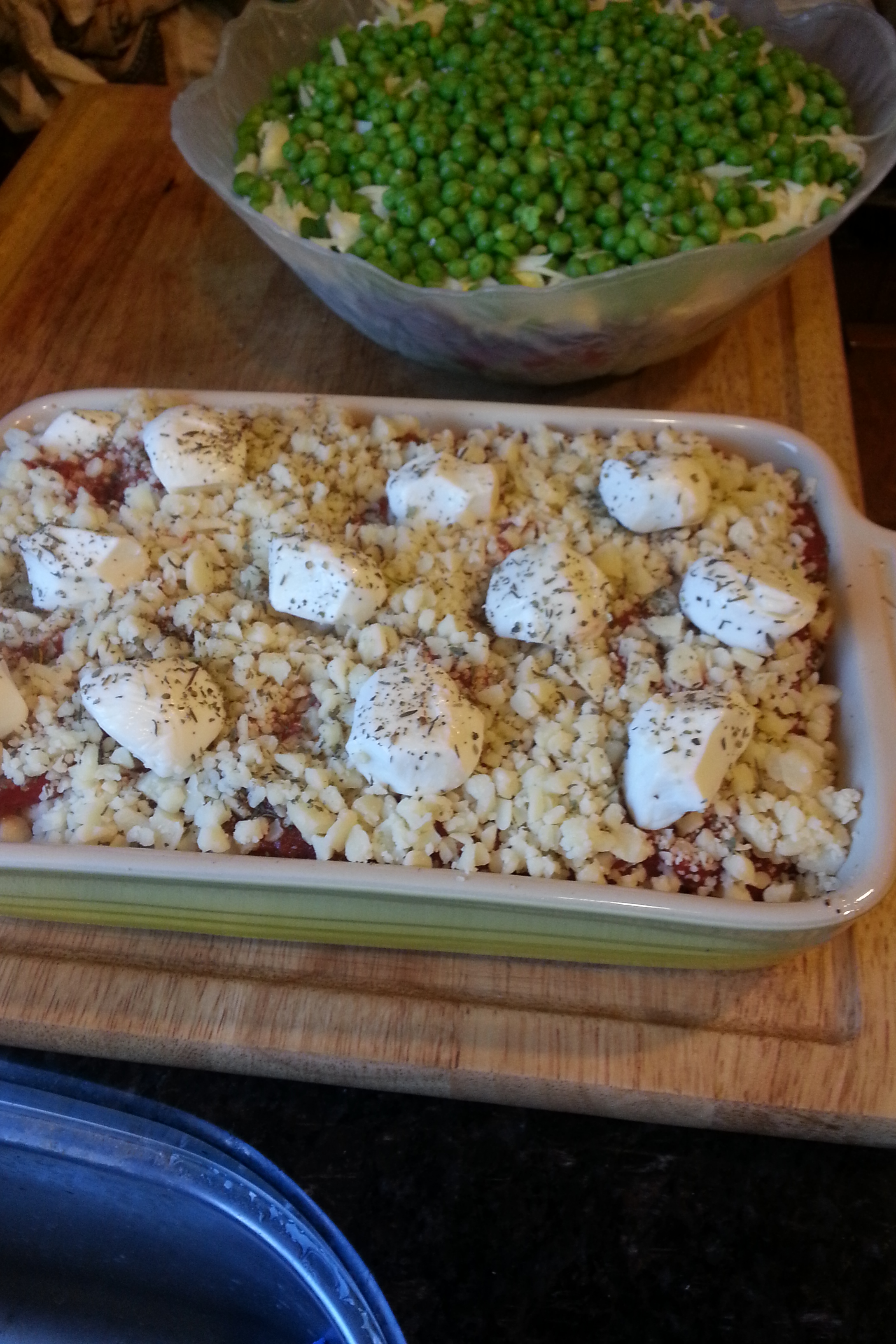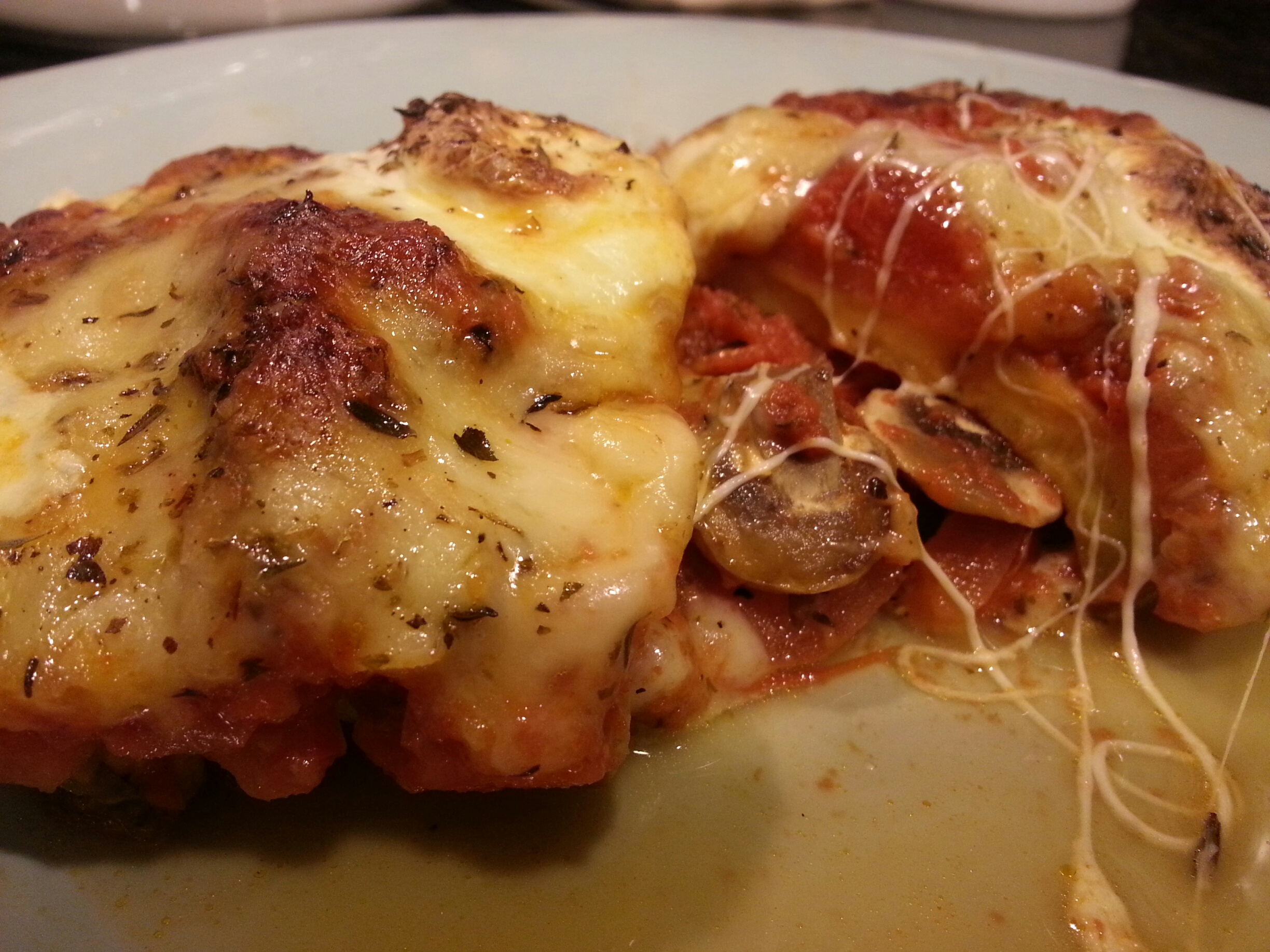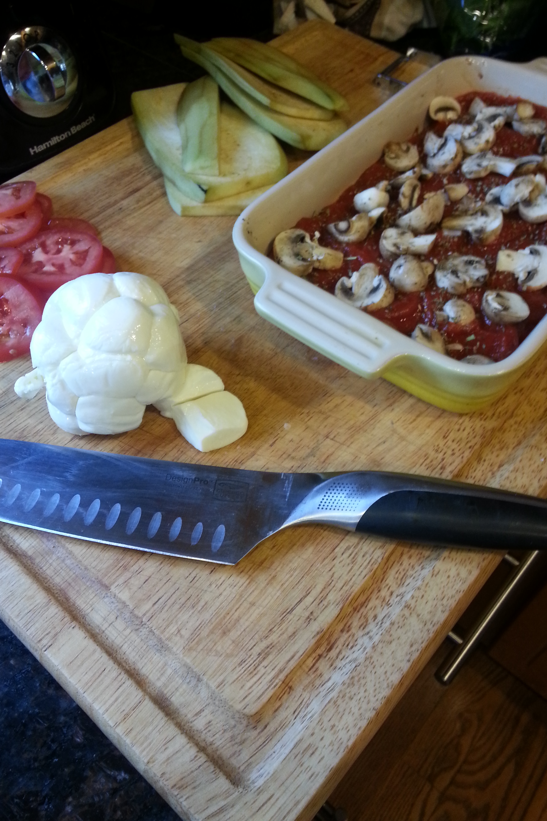 Spray a 13 x 9 baking pan with non-stick spray. Spread 1/3 of sauce into the bottom of the pan. Add layers of mushrooms, zucchini, onion, eggplant and tomato. Top with a layer of grated cheese. Sprinkle with one tbsp. Italian seasoning. Add one third fresh Basil. Repeat these layers 2 times. Before adding the final layer of Basil over the top, add a layer of small mozzarella balls or slices, then sprinkle with Basil. Bake at 375 for about 40-45 minutes or until the cheese is light golden brown.
