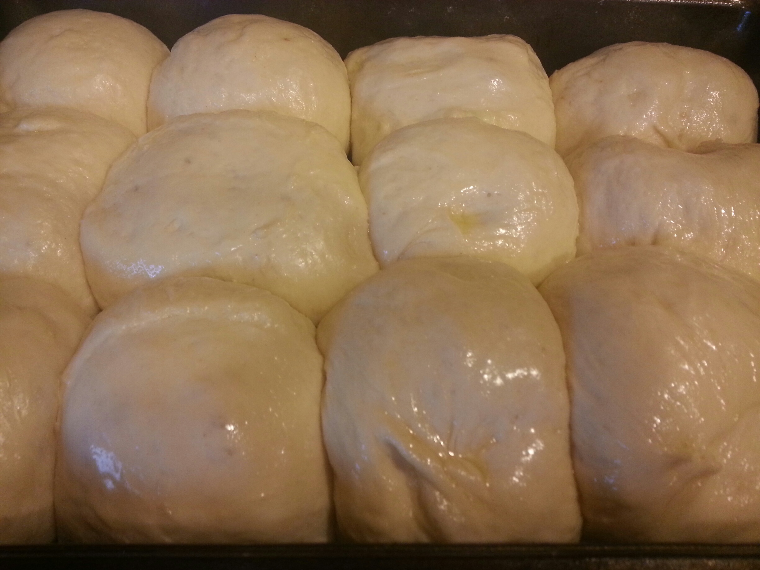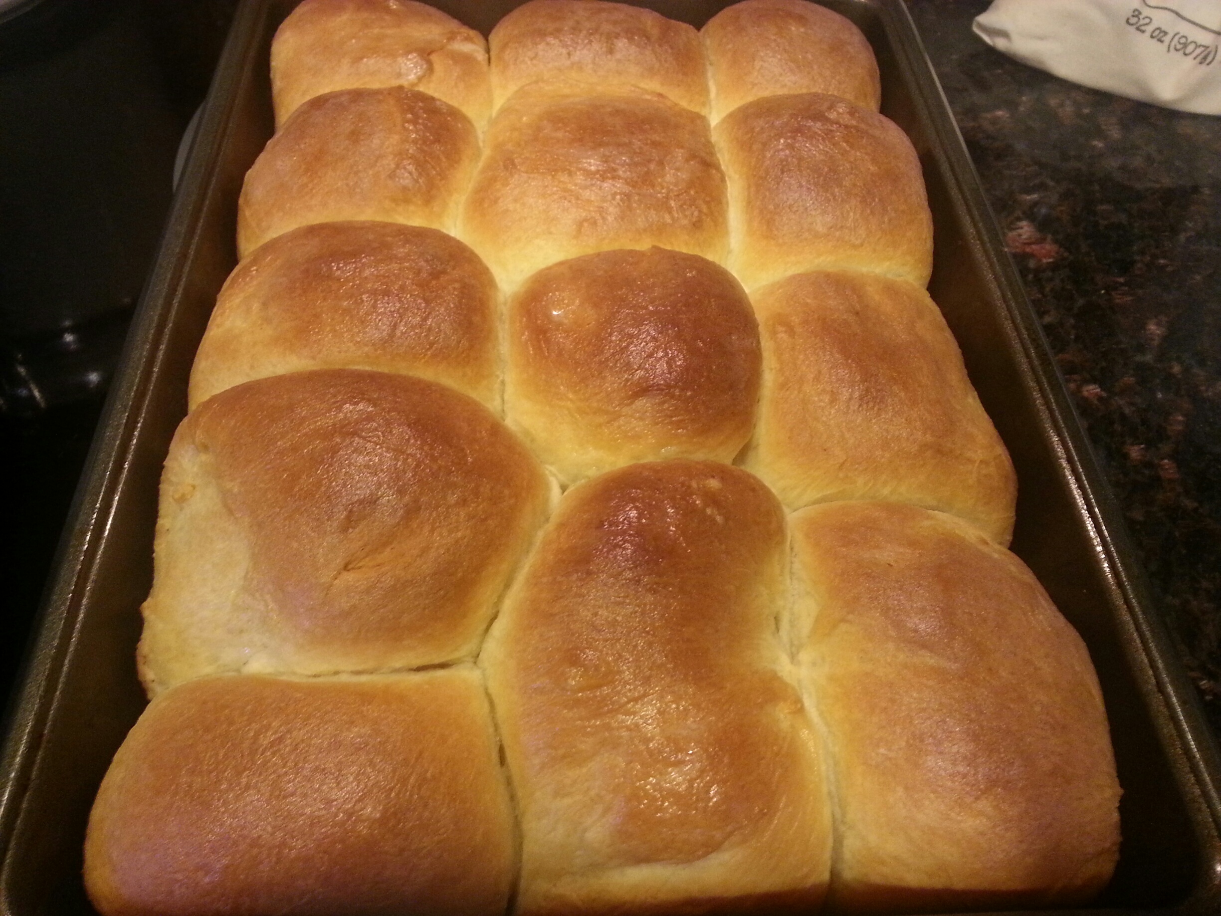 * This recipe can also be made without use of a bread machine by mixing your dough in a stand mixer with a dough hook attachment. You may choose to hand knead the dough after mixing if you prefer, or just use the dough hook for kneading. Place mixed and kneaded dough in a greased bowl, cover and let rise in a warm place about an hour or until doubled in size. Punch down and prepare your rolls as instructed above.