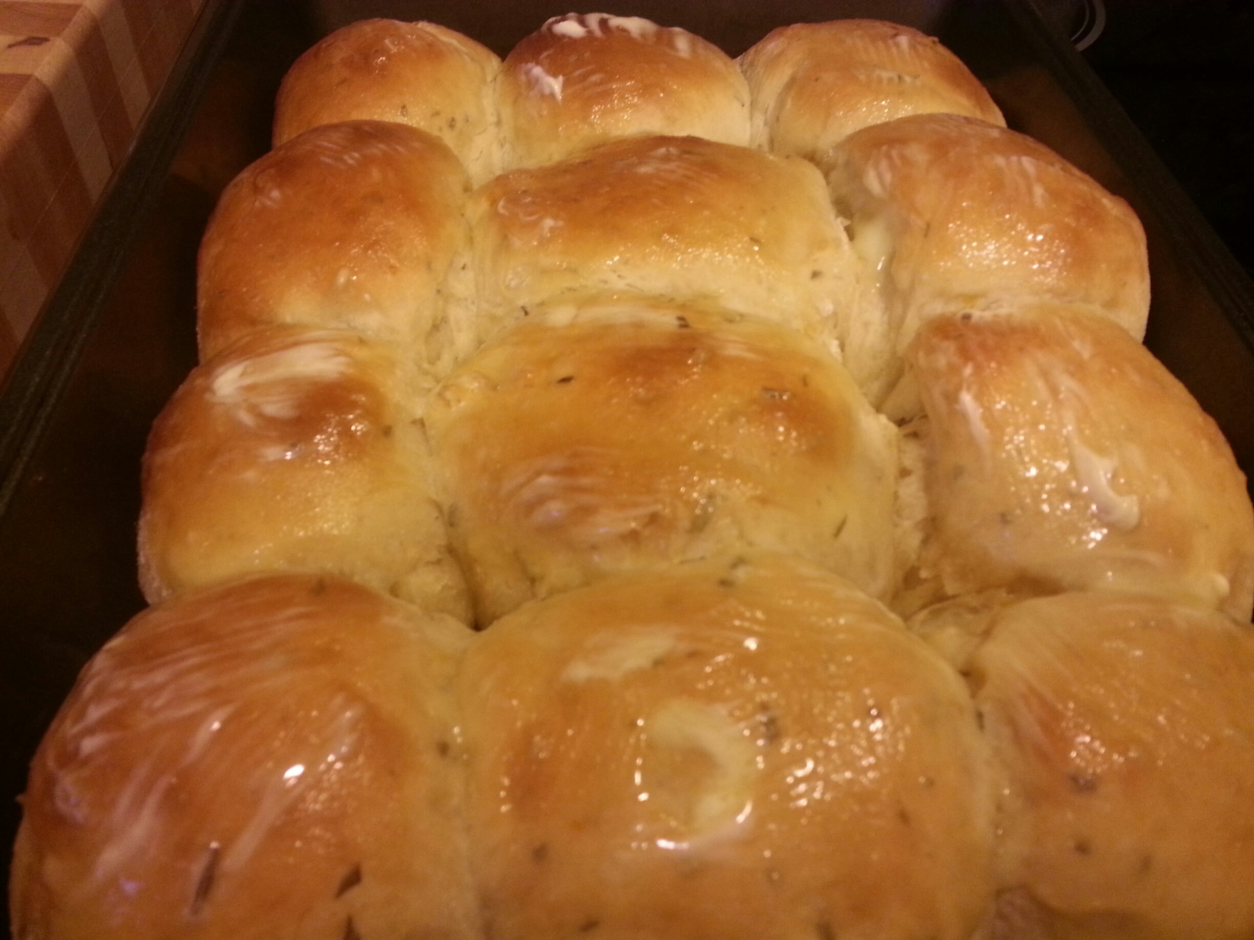Add yeast to the 1/2 cup of warm water. Cover and let sit about 10 minutes or until foamy. Add all other ingredients to your bread pan. Add water with yeast last. Set machine for the dough cycle. When the dough is ready, turn out onto a floured surface. Tear the dough into 12 equal pieces and place in a greased baking pan. Cover with a kitchen towel and allow them to rise 30 minutes in a warm, draft free place. Remove the towel and bake at 350 for about 30 minutes.