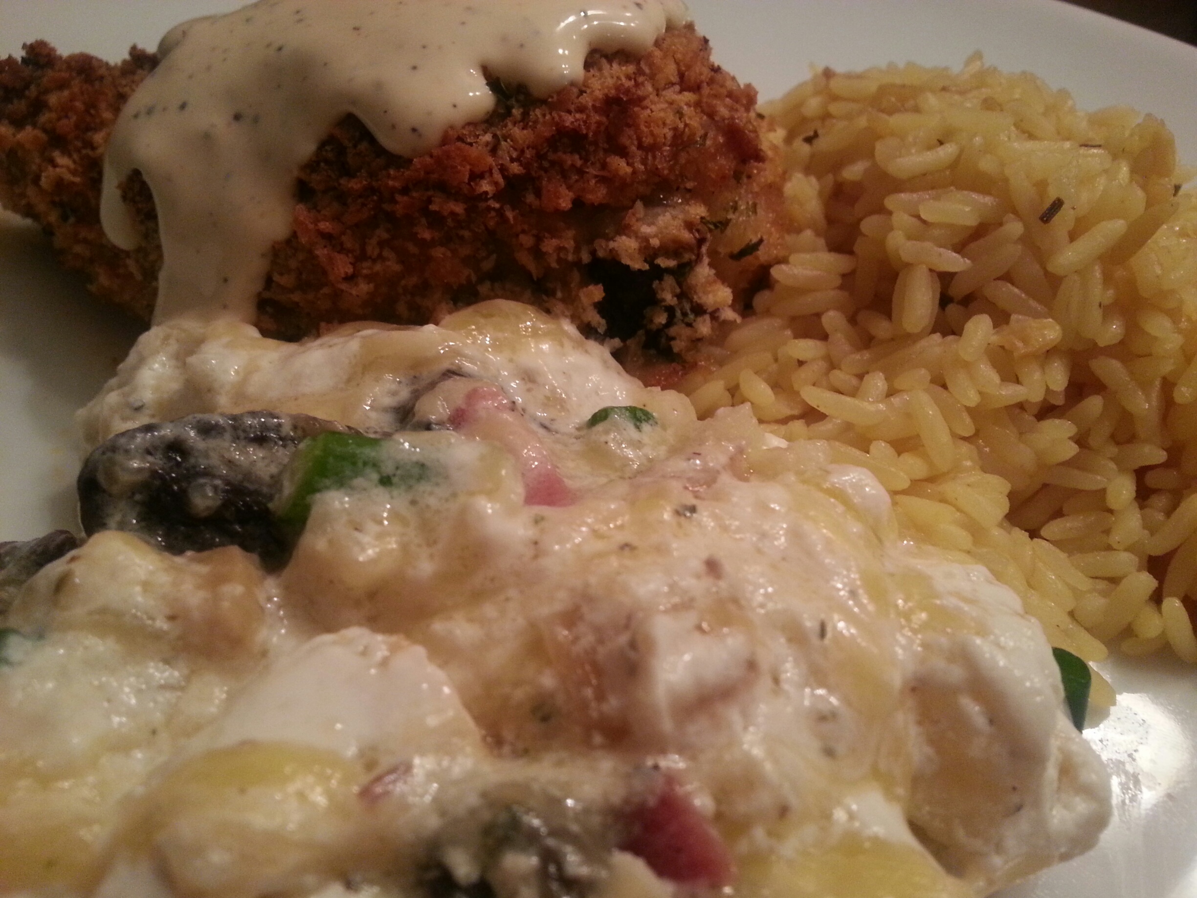 Boil cauliflower head in salted water for about 15 minutes or until tender. Remove, drain and set aside. Saute onions, mushrooms and garlic in olive oil until tender. Stir in Basil and Oregano. Remove the core from the cauliflower and cut into florets. Place florets and vegetables in large mixing bowl. Add 2/3rds of the cheese, 1/2 of the green onion and remaining ingredients. Pour into a greased 13×9 pan and top with remaining cheese and green onion. Bake at 350 for about 10-15 minutes or until cheese is melted.