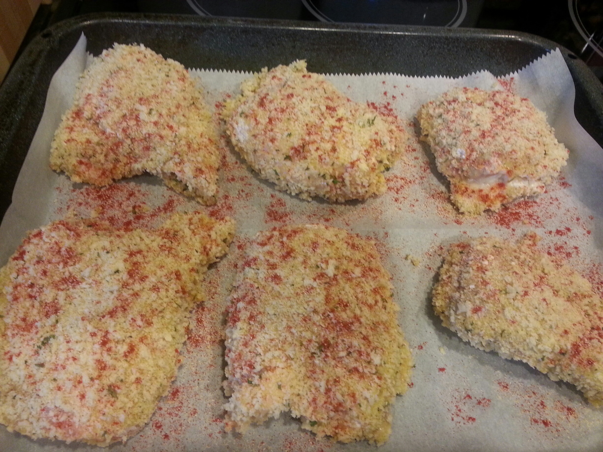 Remove chicken from Buttermilk and drain. Dredge each piece of chicken in flour first coating all sides, and shaking off excess flour. Next, dip each piece in the egg wash. Then place in the bag of Panko and gently shake to coat. Make sure each piece is WELL COATED with the Panko. Place each piece onto a greased baking sheet. Sprinkle with additional Smoked Paprika.