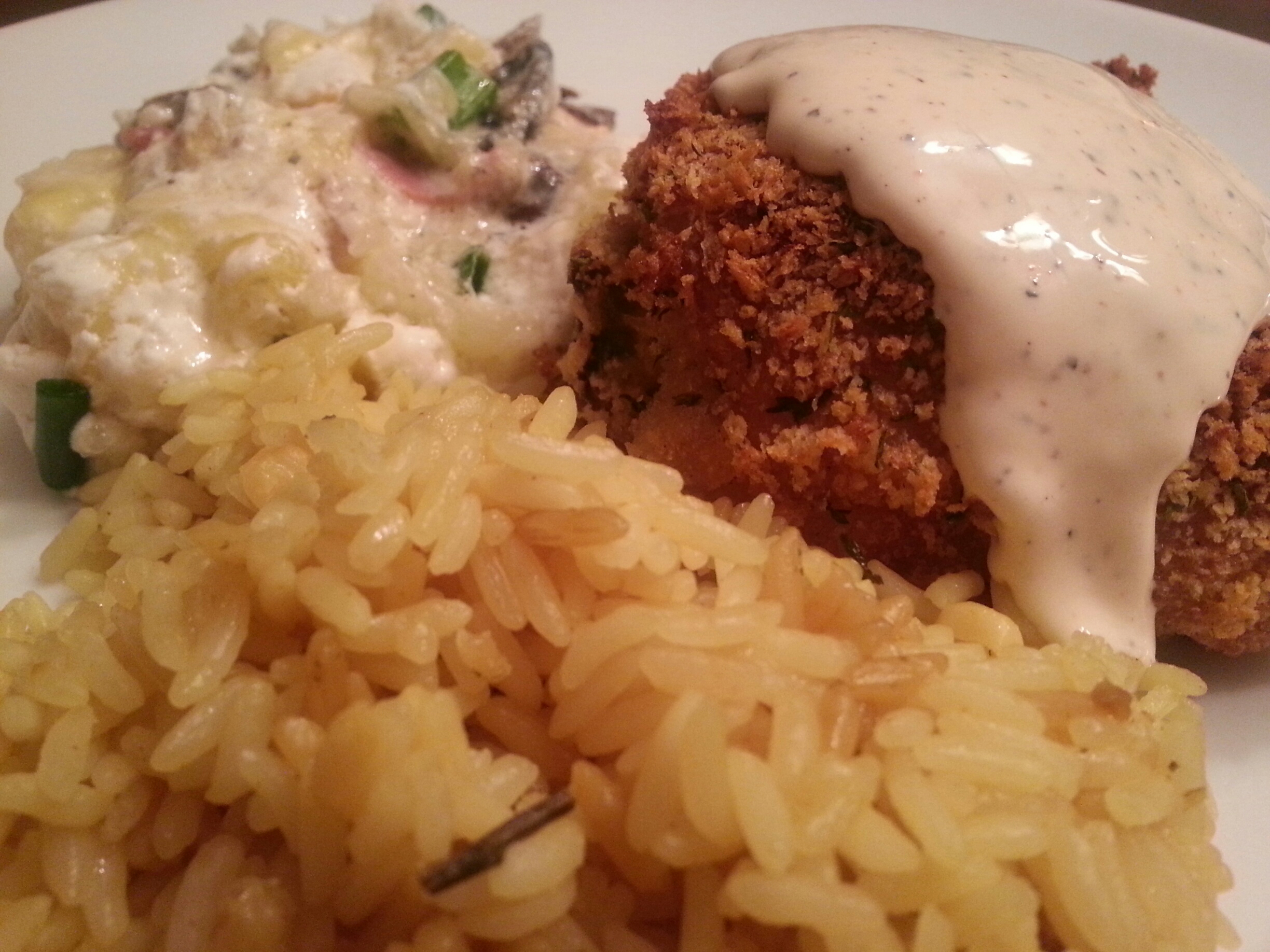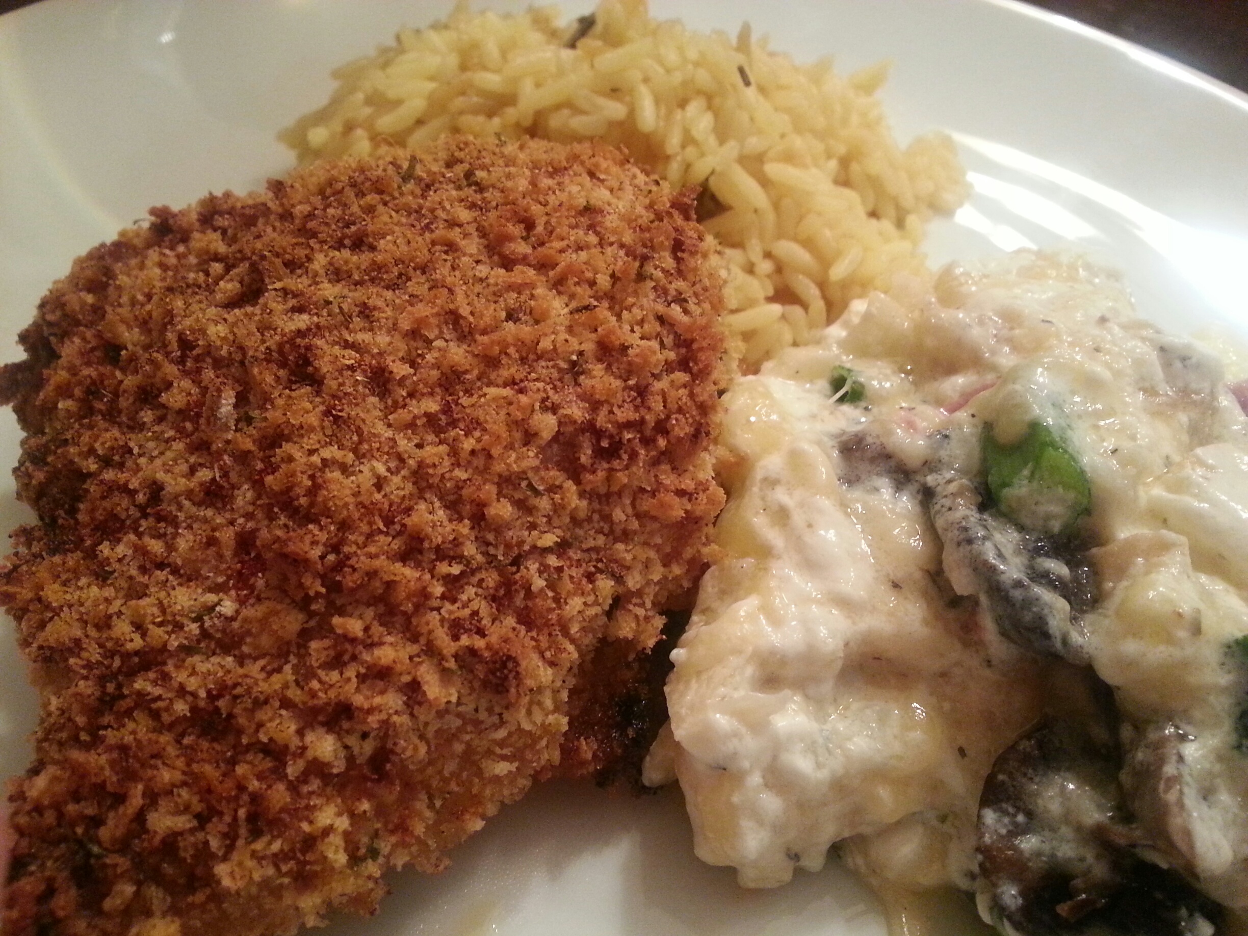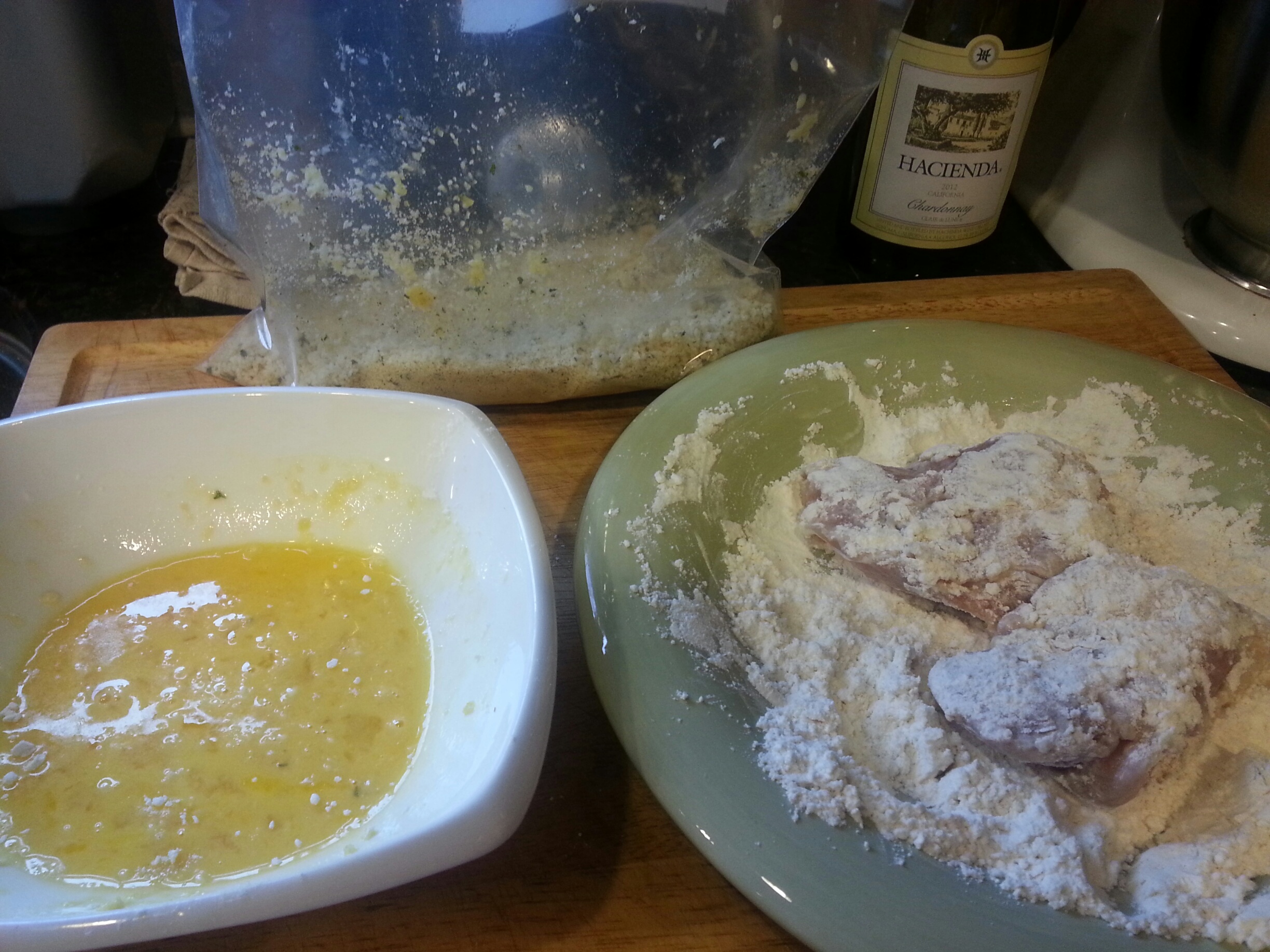 In a shallow bowl, blend flour and all herbs and spices. Add salt and pepper according to your taste preference. Pour the egg in a second shallow bowl. Place the Panko in a gallon ziplock bag.