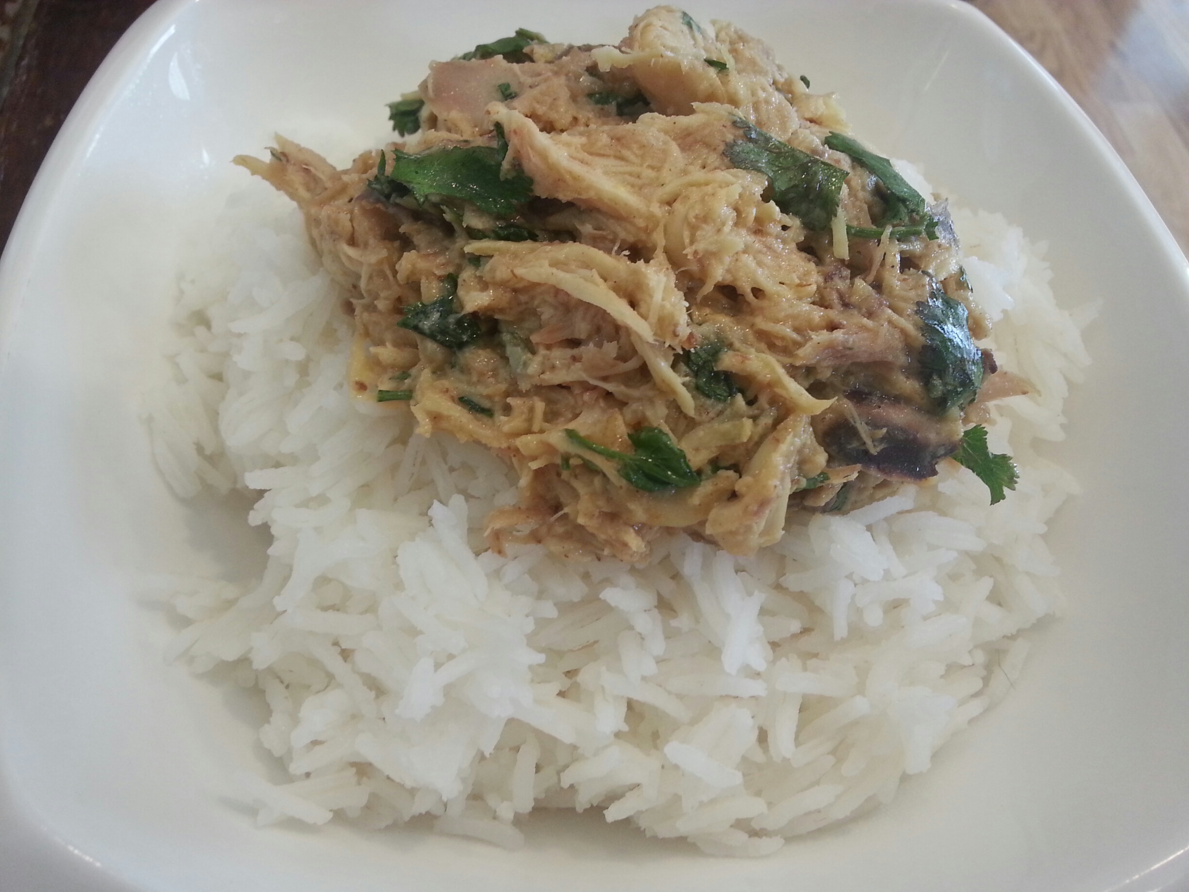 In a medium pot, whisk all ingredients together except the shredded chicken. While whisking, bring to a simmer and allow to cook about 10 minutes. Add chicken to the sauce, and cook an additional 5 minutes, stirring well. Serve over hot rice. Garnish with a little Lime zest and Cilantro. Yep. That’s it! We like easy remember 🙂