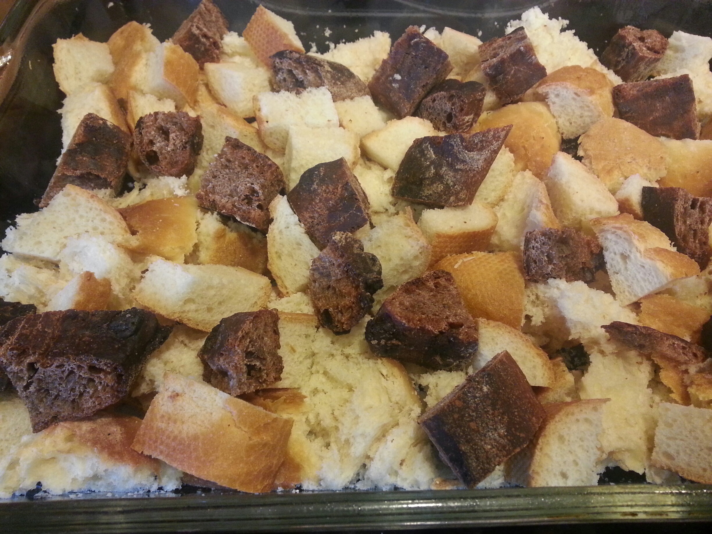 - 8 cups stale bread – any kind. I used leftover yeast rolls plus some chocolate bread