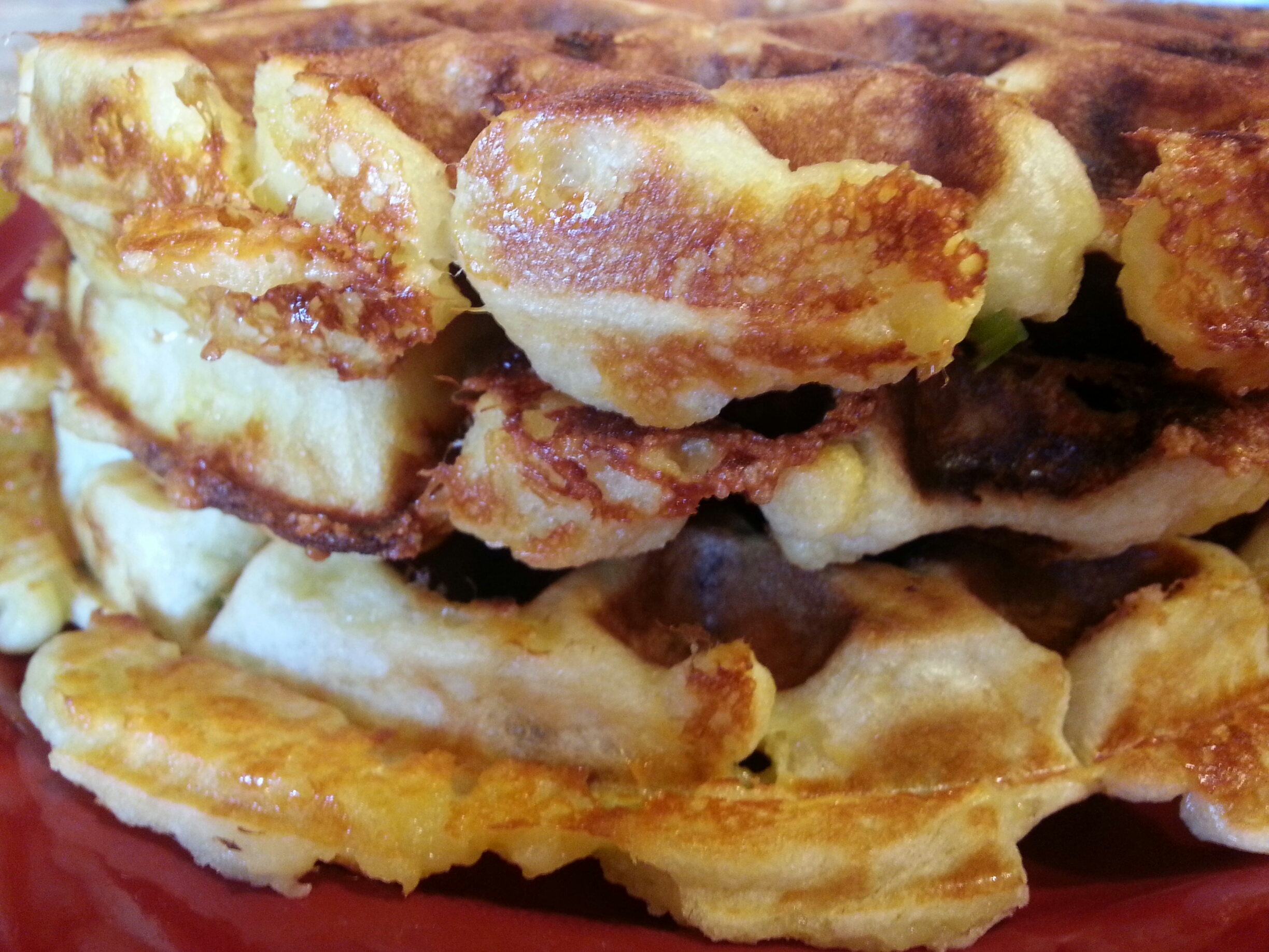 Whaaat? You’ve never had a savory waffle? People people! Let’s think outside our culinary boxes. We can put all kinds of stuff in waffles! Waffles aren’t just for fruit anymore. Do you see that beautiful ring of crispy, melty cheese around the edges? You have to have this. You have to have this now.