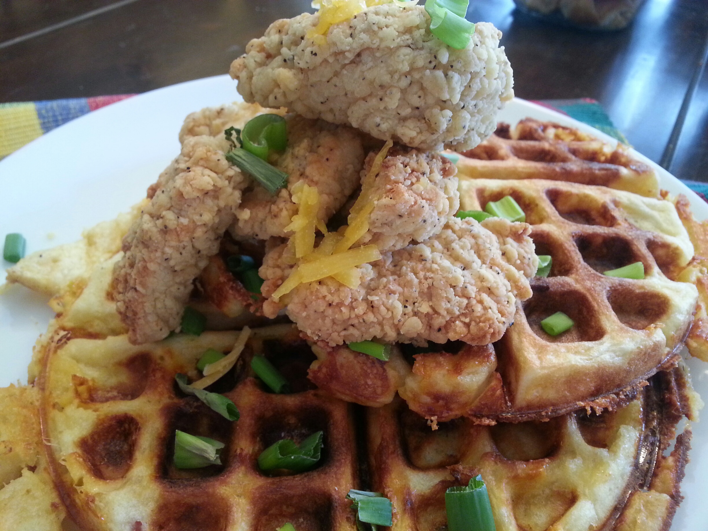 Breakfast recipes, brunch recipes, cheddar waffles, cheese, Chicken & Waffles, chicken recipes, Easter recipes, savory waffles, waffle recipes