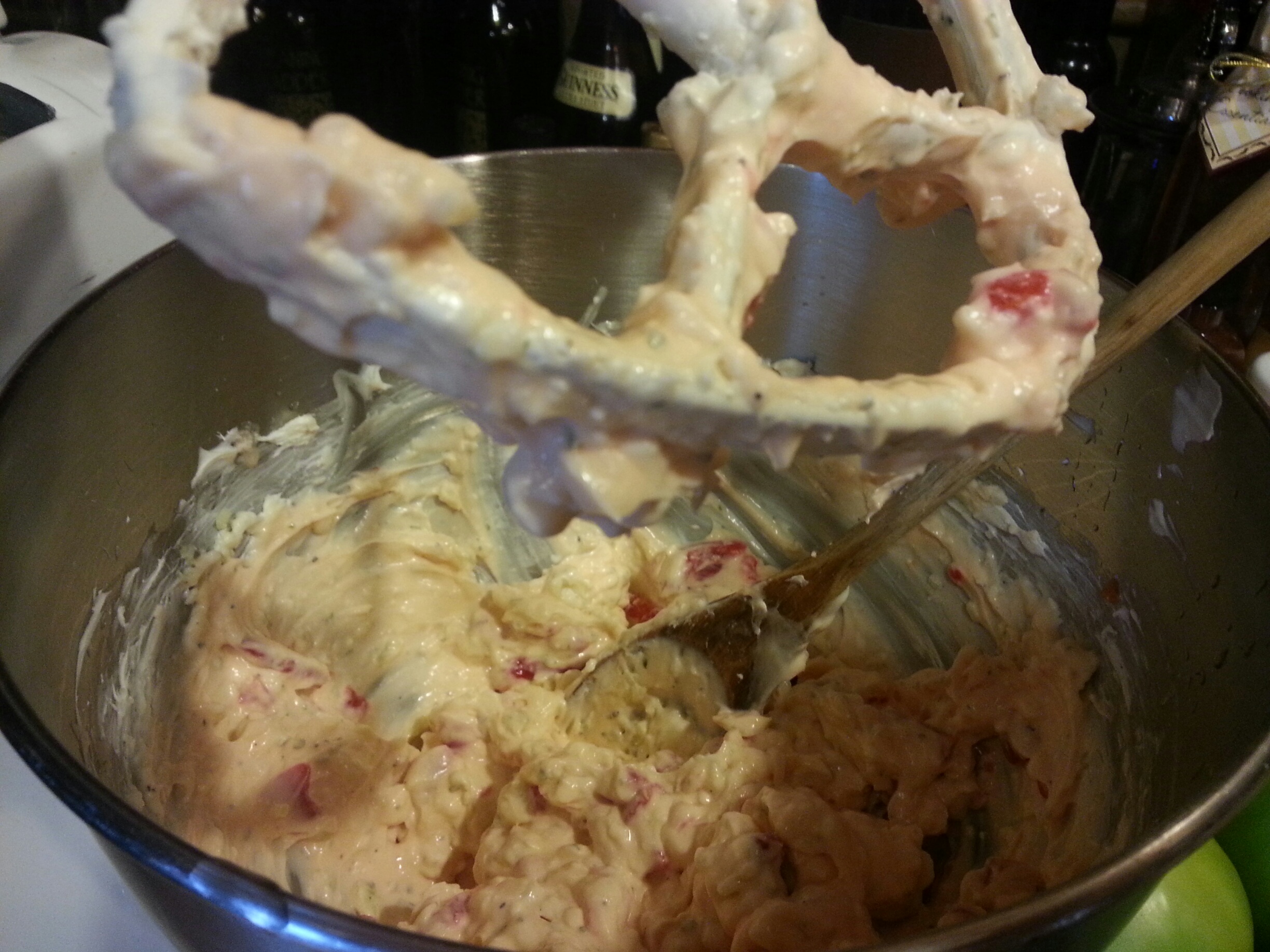 In a stand mixer, whip the cream cheese. Add mayo and continue to whip until creamy. Add cheese and balance of ingredients, except grits and butter, and continue to mix until well blended. Add butter and about 1/2 batch of your pimento cheese to your grits and stir well. You can add more or less if you like. The trick to good grits is ALL in the stirring 🙂