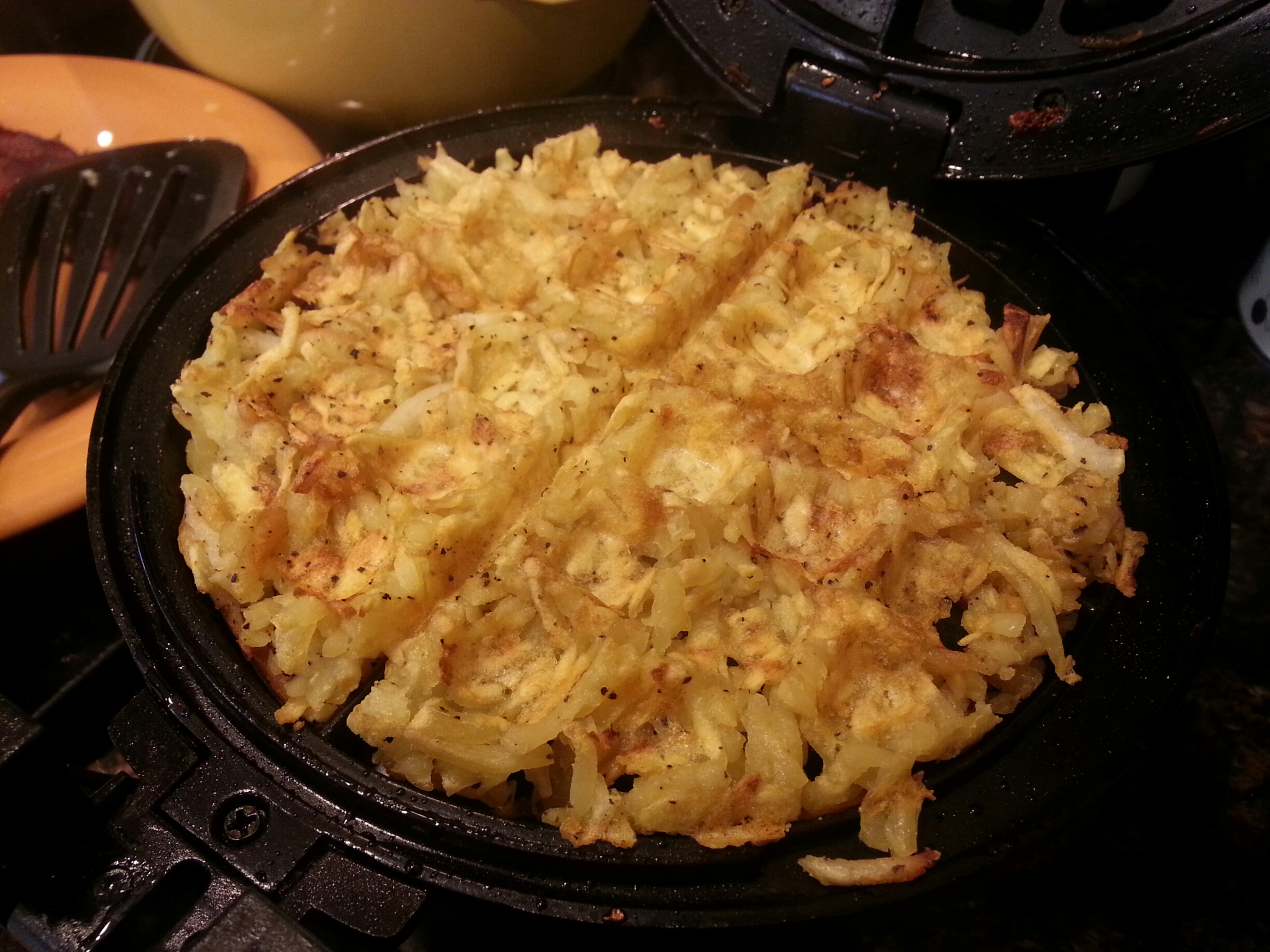 What I can’t seem to find on my posterior region, however, are these hash browns. They are super easy and super delicious and the perfect solution when the junk food monster comes a callin’. They are made in a waffle iron! Yep, really! Now why didn’t Waffle House think of that?