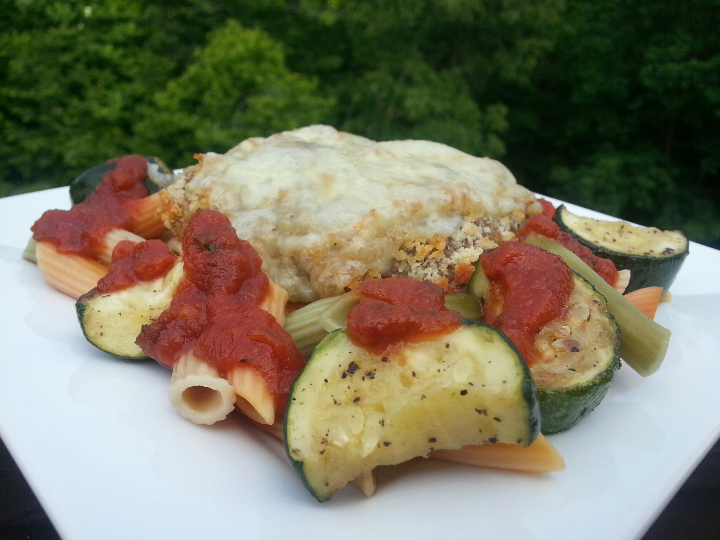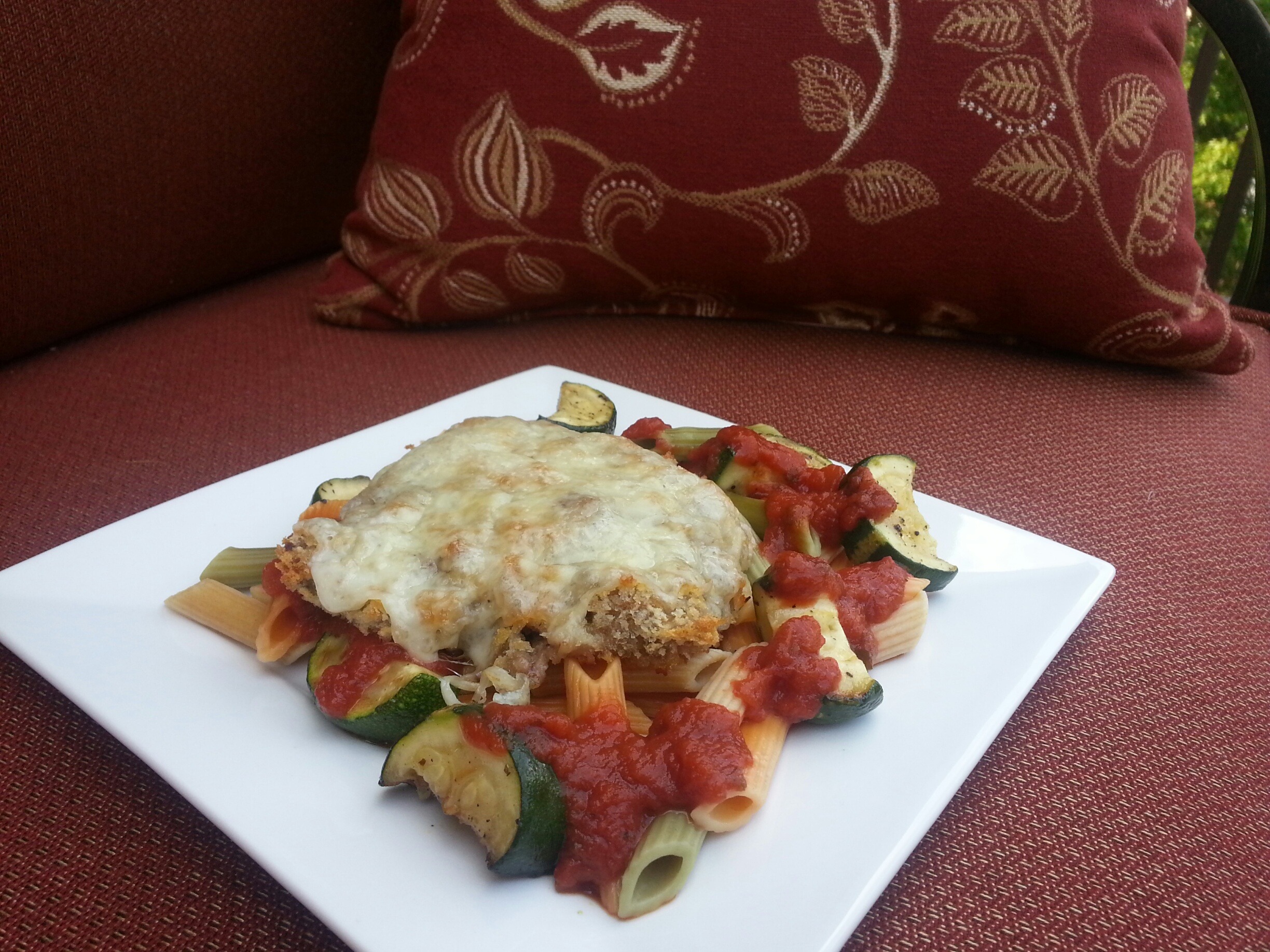 Lightly beat buttermilk with eggs. Bread cube steak by dipping first in flour, then in buttermilk egg mixture, then Panko. Place on a well greased cooking sheet. Bake at 400 for 20 minutes or until golden brown and crispy. Top with cheese and return to oven until cheese is melted. Add steamed veggies to the pasta and place on plates. Top pasta with marinara and steak.