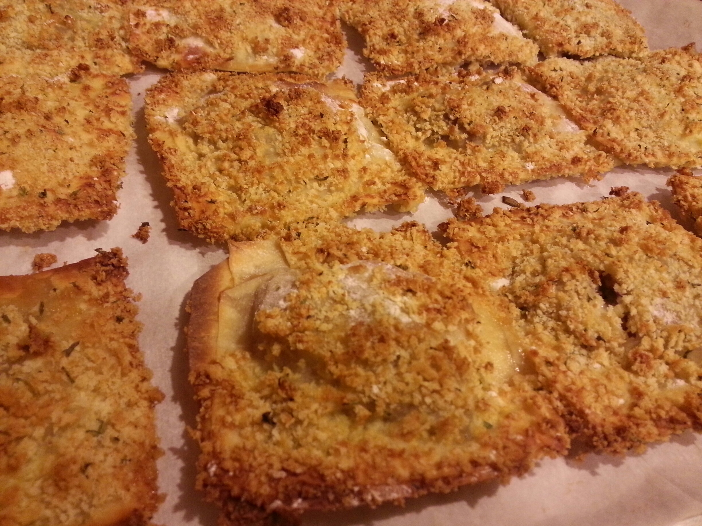 Mix beer and egg. Dredge each filled wonton first in flour, then in egg and beer mixture, then coat with panko. Place on a greased baking sheet and bake for 30 minutes at 425 or until golden brown.