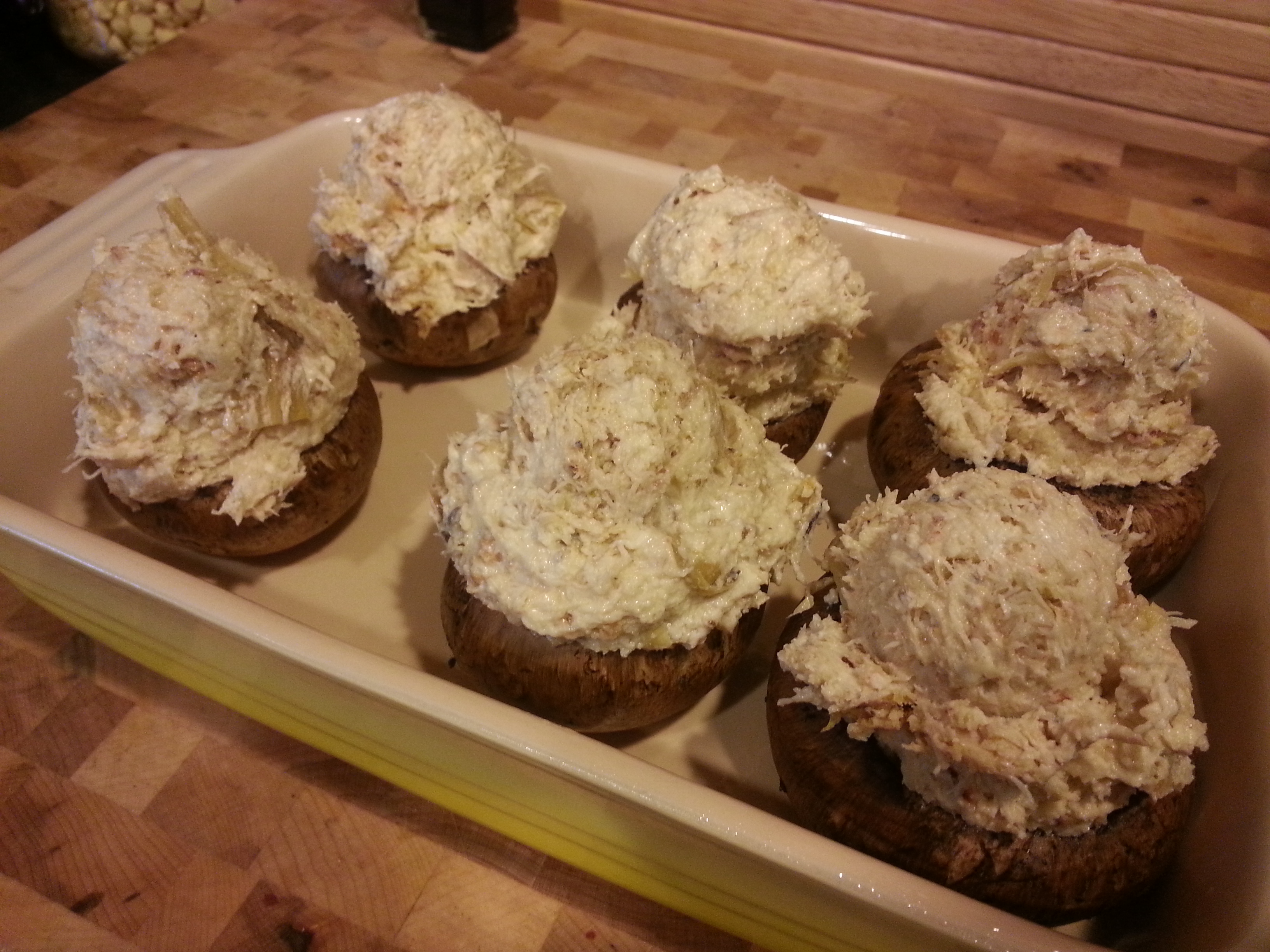 Fill mushroom caps with crab & Artichoke dip. Bake at 425 for about 15 minutes. This is am AWESOME appetizer for football season or anytime and a great way to use leftover dip! Enjoy!