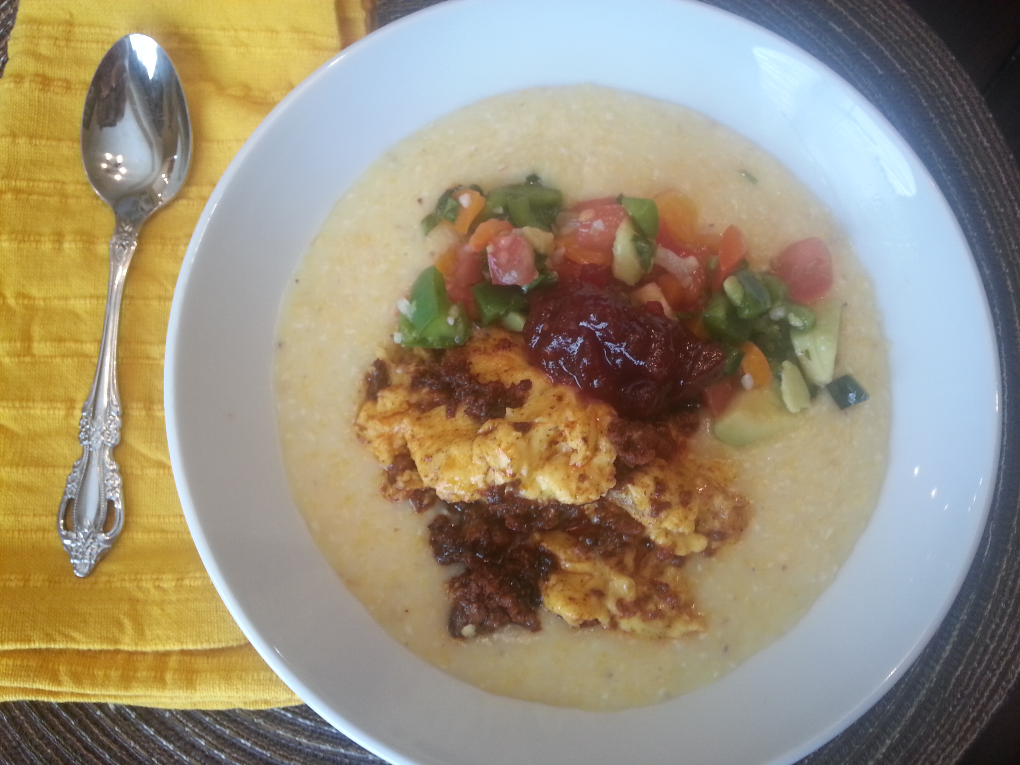 Farmer’s Cheese Grits with Chorizo Scrambled Eggs & Tomato Jam