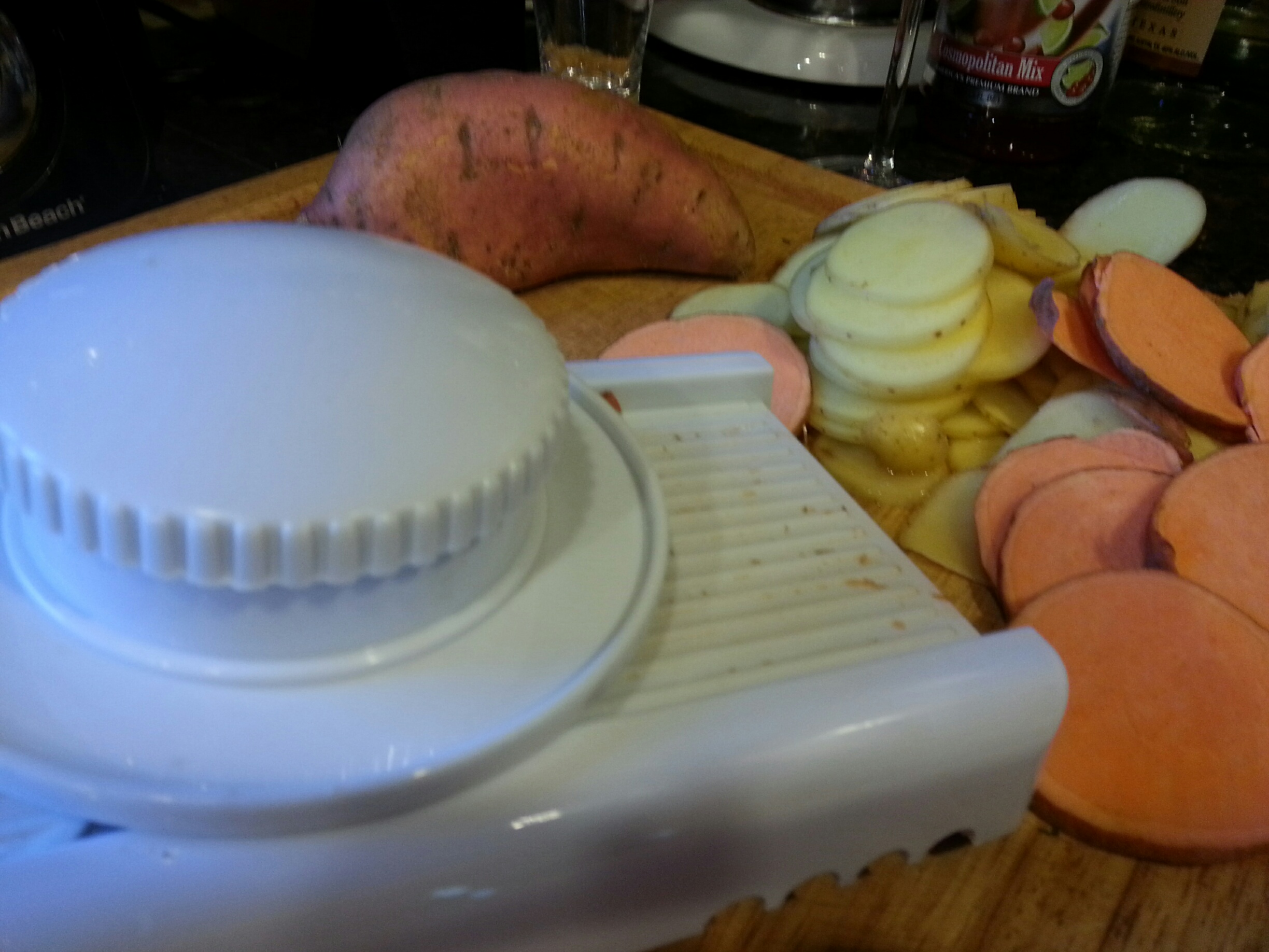 Thinly slice potatoes with a mandolin. Place in a large bowl and toss with remaining ingredients. Place on a greased pan. Bake at 400 for about 20 minutes. Watch the crisps as different ovens require more or less baking time. You want these crisp, but be careful not to burn.