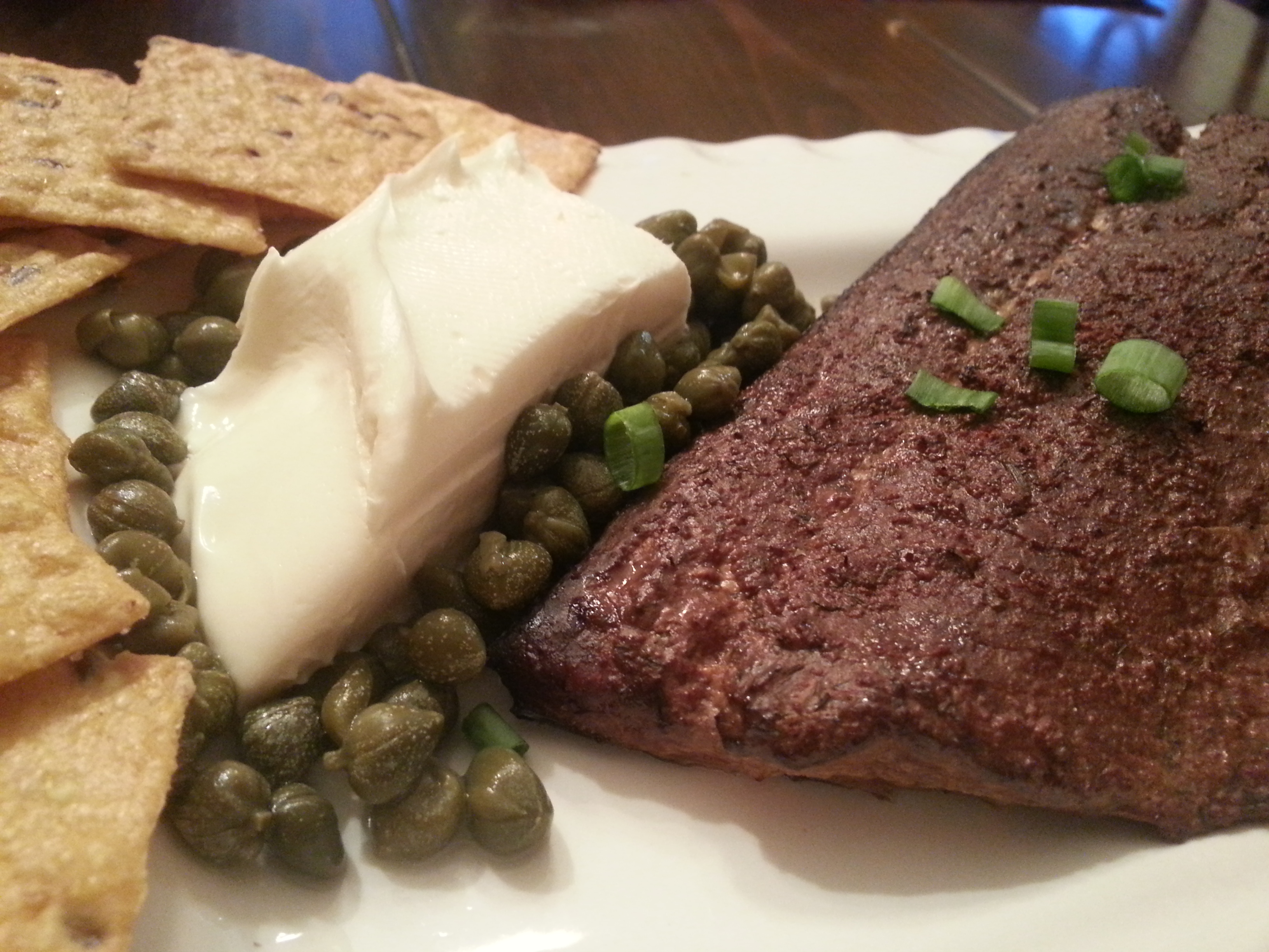 Serve from the plank or plate with capers, cream cheese and crackers.