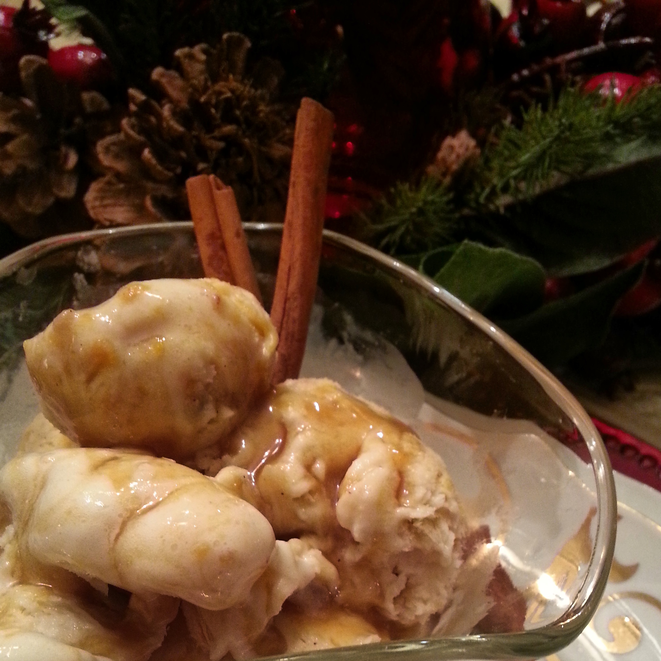 Once cooled, fold cobbler by cups into softened vanilla ice cream. Blend well. Place in containers and allow to refreeze overnight. Serve with drizzled caramel and extra cinnamon if desired.