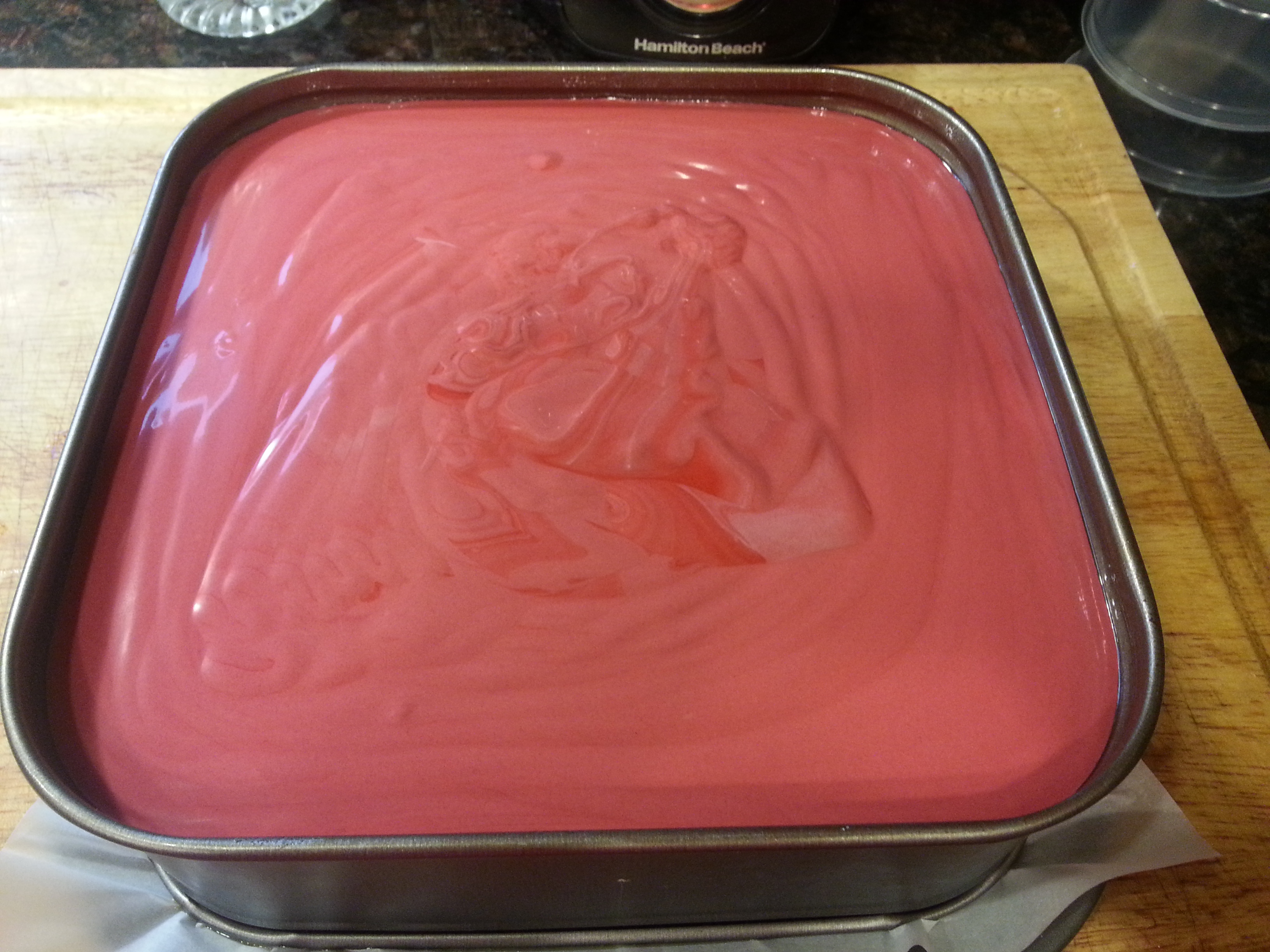 Grease 9″ springform pan well. Place a single layer of Angel Food cake int he bottom of the springform, cutting pieces to fit and cover the entire bottom of pan. Set aside.
