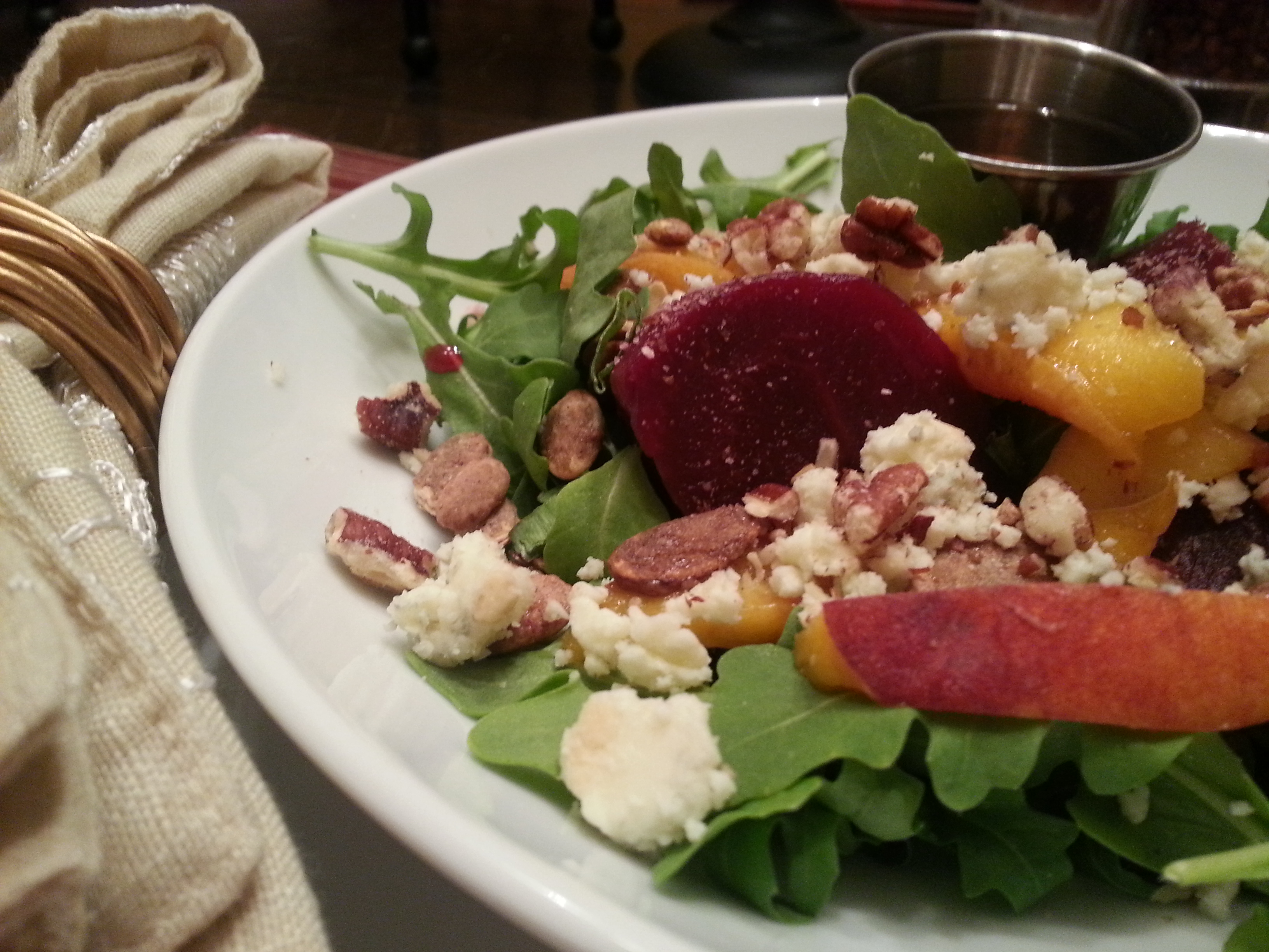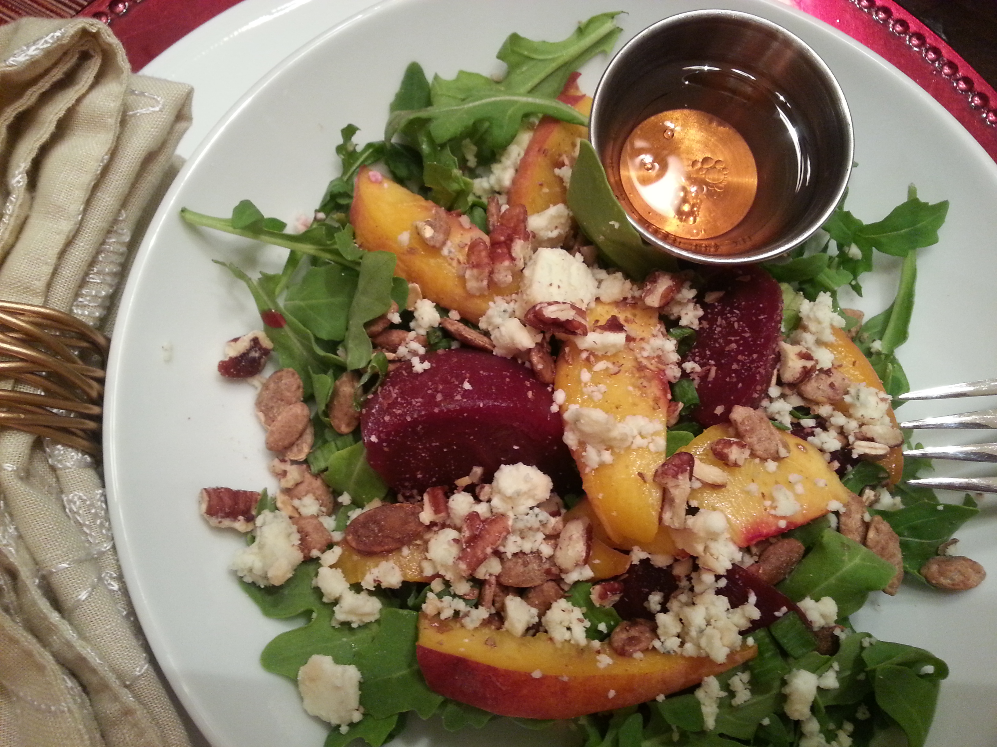Fresh Peach Salad with Balsamic Roasted Beets, Pecans and Bleu Cheese