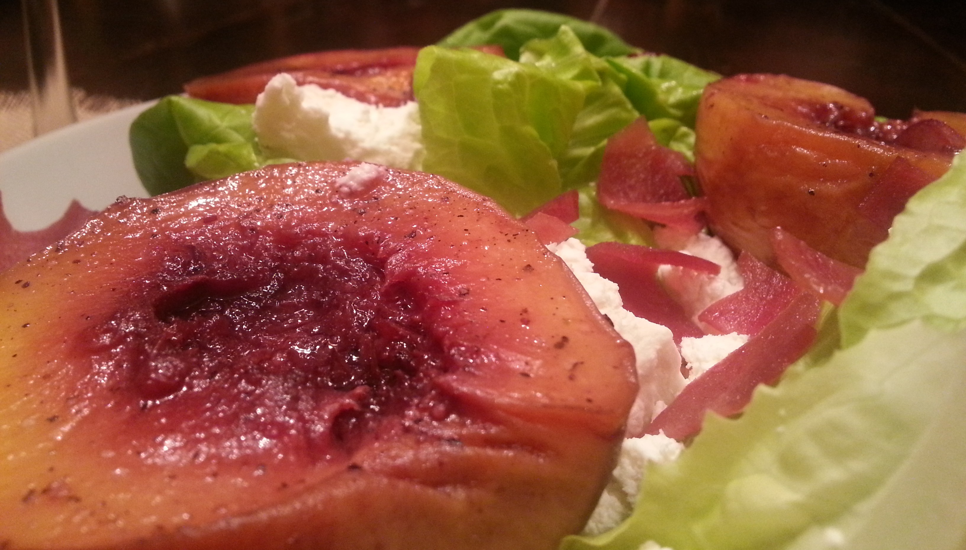 Brush cut side of peaches with bourbon and olive oil. Salt & pepper to taste. Place face down in a baking dish and roast peaches at 400 for about 30 minutes. You may remove skins or leave them on after roasting and the peaches have cooled.