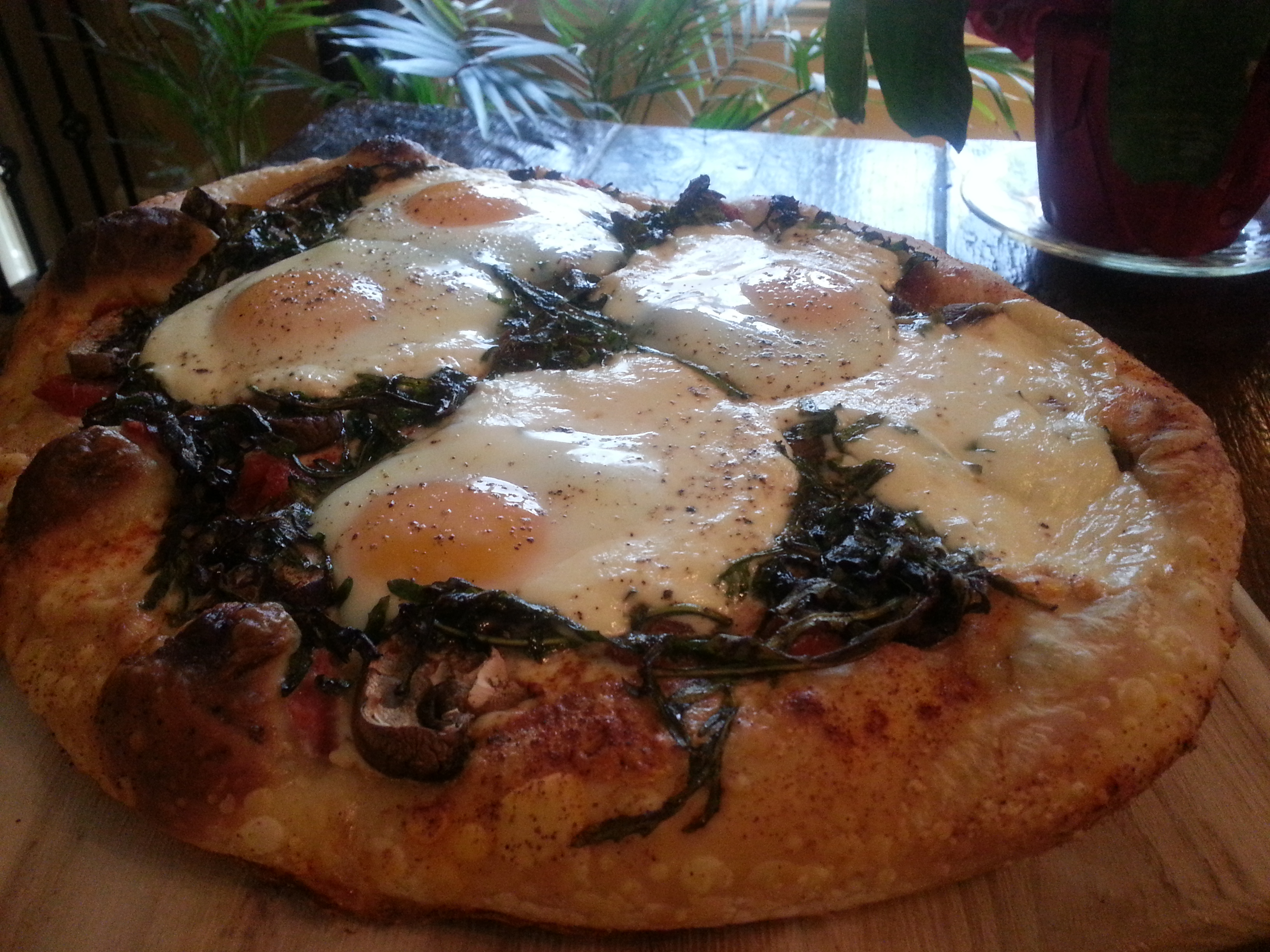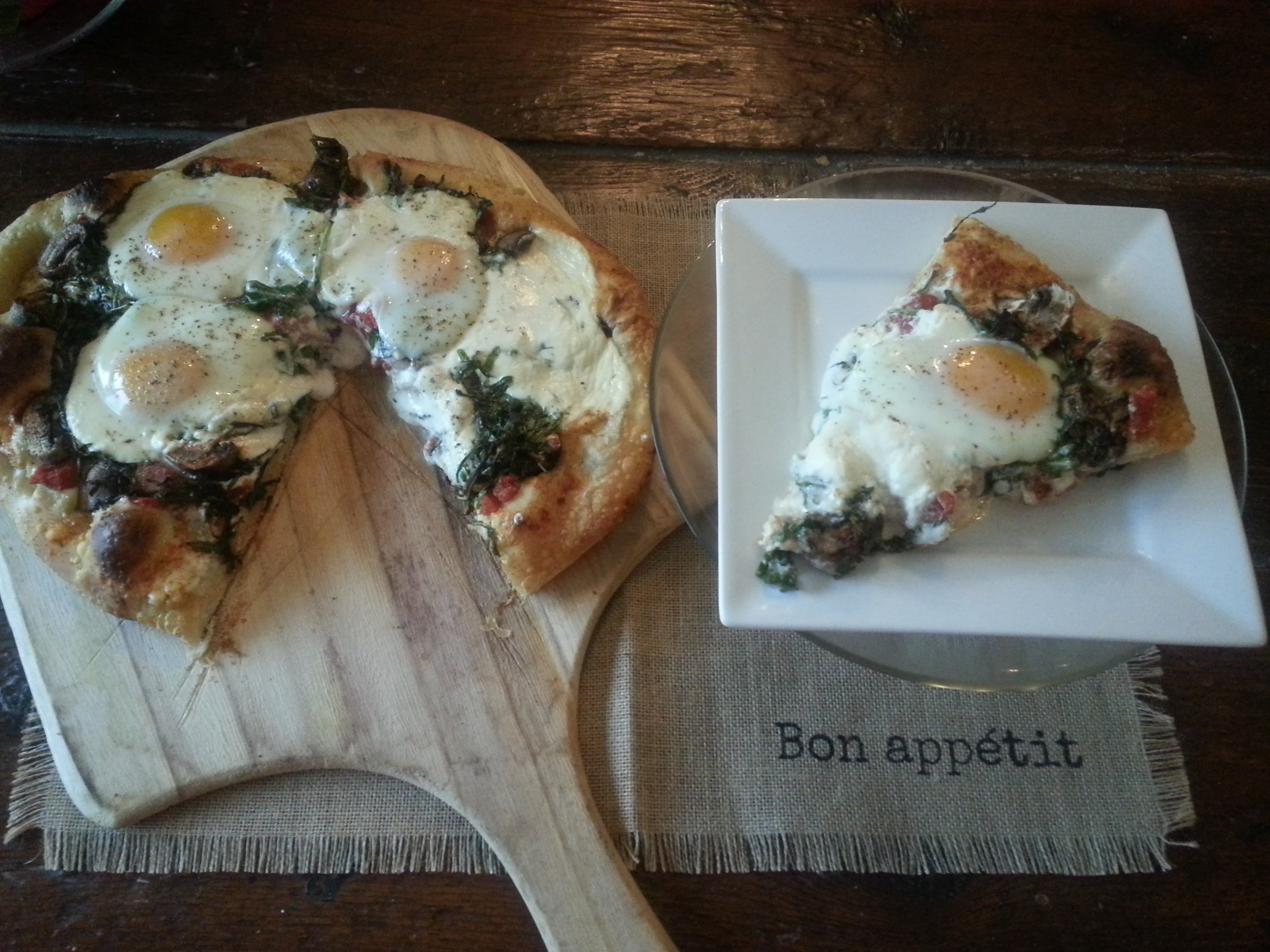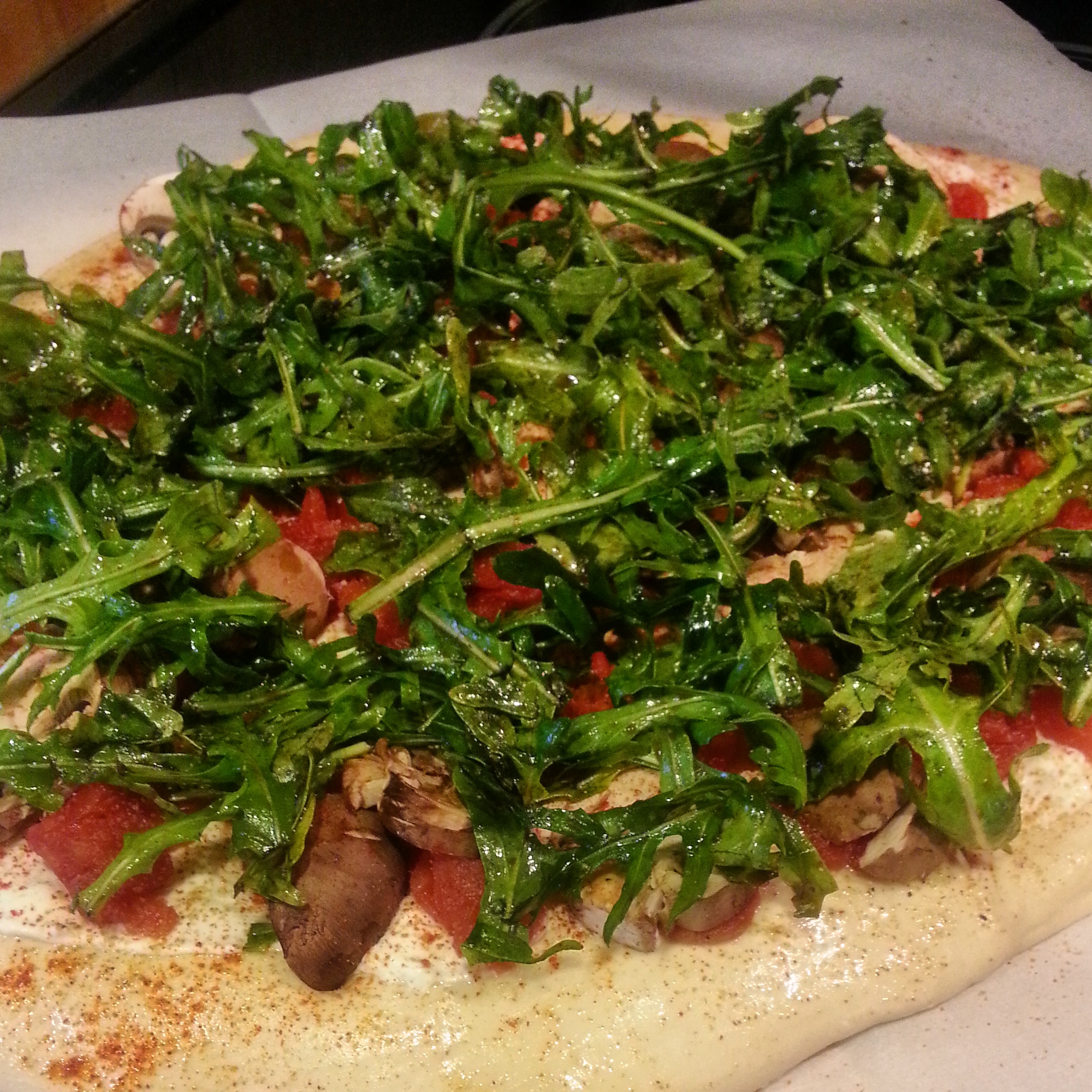 Marinated Arugula, Baby Bella & Sun Dried Tomato Breakfast Pizza