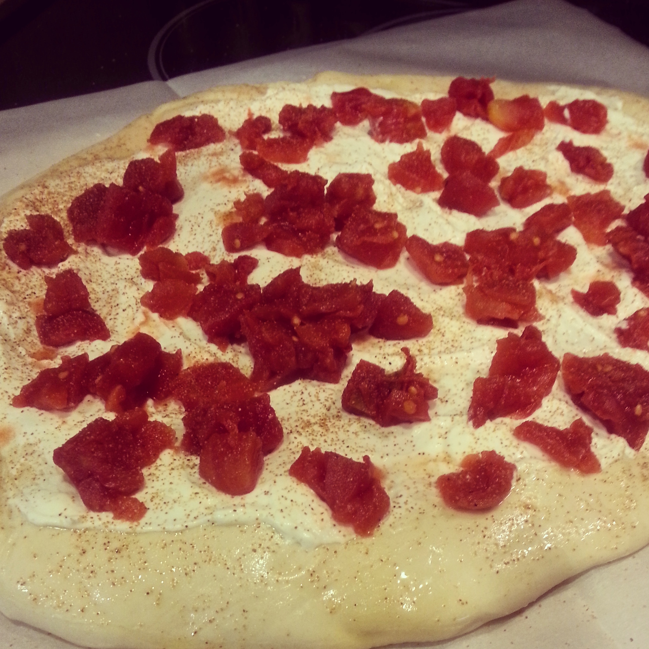 On a piece of parchment paper or floured surface, roll dough to preferred thickness. Keep in mind, dough will double in height when baked. Brush crust lightly with olive oil. Spread a layer of Ricotta cheese on the crust. Sprinkle with Paprika and Garlic, then top with tomatoes and mushrooms. Set aside.