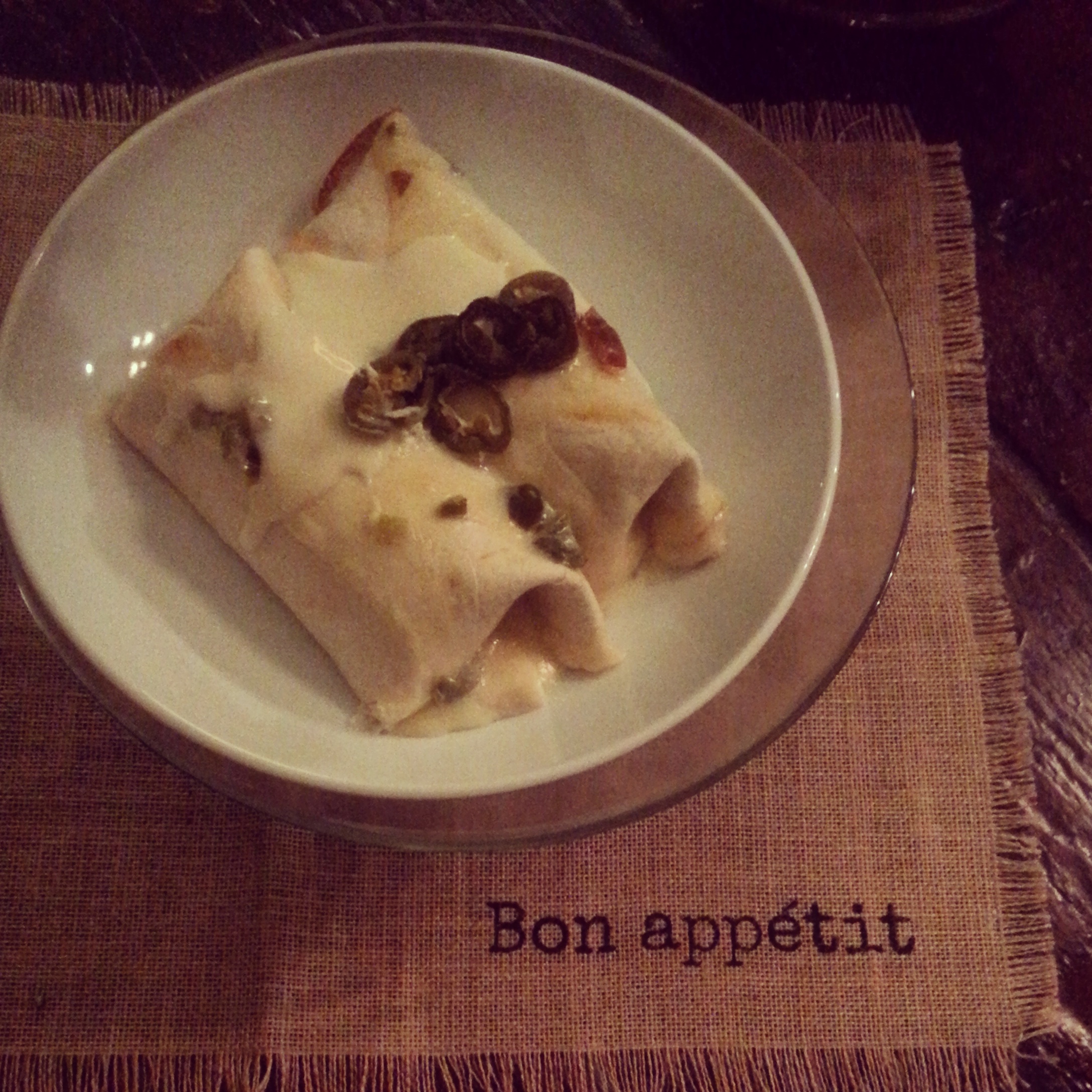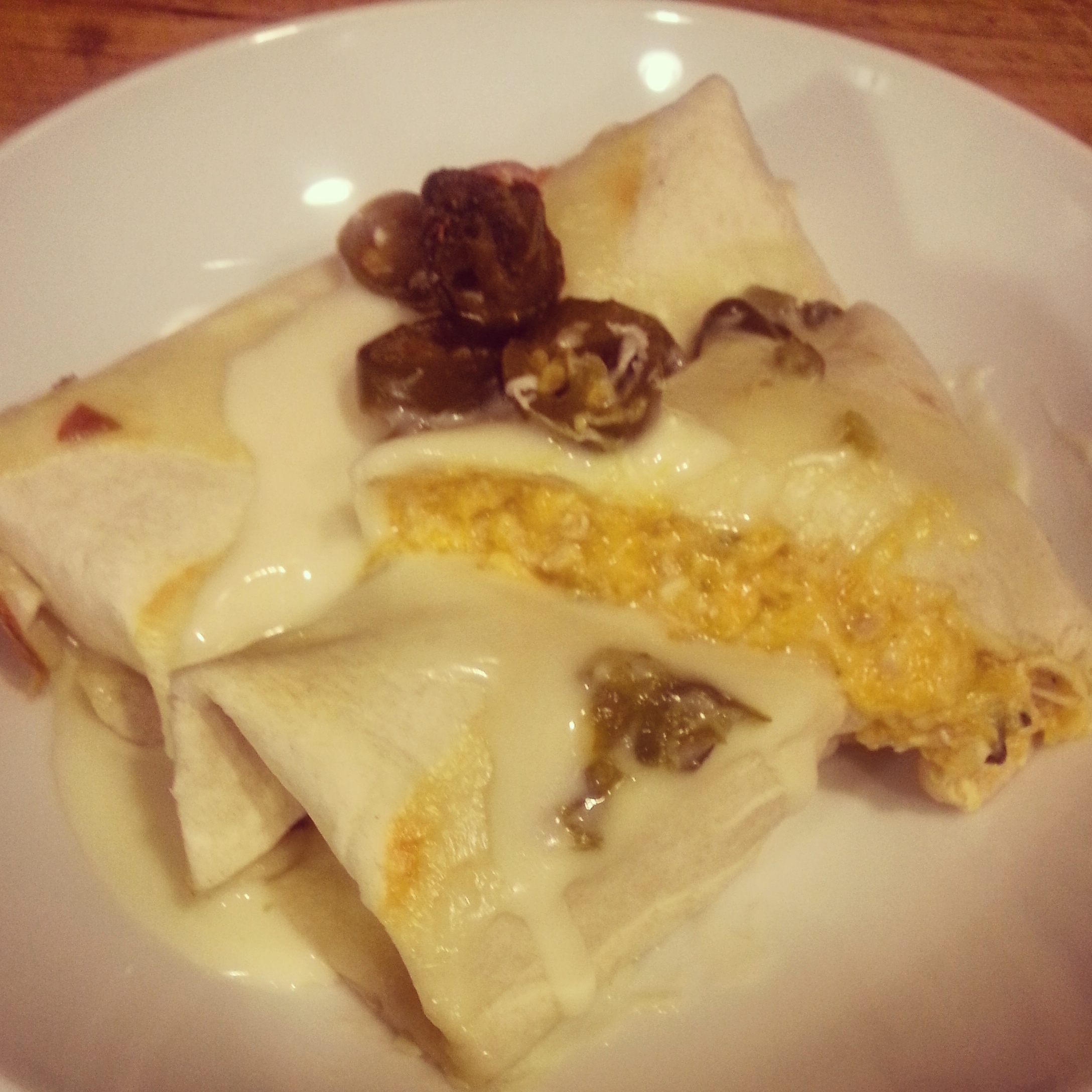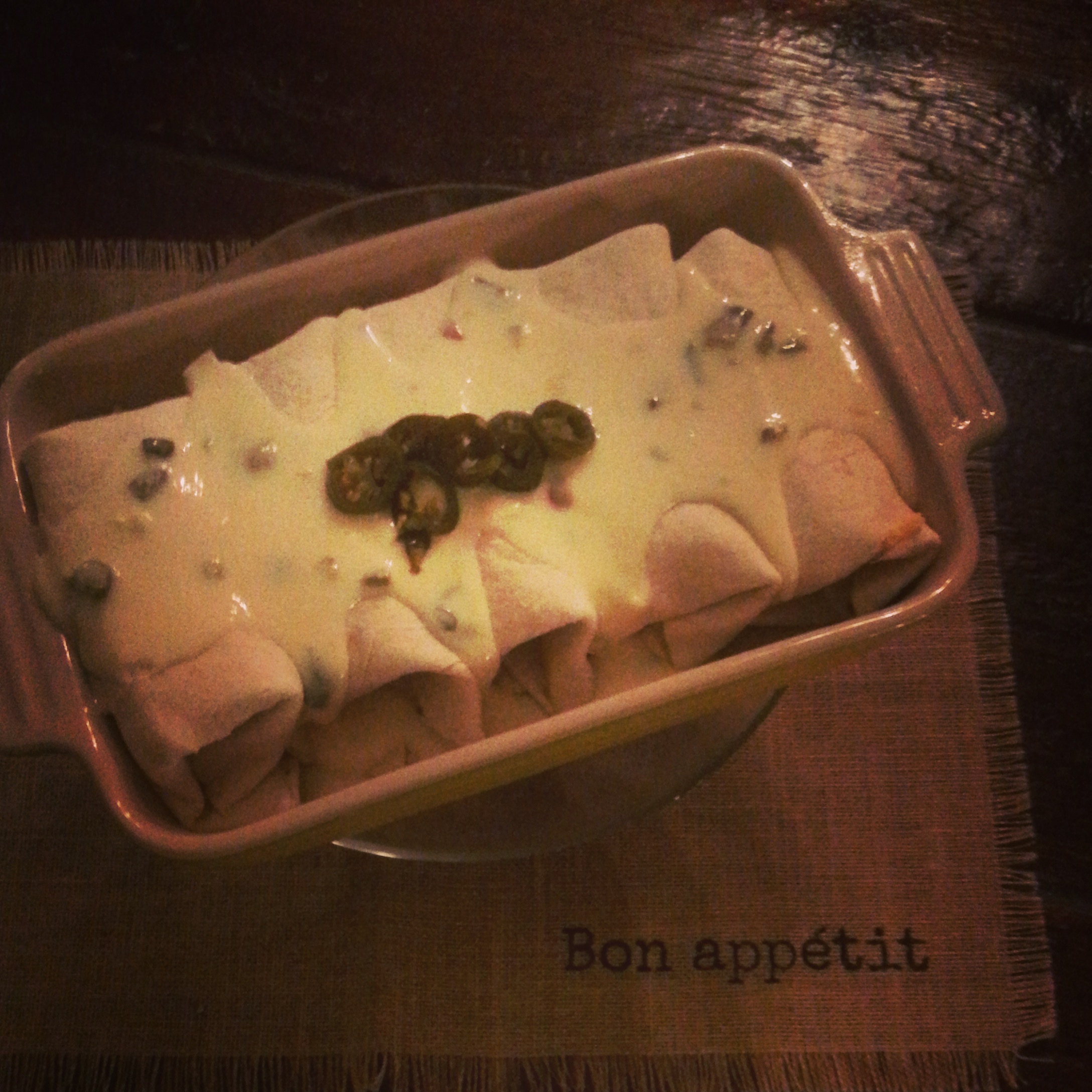 While the enchiladas are in the oven, place the Crema in a small pot on the stove. Add Jack cheese. Stir the cheese and Crema over low heat until the cheese has melted. Add sliced Jalapenos.