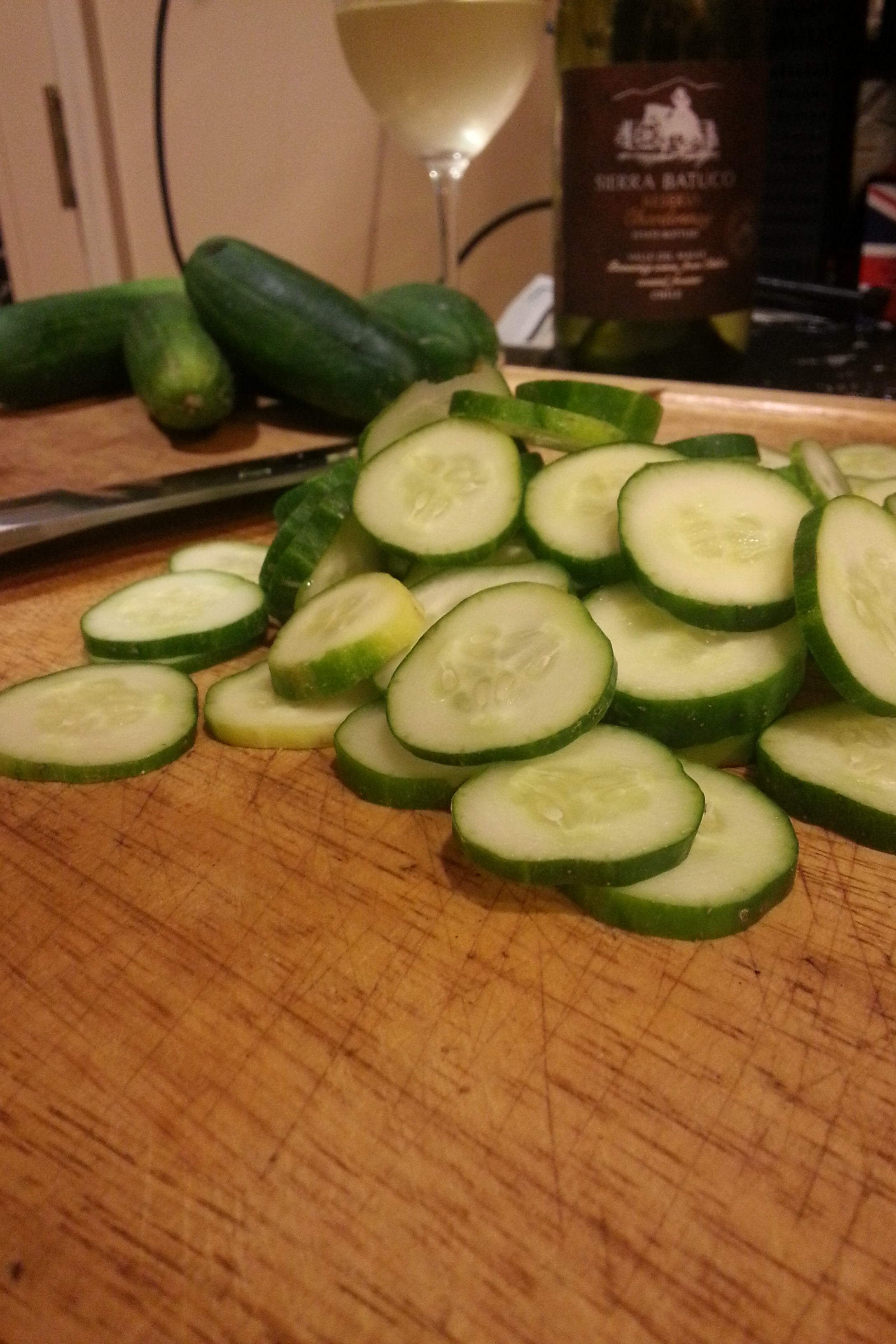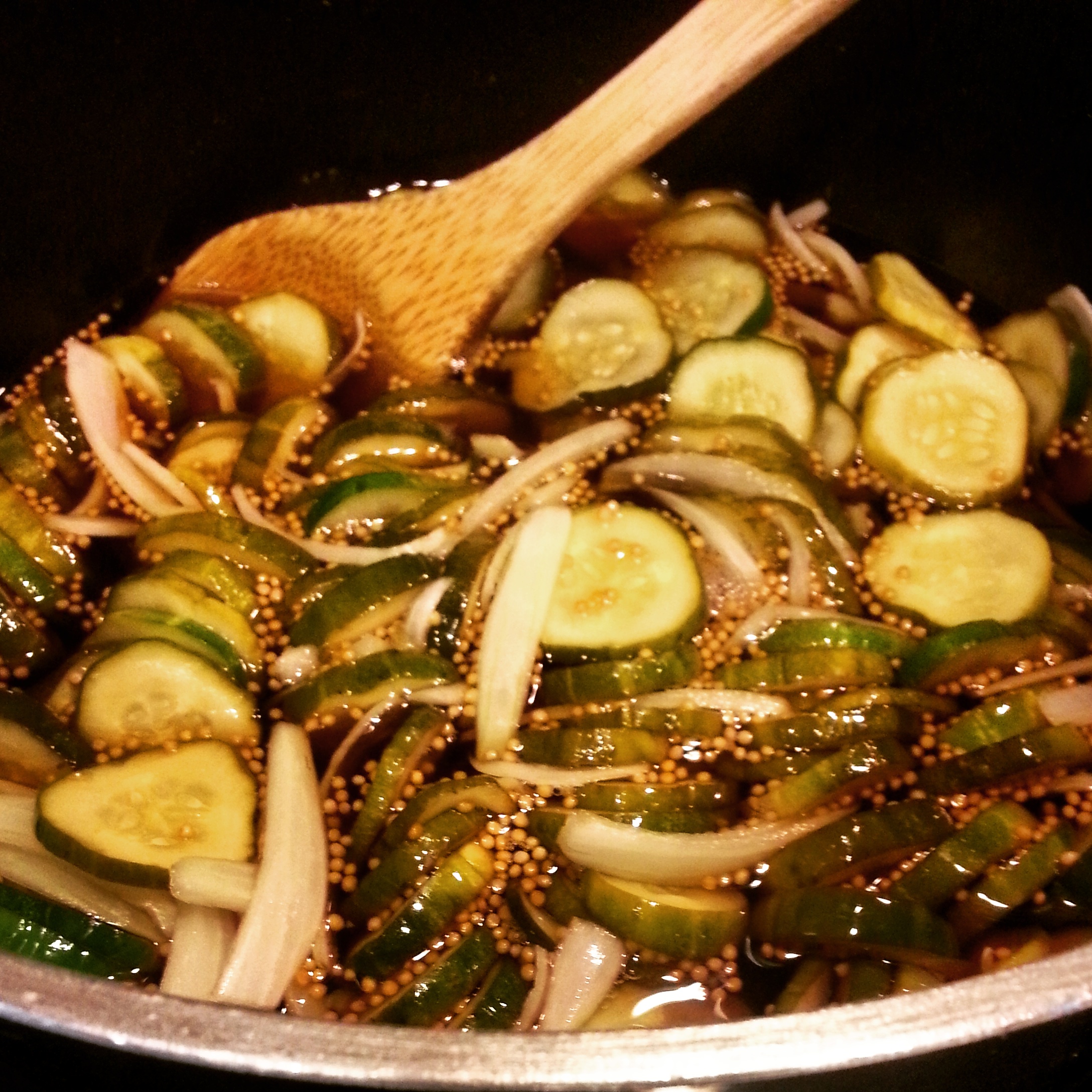 After allotted time, drain, rinse and drain again well. Set aside. In a large stock pot, add remaining ingredients. Add cucumber sand onions. Set on medium heat. Bring to a low simmer and remove immediately from heat. Do not allow this to come to a boil or your pickles could lose their crispness.
