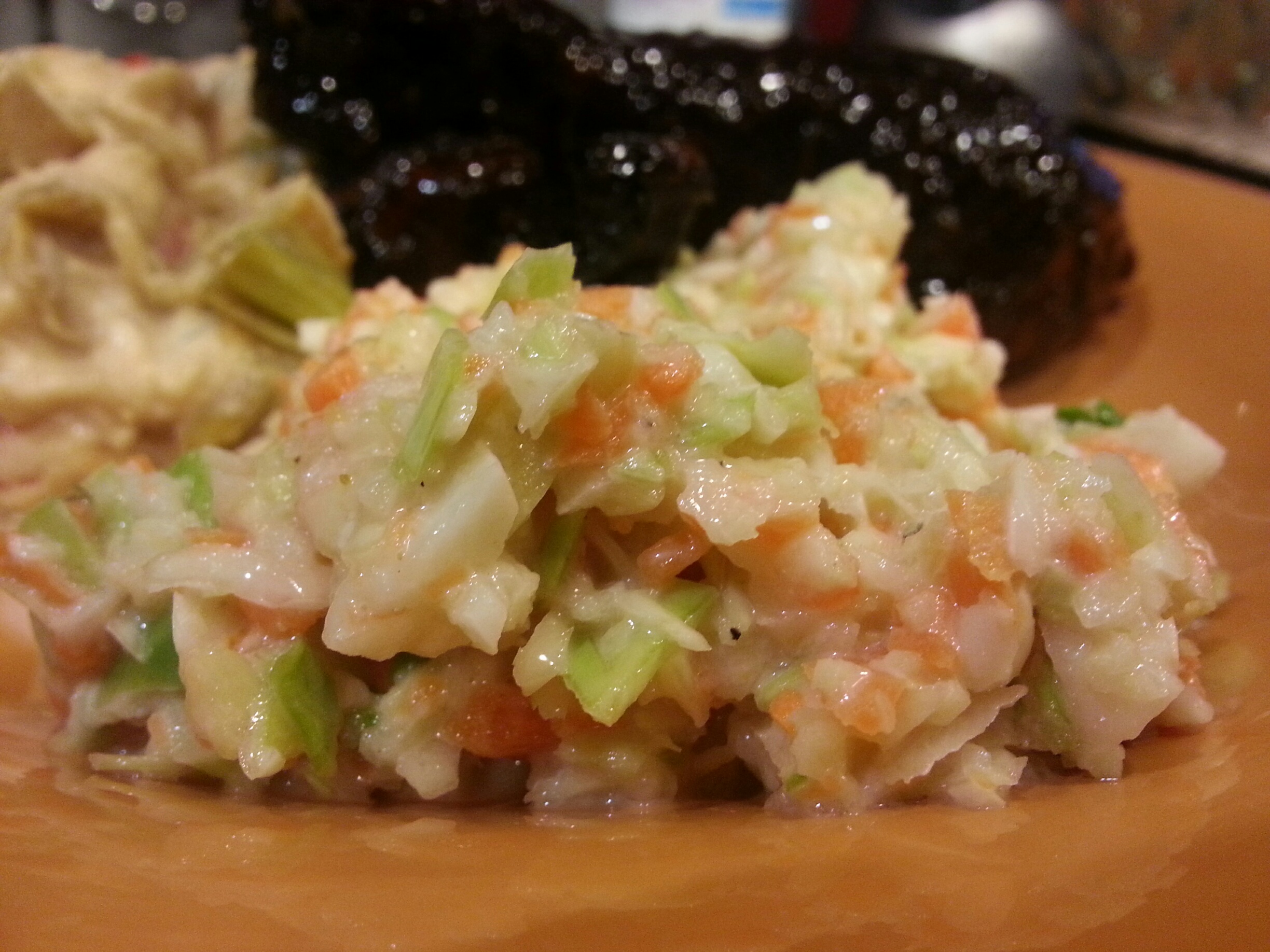 Prepare grill or smoker using applewood chips. Place both vegetables and dressing on smoker or grill, away from direct heat. We like to use Applewood chips for this slaw. Allow to smoke about 15-20 minutes, but do not allow vegetables to cook. Remove both items from grill. Toss dressing with slaw, then cover and refrigerate until well chilled.