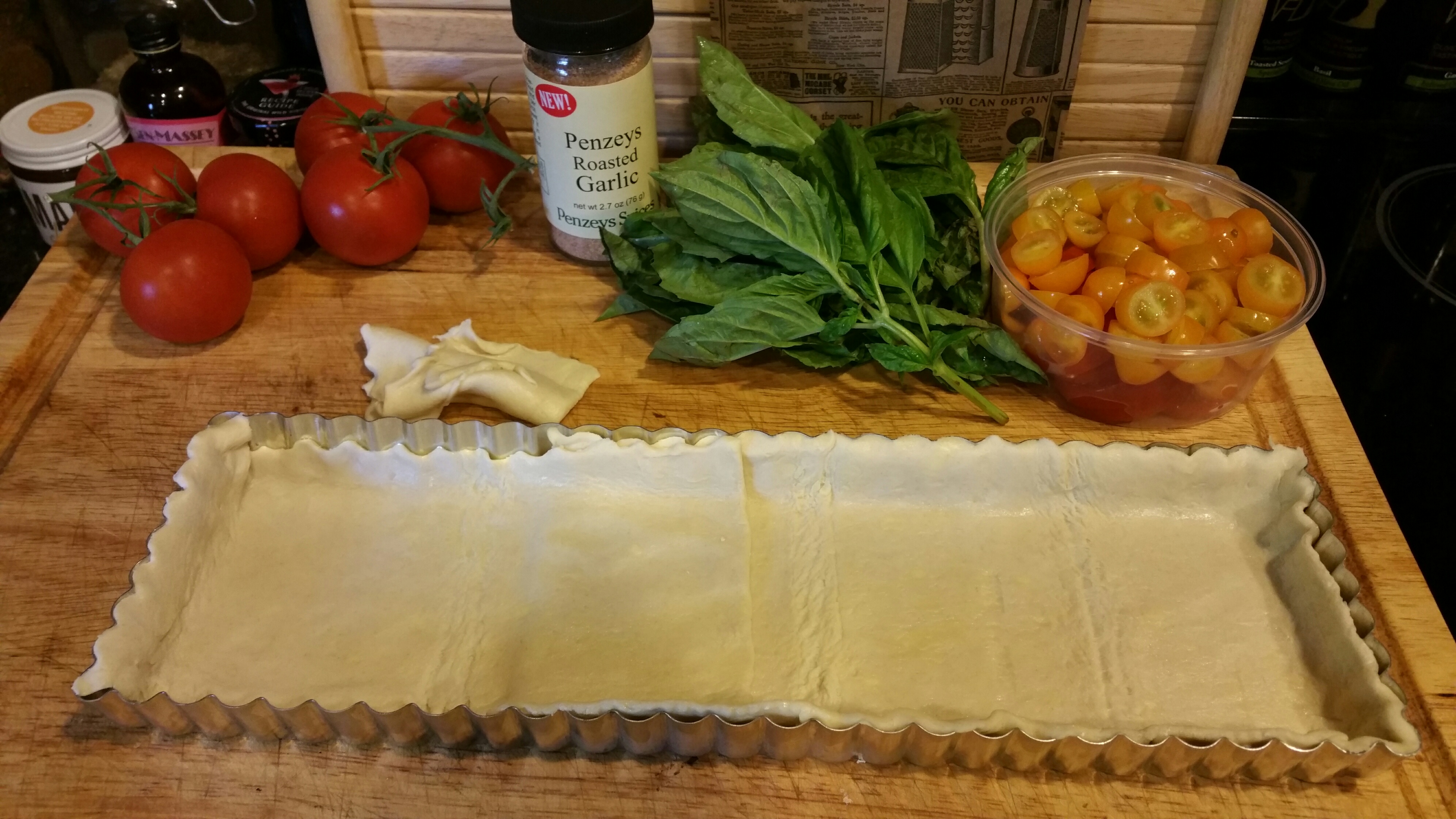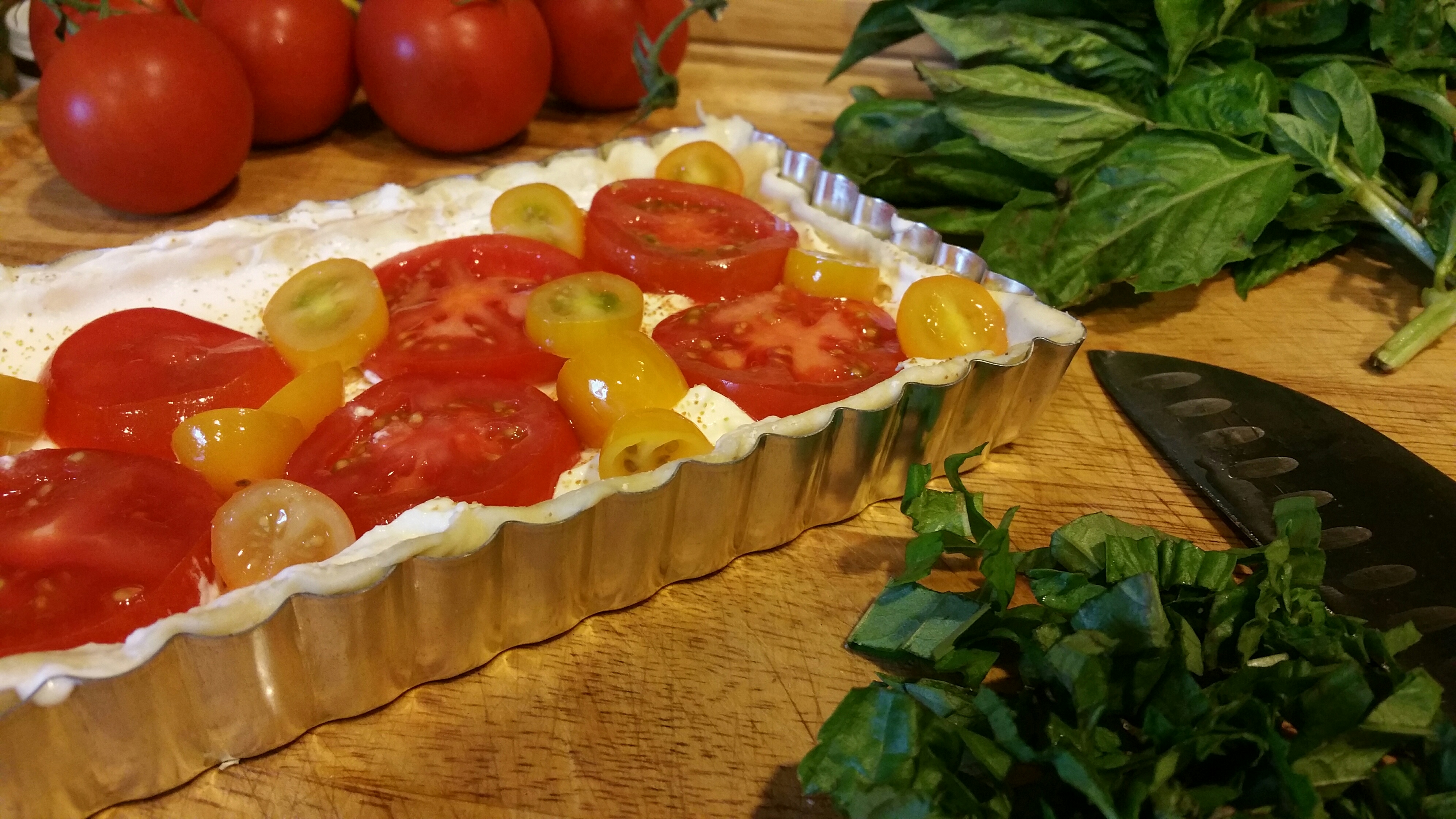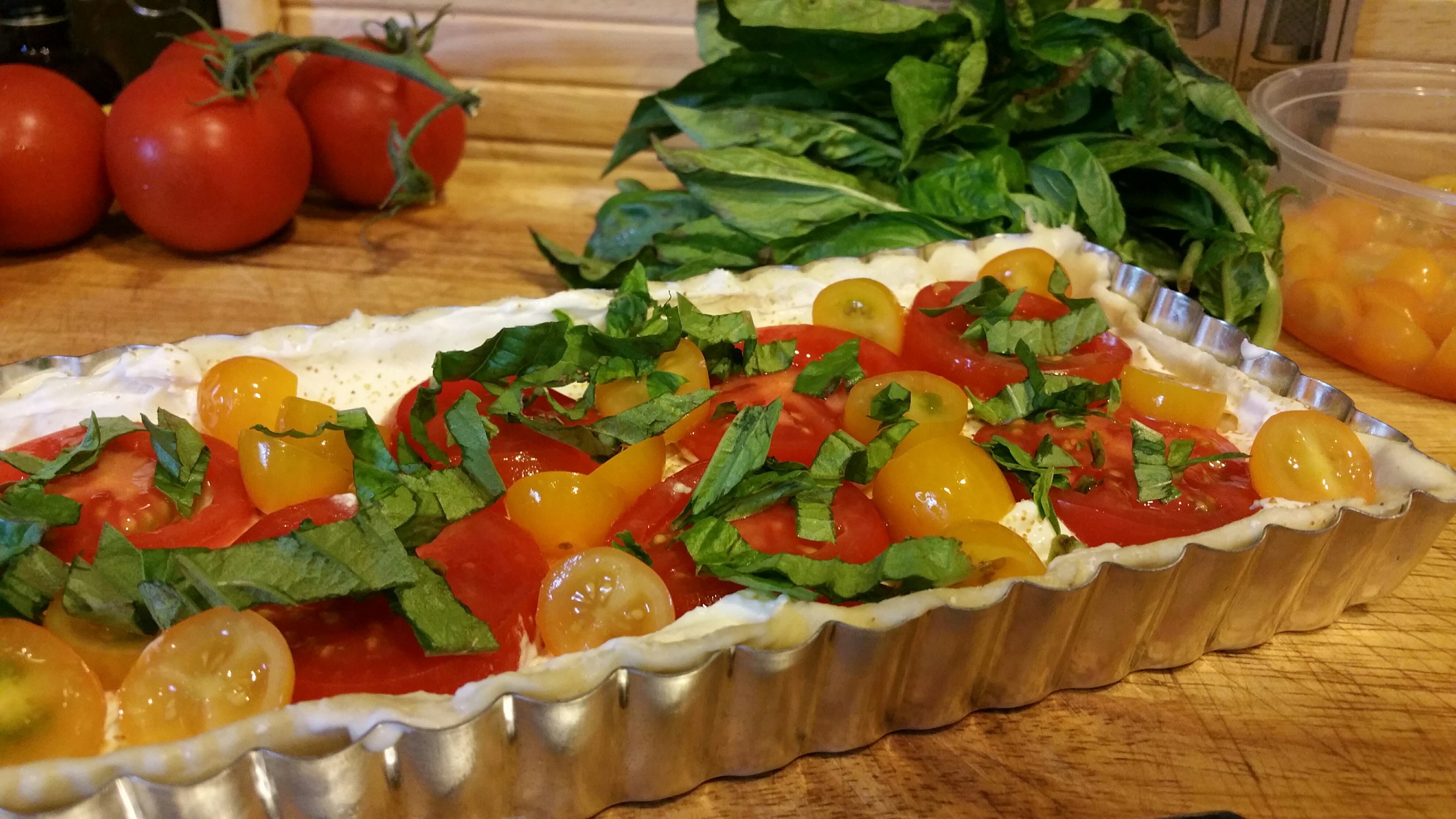 Roll out pastry dough, rolling 1/2 tsp. Saffron in to dough. Fit dough in a greased tart pan or pie dish. Fill with Ricotta. Top with remaining Saffron. Cover with sliced tomatoes, then with garlic and Basil. Bake at 400 degrees for about 30 – 40 minutes or until top has begun to brown.