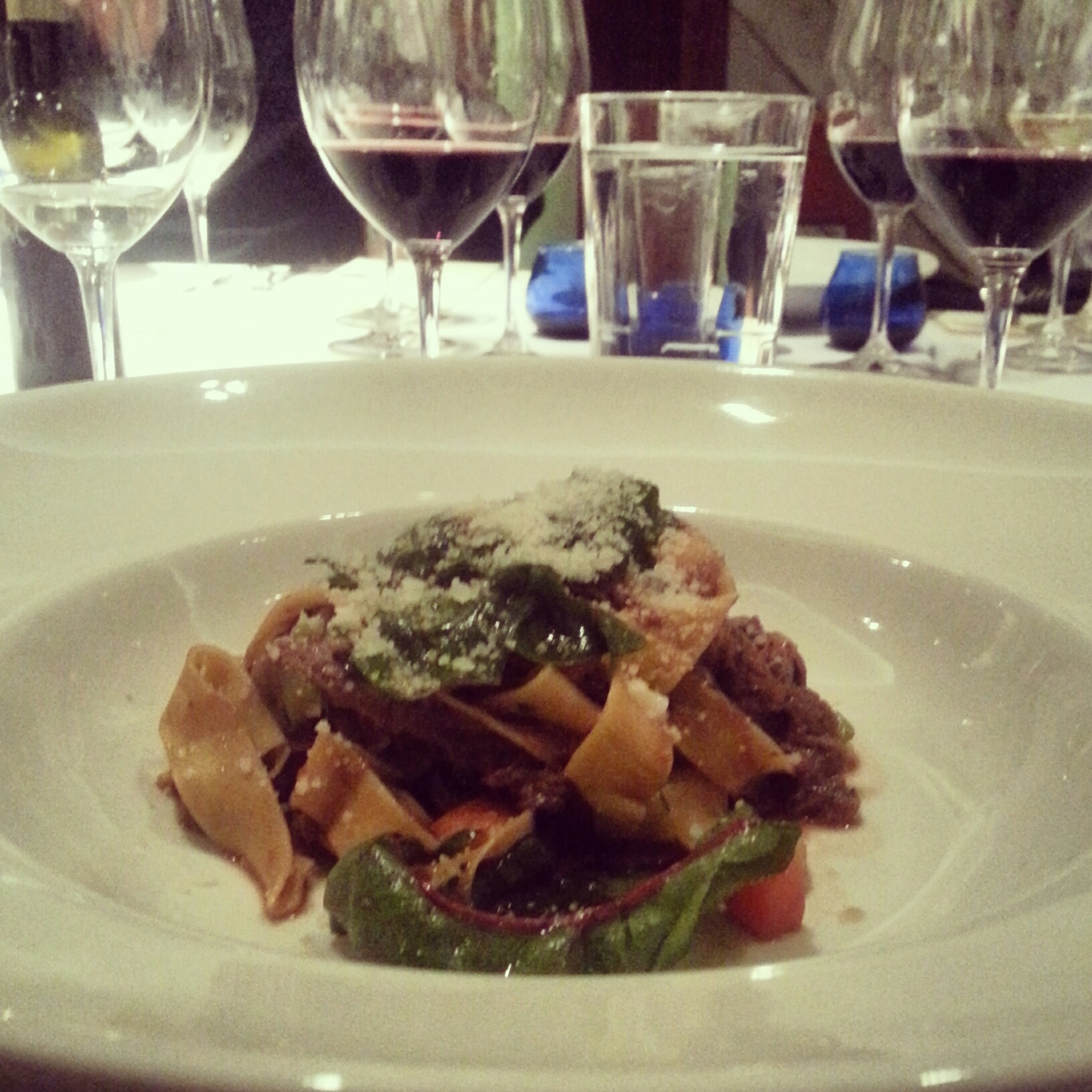 We began with Crudo of Maine Diver Scallop expertly prepared with Round Pond’s Meyer Lemon Olive Oil and paired with a crisp 2014 Rutherford Sauvignon Blanc. The wine had gorgeous peach undertones and would be an excellent choice for a light summer meal on the patio.