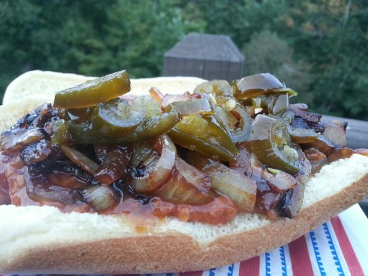 Click Here For Recipe: It doesn’t get any more American | Grilled Cheddar Hot Dogs with Hard Cider Onions and Candied Jalapenos (Jalopy Jelly).