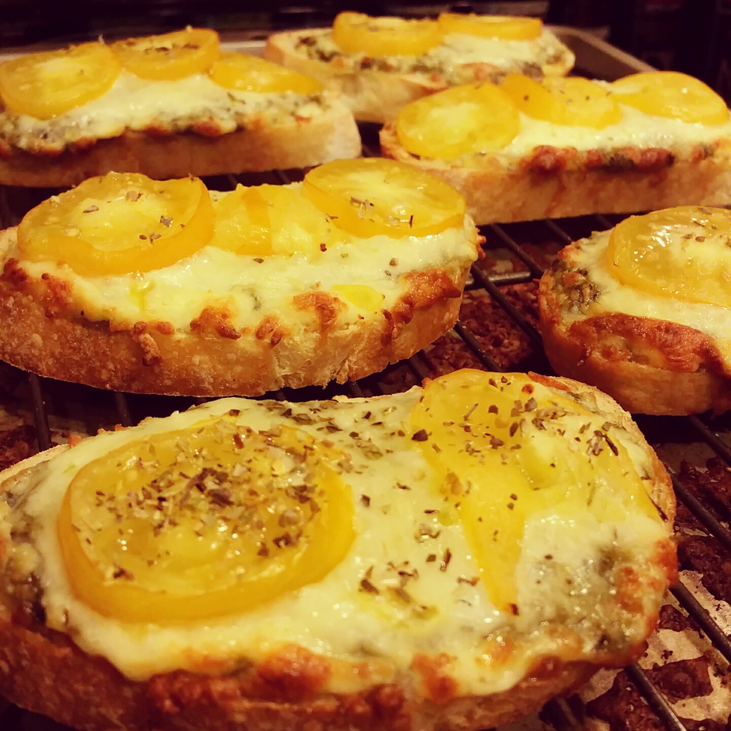 This particular Bruschetta is topped with Pesto, Mozzarella and gorgeous vine-ripened, golden tomatoes. It’s light enough for a snack and hearty enough for an appetizer, so I’d wager this is a perfect Snack-i-tizer!