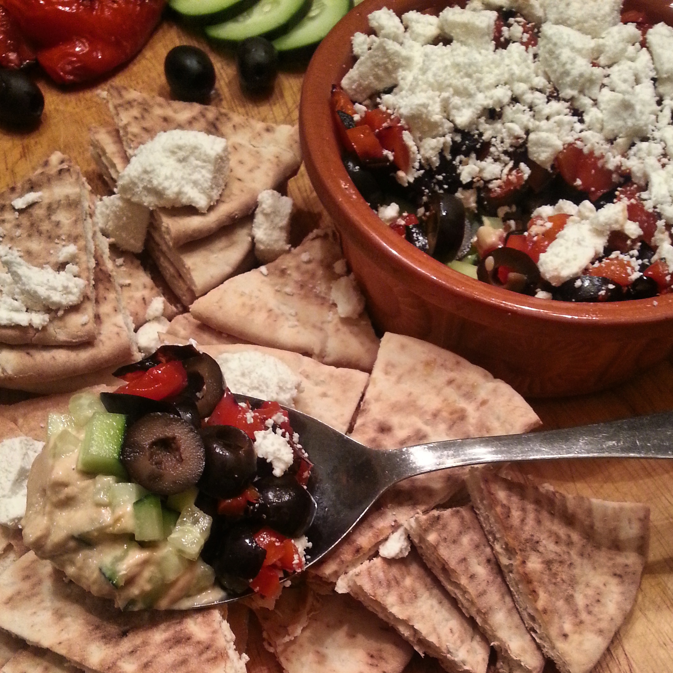 Place hummus in a bowl. Top with remaining ingredients (except pita wedges and sliced cucumber) in layers ending with balsamic tomatoes and Feta. Drizzle with olive oil and serve with pita wedges and sliced cucumber.