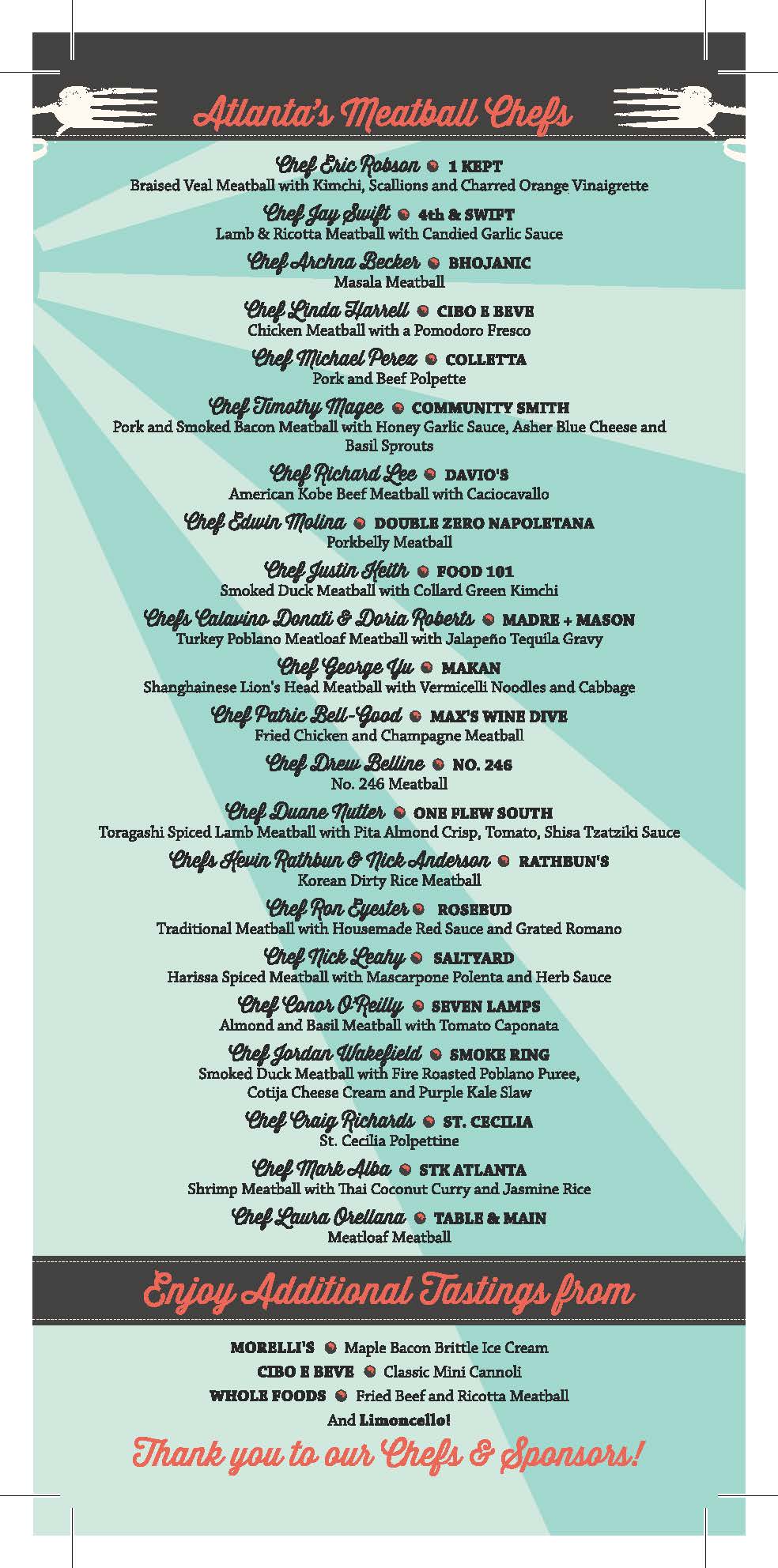 “We love any chance to showcase our incredible restaurants and local chefs’ talents, and the Atlanta Meatball Festival does just that!” said Dale DeSena, founder of the Atlanta Meatball Festival, TasteATL and Taste of Atlanta. “Our city’s chefs share a real sense of culinary camaraderie, and hosting a little friendly competition makes the event even more fun for everyone. Whether they’re showing off macho meatballs stuffed with beef and seafood or modified vegetarian versions, there will be a winning recipe for everyone to enjoy!”