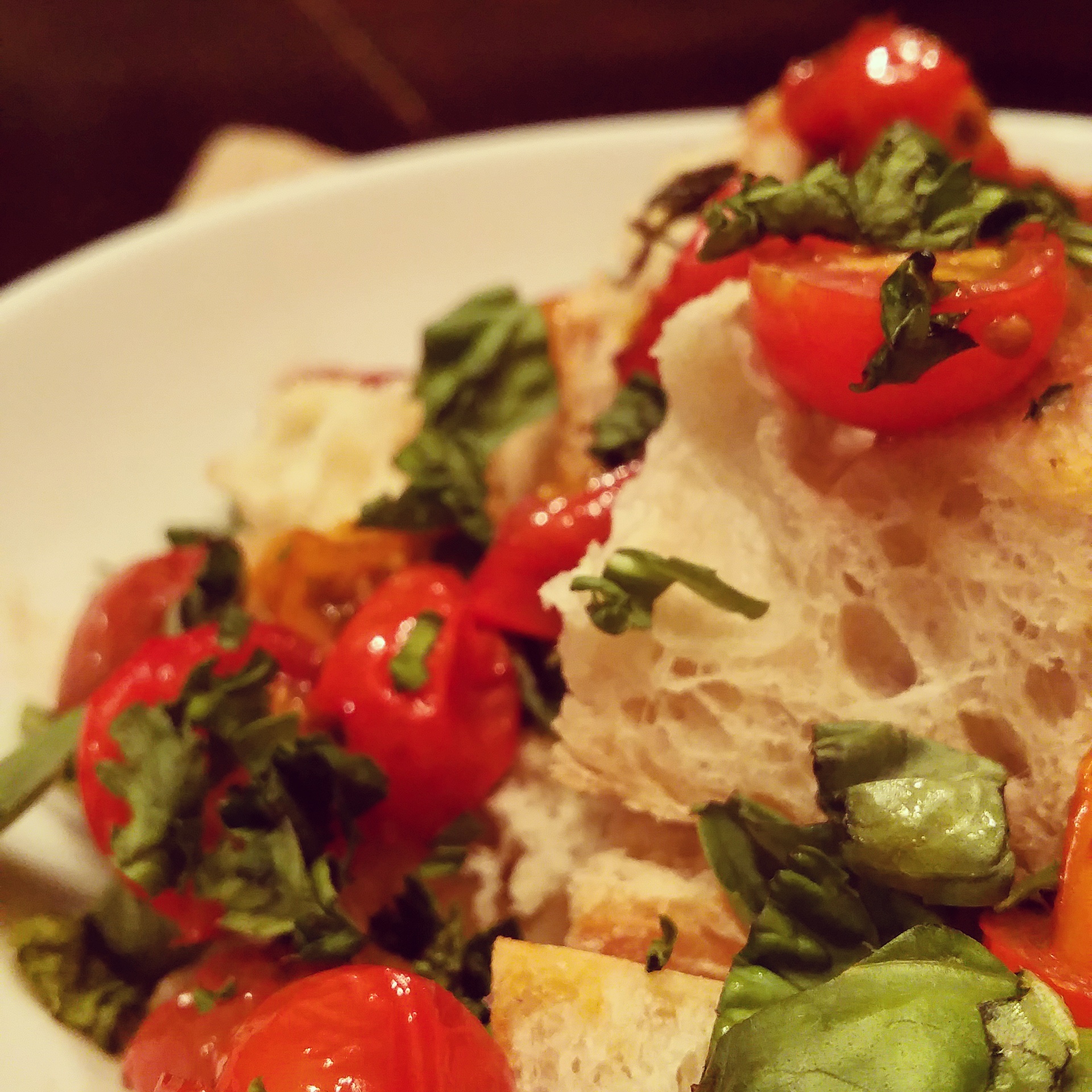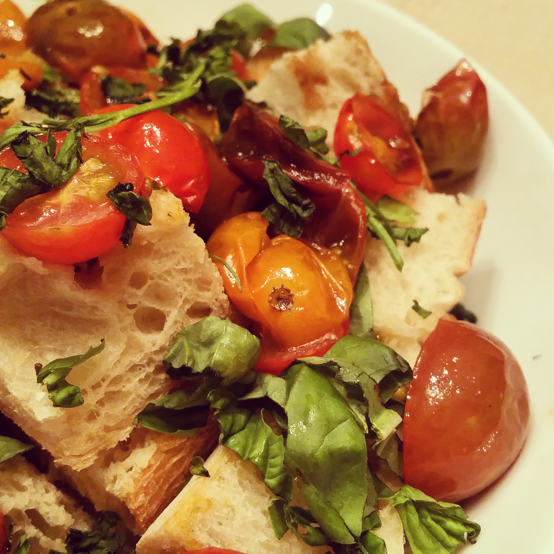 ** This can also be prepared on the grill by adding bread to a grill basket for toasting and blistering tomatoes in a foil packet. This is a neat way to prepare the salad as it adds just a hint of smokiness to the flavor. **