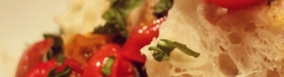 This particular Panzanella was created with a few slices of leftover French bread, a scant handful of cherry tomatoes, a few leaves of fresh Basil, leftover chopped Parsley, some onion, balsamic vinegar and a drizzle of good olive oil. See what I mean? All you have to have for this is leftovers and remnants. Maybe we should call this carpet salad.