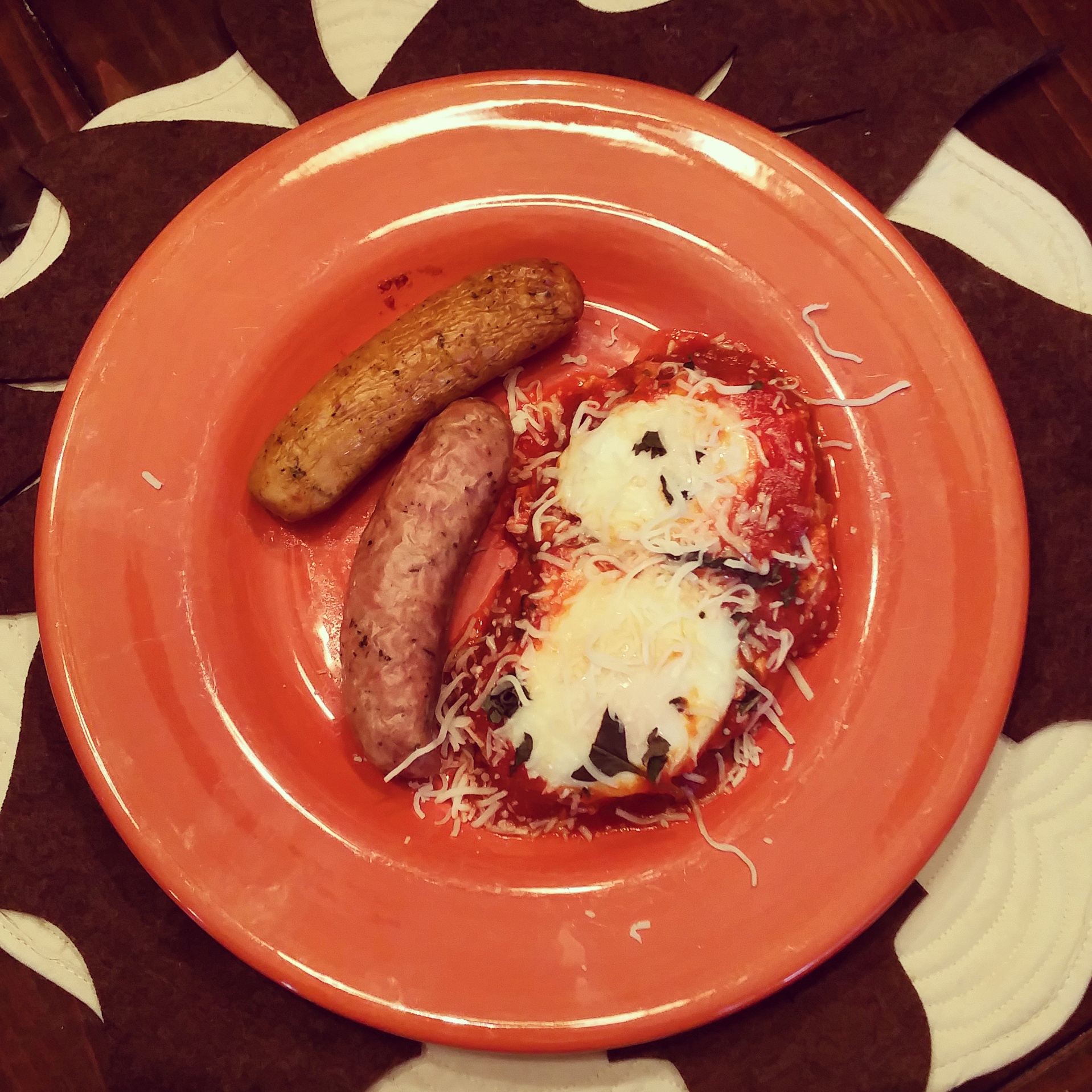 *If you prefer eggs more well cooked, you can cook them to your preference, then serve according to directions. If you would like additional protein, you can add cooked ground Italian Sausage to the marinara for a very filling breakfast.