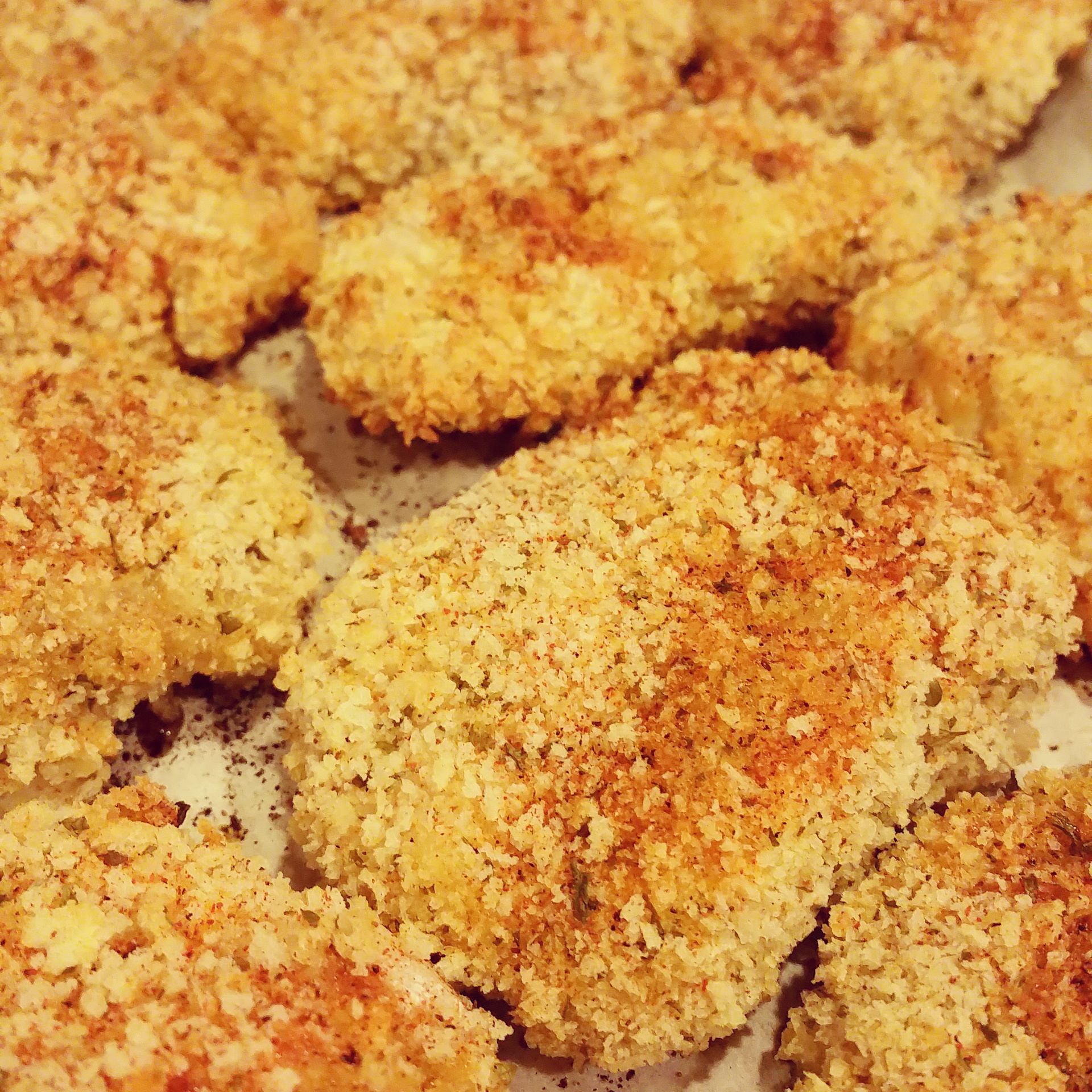 Remove chicken from Buttermilk and drain. Dredge each piece of chicken in flour first coating all sides, and shaking off excess flour. Next, dip each piece in the egg wash. Then place in the bag of Panko and gently shake to coat. Make sure each piece is WELL COATED with the Panko. Place each piece onto a greased baking sheet. Sprinkle with additional Smoked Paprika.