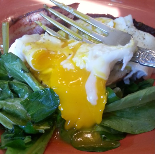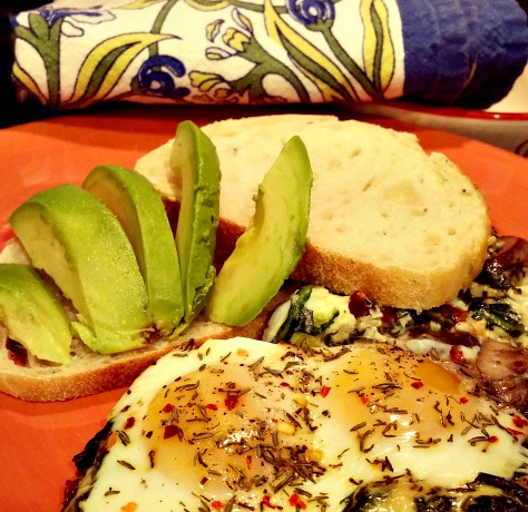 Place toasted bread slices in a greased 8×8 baking dish. Using the back of a spoon, form wells into the spinach mixture. Gently crack one egg into each well. Bake at 350 for 10-12 minutes or until egg whites are opaque. Serve with sliced avocado and toast.
